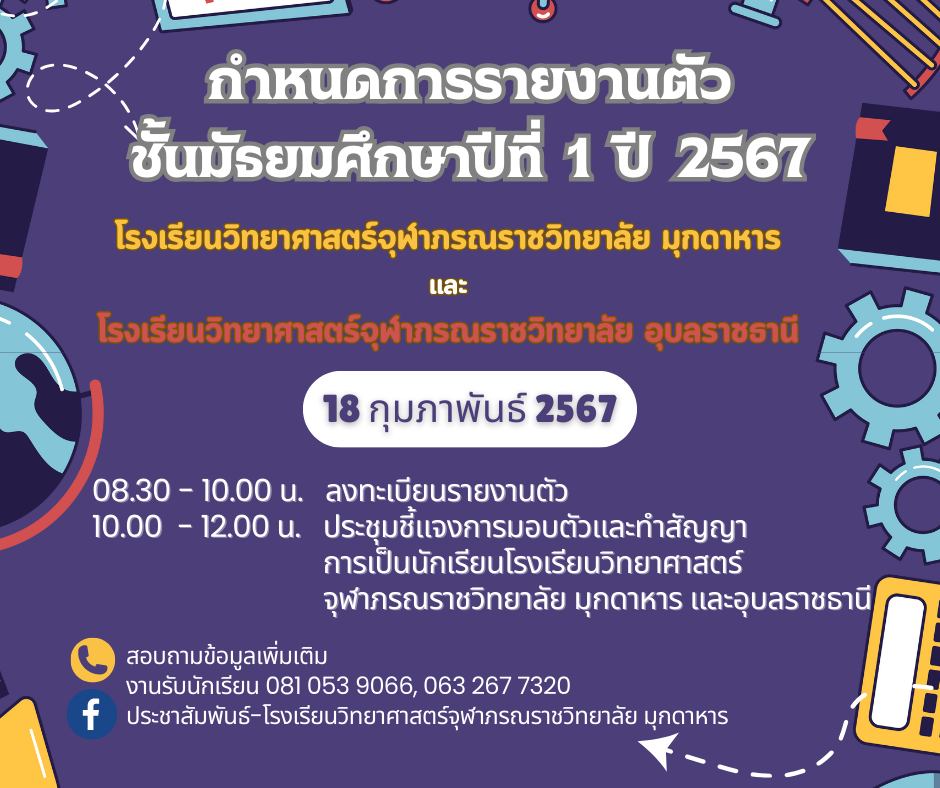 ขอให้นักเรียนที่ยืนยันสิทธิ์การเข้าเรียนโรงเรียนวิทยาศาสตร์จุฬาภรณราชวิทยาลัย มุกดาหาร และโรงเรียนวิทยาศาสตร์จุฬาภรณราชวิทยาลัย อุบลราชธานี มามอบตัวและทำสัญญาในวันอาทิตย์ที่ 18 กุมภาพันธ์ 2567 ณ หอประชุม โรงเรียนวิทยาศาสตร์จุฬาภรณราชวิทยาลัย มุกดาหาร