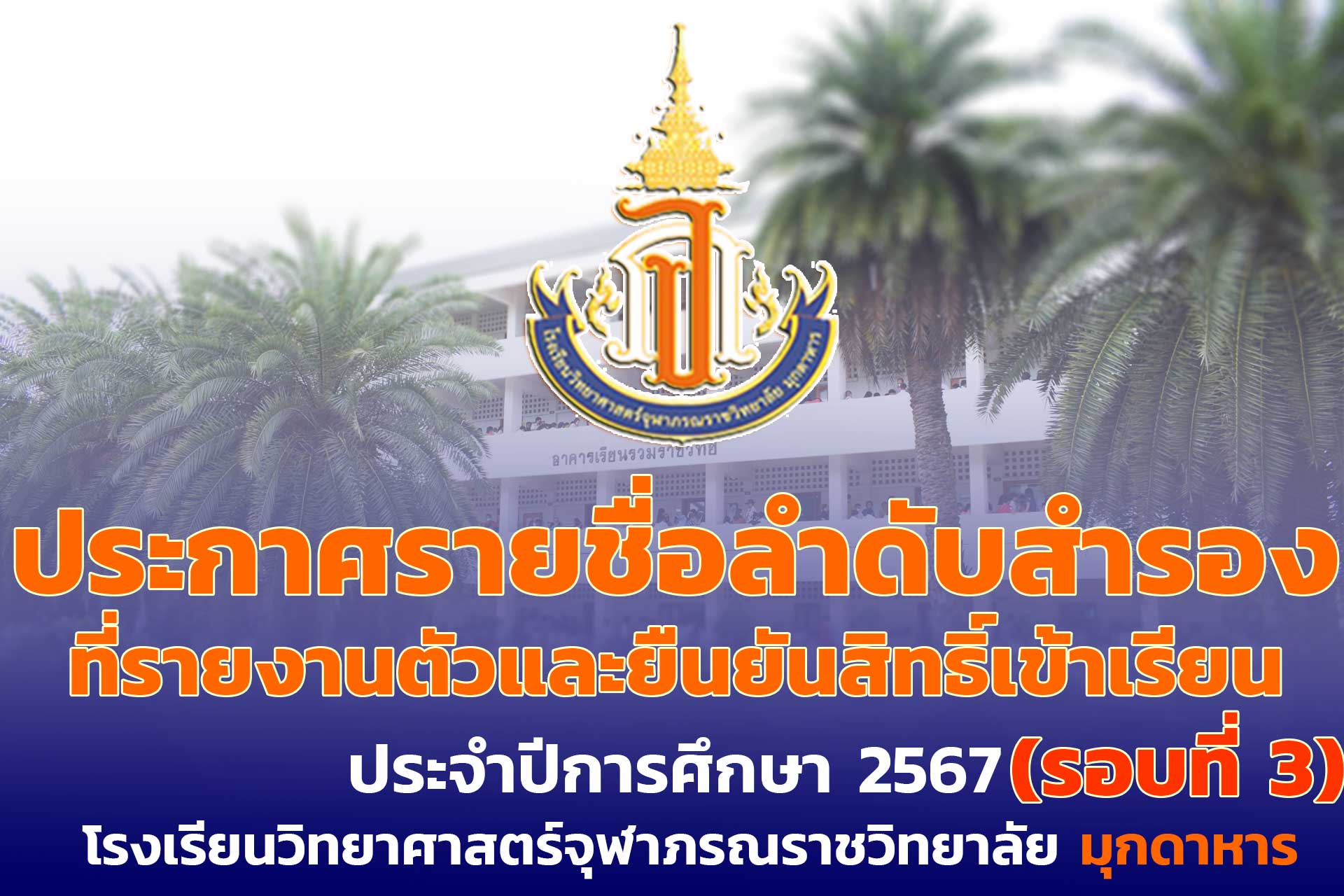 ประกาศรายชื่อลำดับสำรองที่รายงานตัวและยืนยันสิทธิ์การเข้าเรียน โรงเรียนวิทยาศาสตร์จุฬาภรณราชวิทยาลัย มุกดาหาร ปีการศึกษา 2567 (รอบที่ 3)