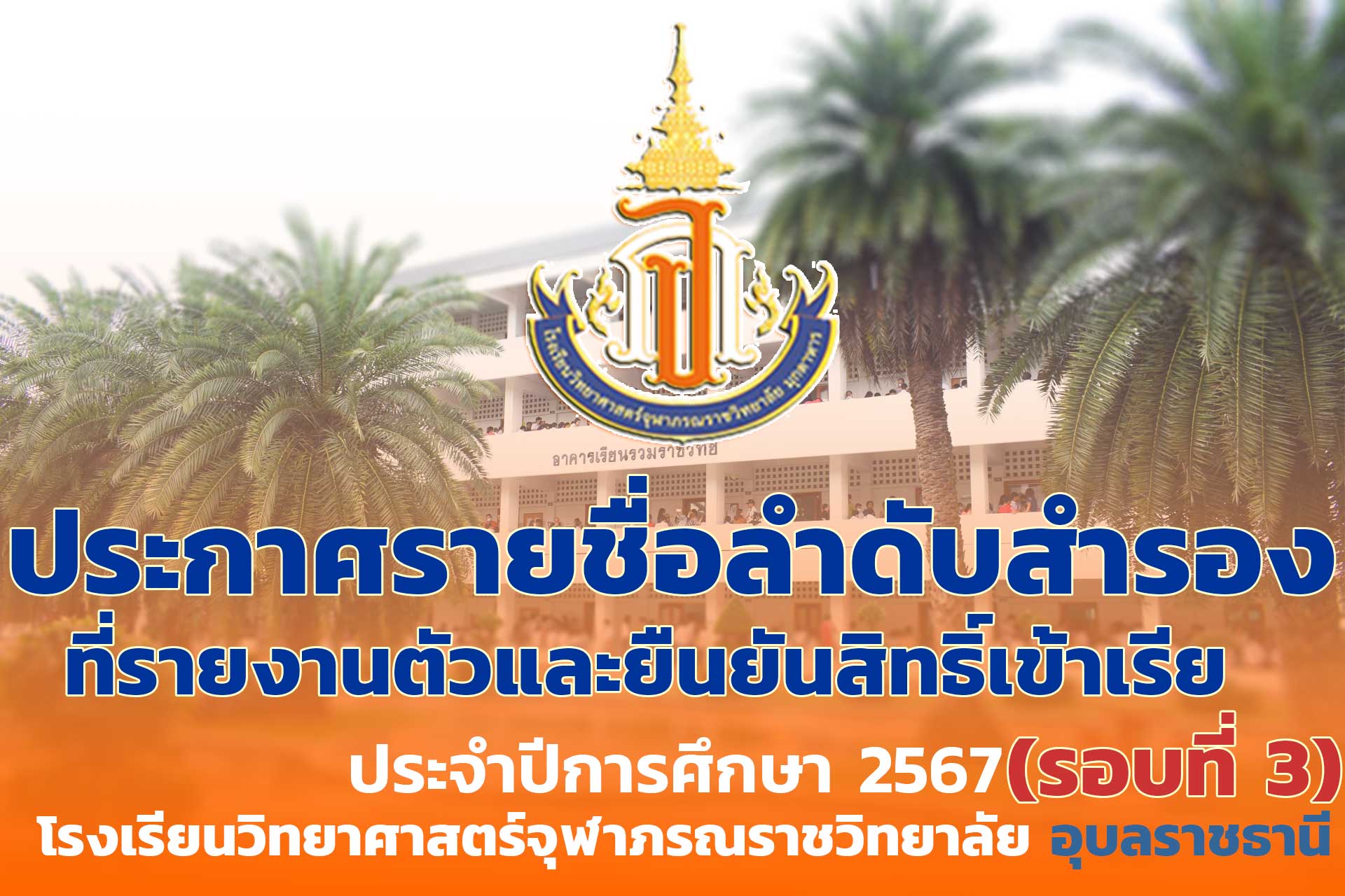 ประกาศรายชื่อลำดับสำรองที่รายงานตัวและยืนยันสิทธิ์การเข้าเรียน โรงเรียนวิทยาศาสตร์จุฬาภรณราชวิทยาลัย อุบลราชธานี ปีการศึกษา 2567 (รอบที่ 3)