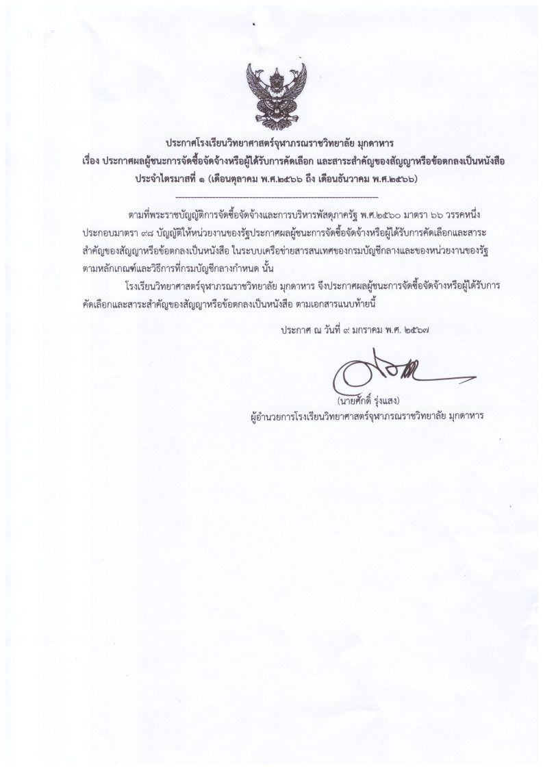 ประกาศผู้ชนะการจัดซื้อจัดจ้างหรือผู้ได้รับการคัดเลือก และสารสำคัญของสัญญาหรือข้อตกลงเป็นหนังสือประจำไตรมาสที่ 1 (ต.ค.-ธ.ค.2566)