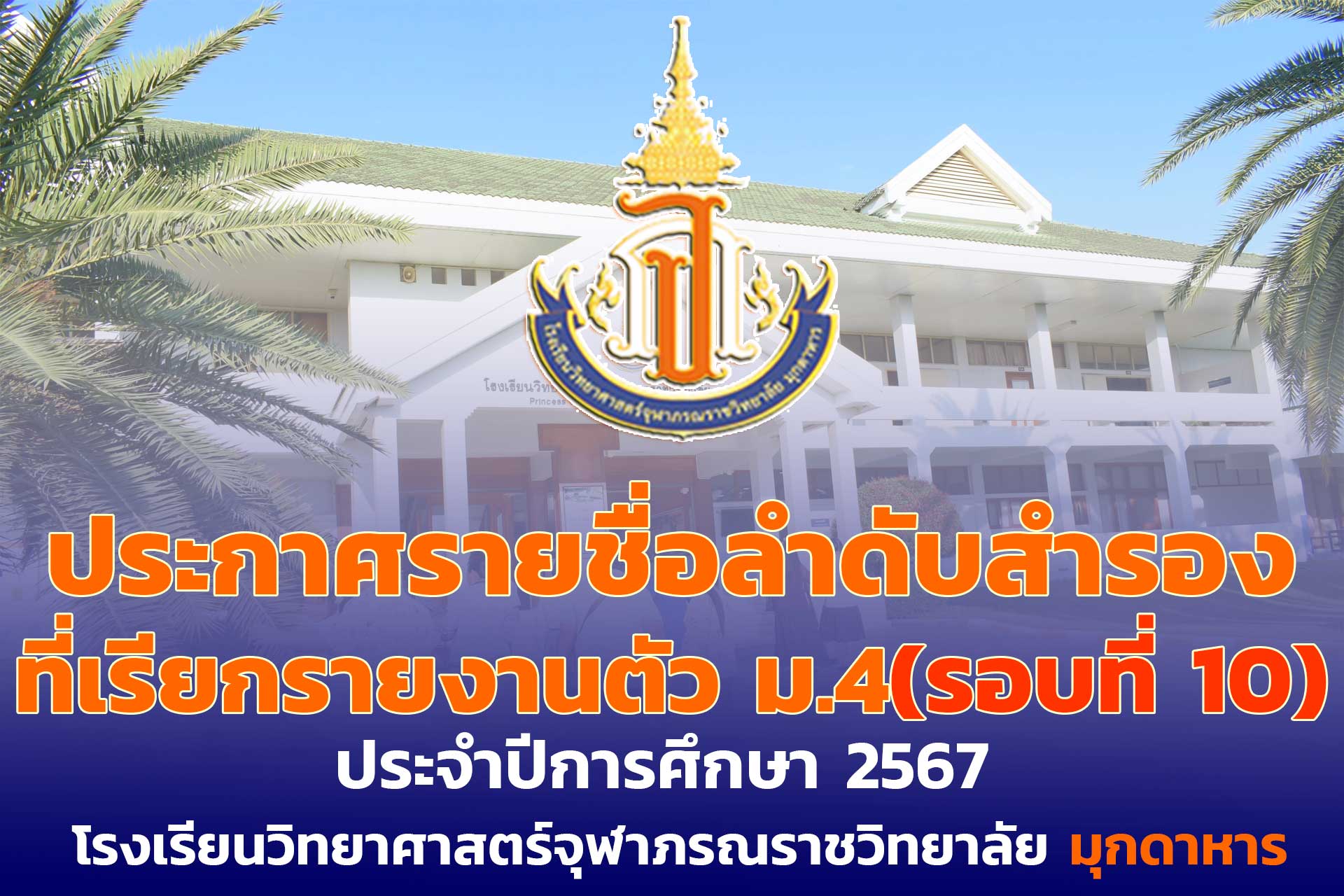 ประกาศรายชื่อลำดับสำรองที่เรียกรายงานตัวและยืนยันสิทธิ์การเข้าเรียน ม.4 โรงเรียนวิทยาศาสตร์จุฬาภรณราชวิทยาลัย มุกดาหาร ปีการศึกษา 2567 (รอบที่ 10)