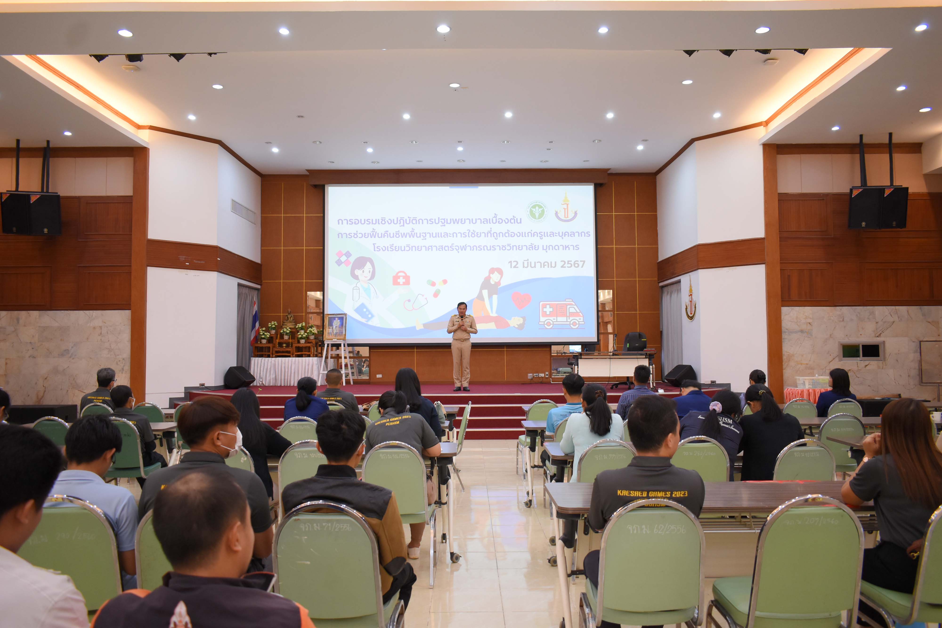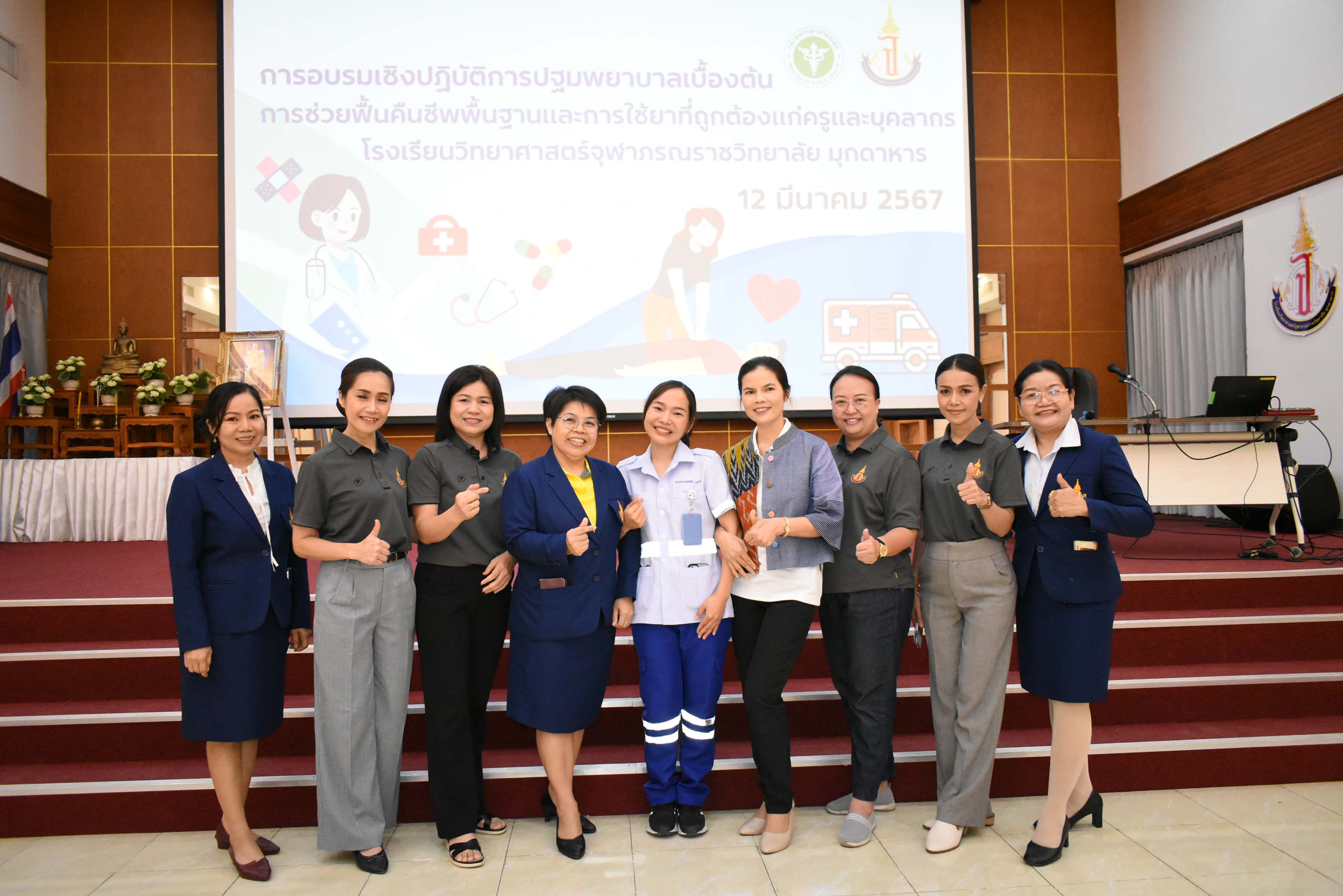 งานอนามัย กลุ่มงานกิจการนักเรียน โรงเรียนวิทยาศาสตร์จุฬาภรณราชวิทยาลัย มุกดาหาร จัดกิจกรรมการฝึกอบรมเชิงปฏิบัติการ การปฐมพยาบาลเบื้องต้น การช่วยฟื้นคืนชีพขั้นพื้นฐาน และการใช้ยาที่ถูกต้อง เพื่อทบทวนความรู้เดิม และเสริมสร้างความมั่นใจในการดูแลนักเรียนและบุคลากร ในวันอังคารที่ 12 มีนาคม 2567 เวลา 10.00-12.30 น.