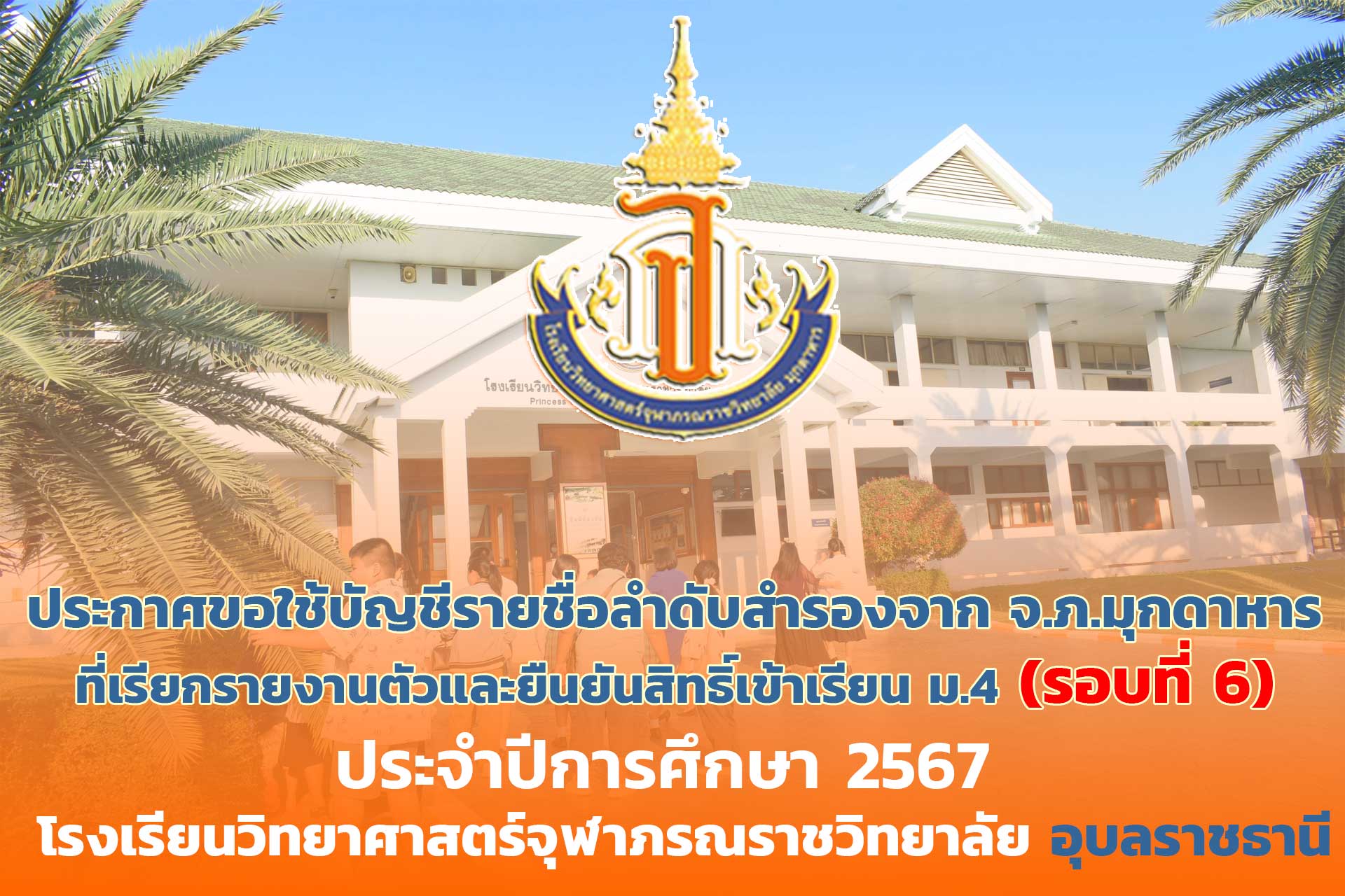 ประกาศขอใช้บัญชี จ.ภ.มุกดาหาร ที่เรียกรายงานตัวและยืนยันสิทธิ์การเข้าเรียน ม.4 จภ. อุบลราชธานี ปีการศึกษา 2567 (รอบที่ 6)