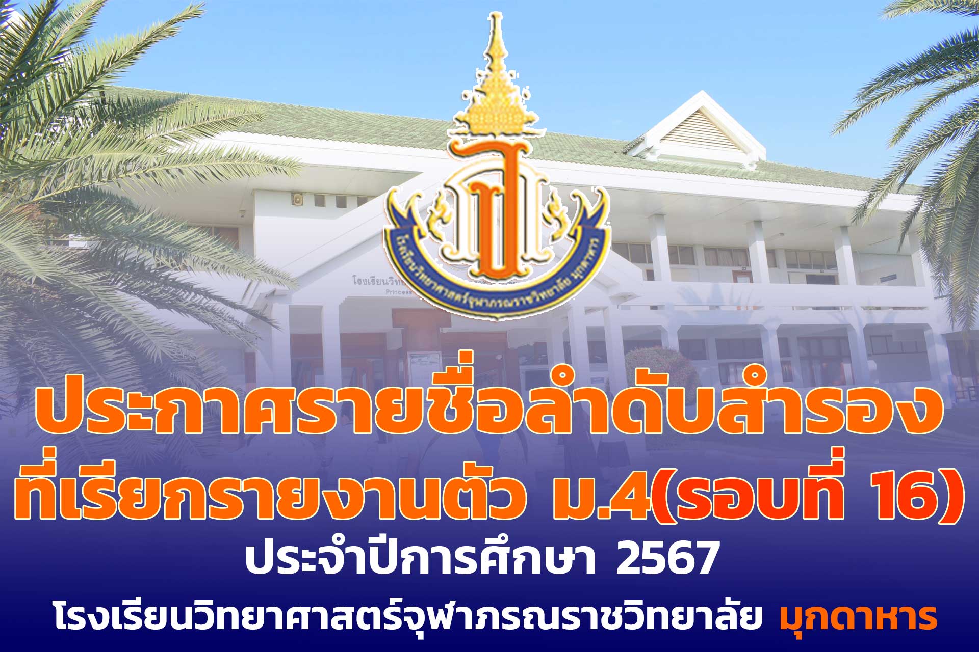 ประกาศรายชื่อลำดับสำรองที่เรียกรายงานตัวและยืนยันสิทธิ์การเข้าเรียน ม.4 โรงเรียนวิทยาศาสตร์จุฬาภรณราชวิทยาลัย มุกดาหาร ปีการศึกษา 2567 (รอบที่ 16)
