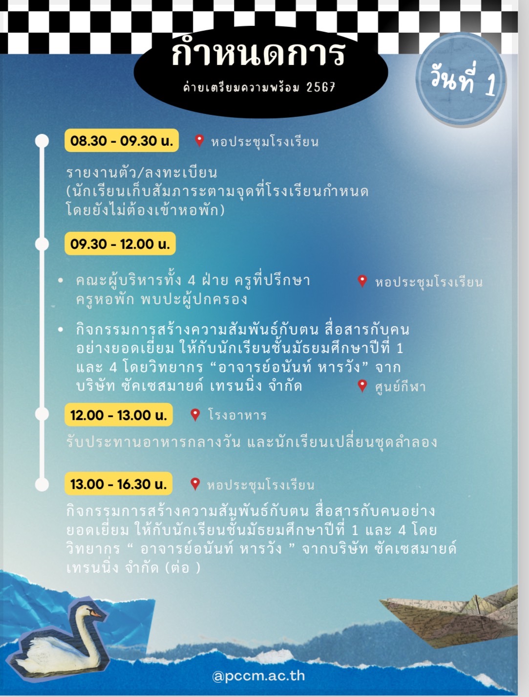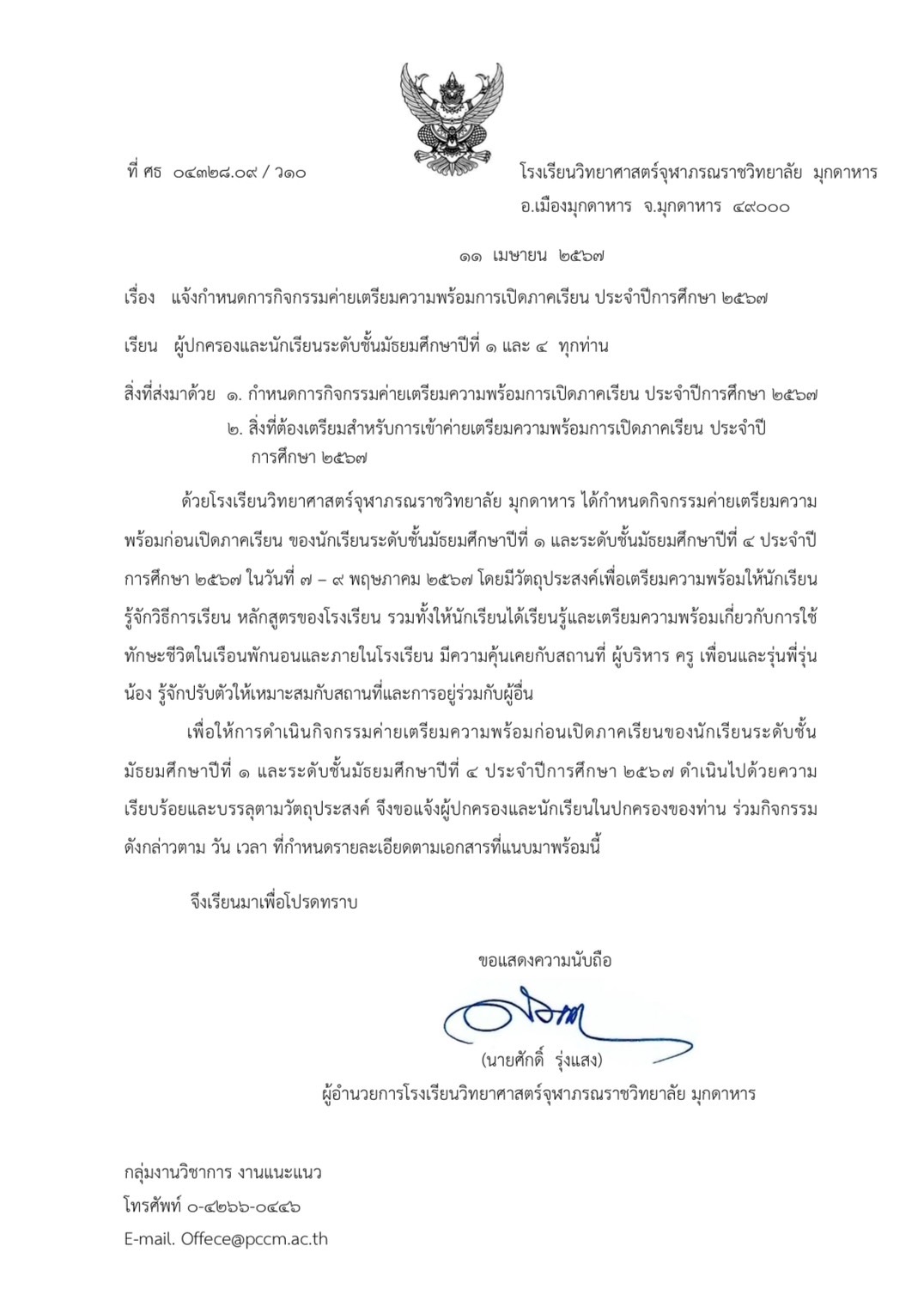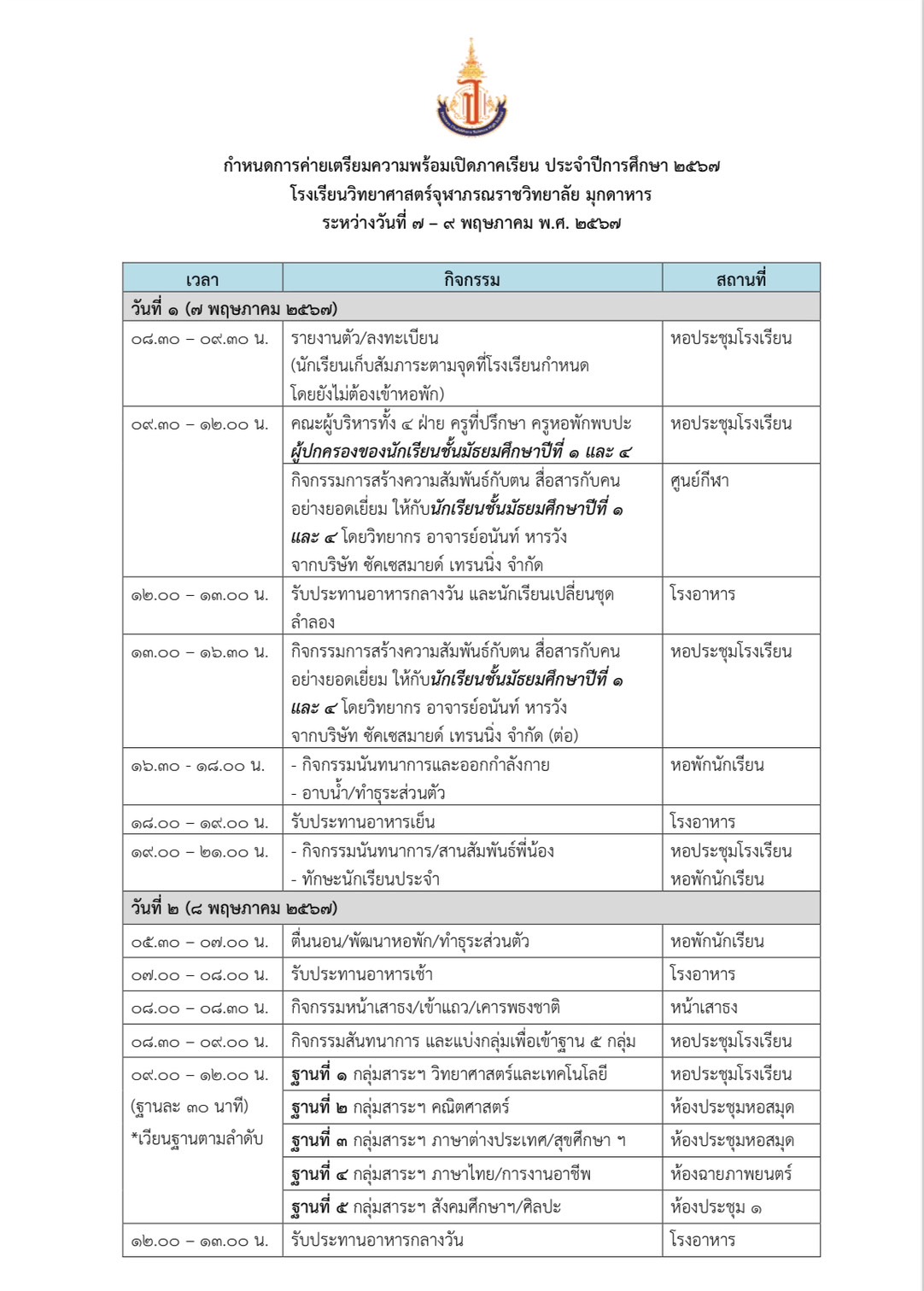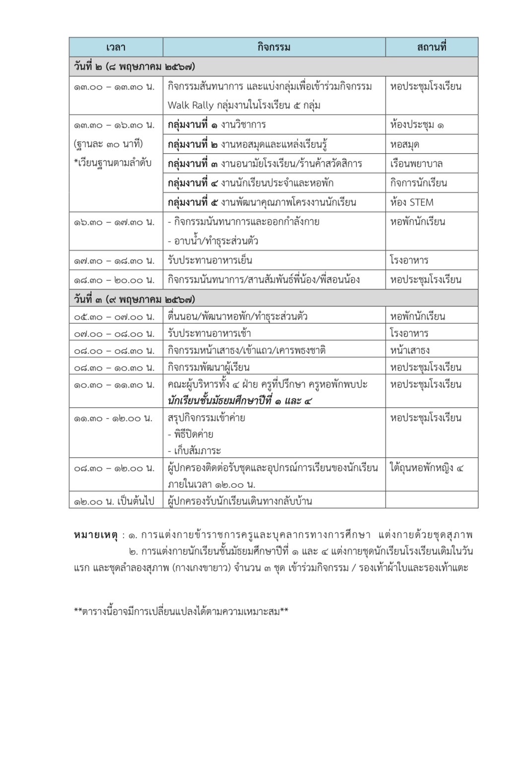 กำหนดการจัดกิจกรรมค่ายเตรียมความพร้อมก่อนเข้าเรียน ปีการศึกษา 2567