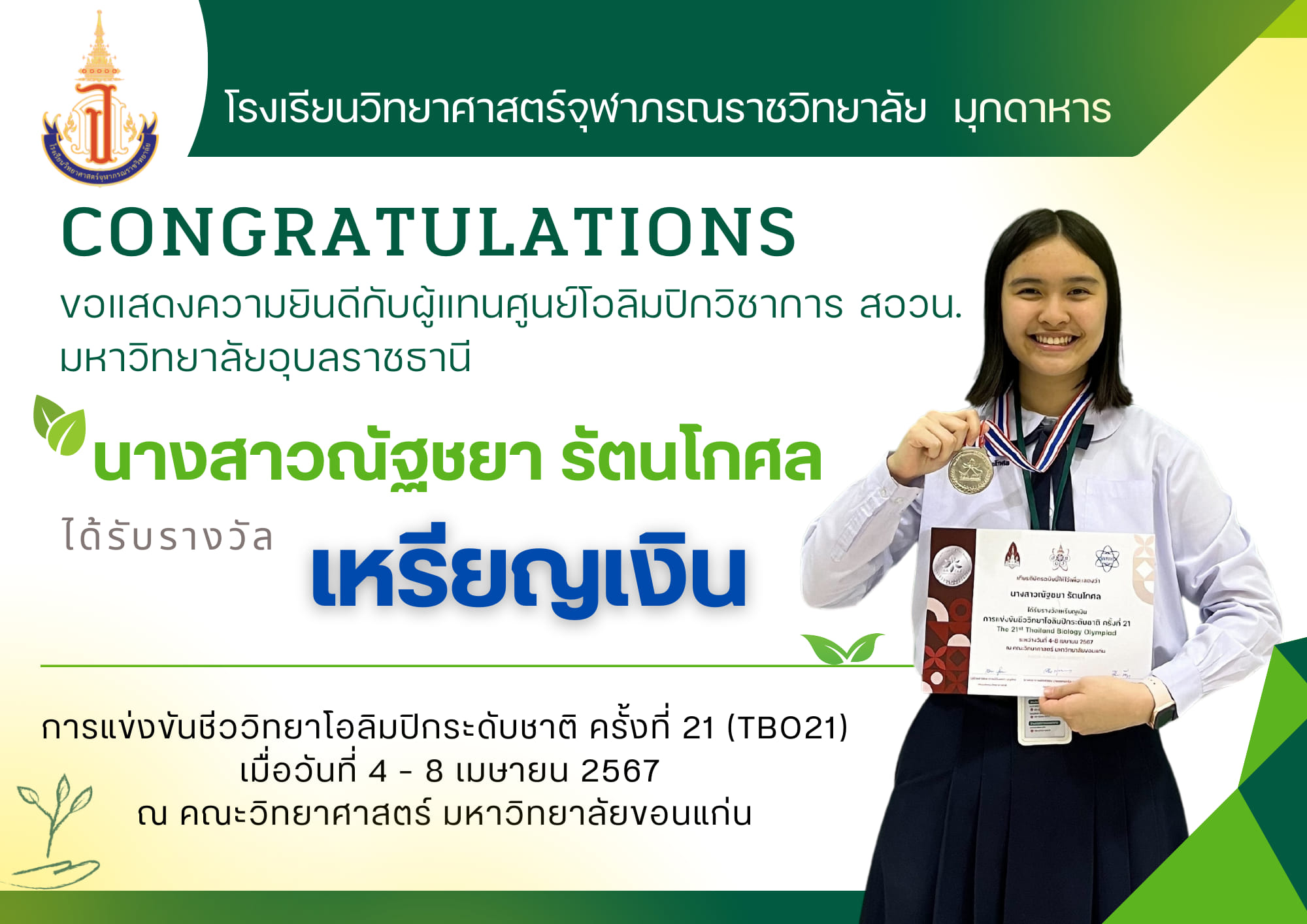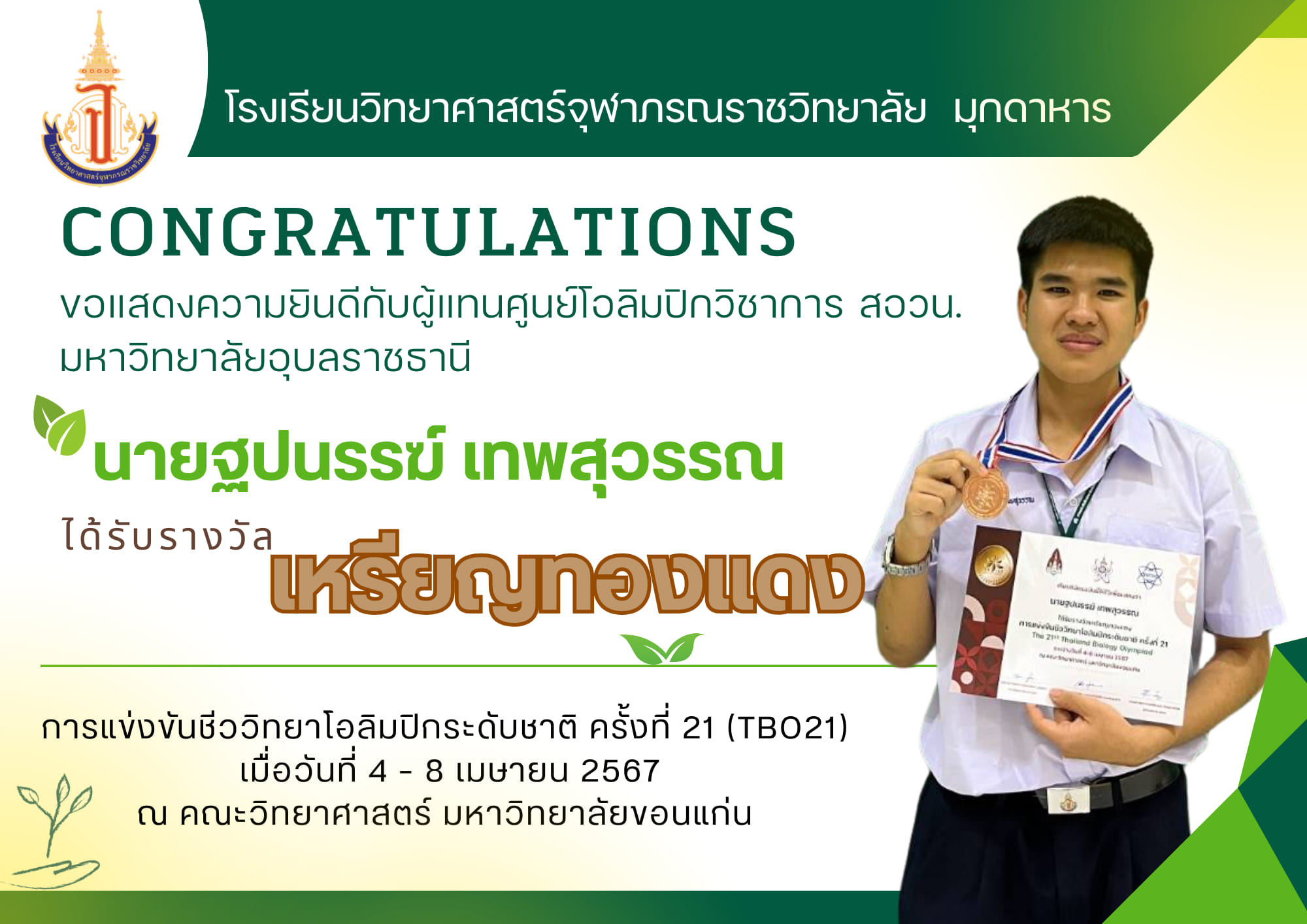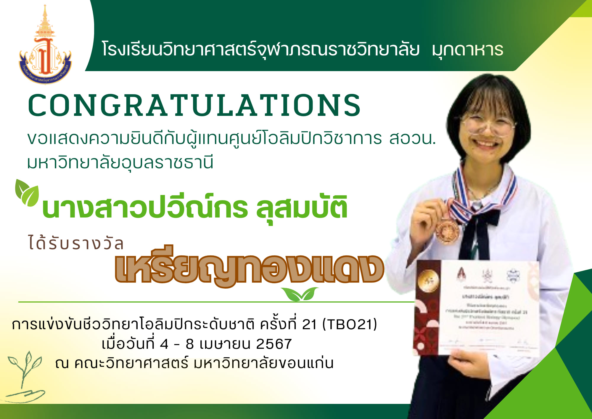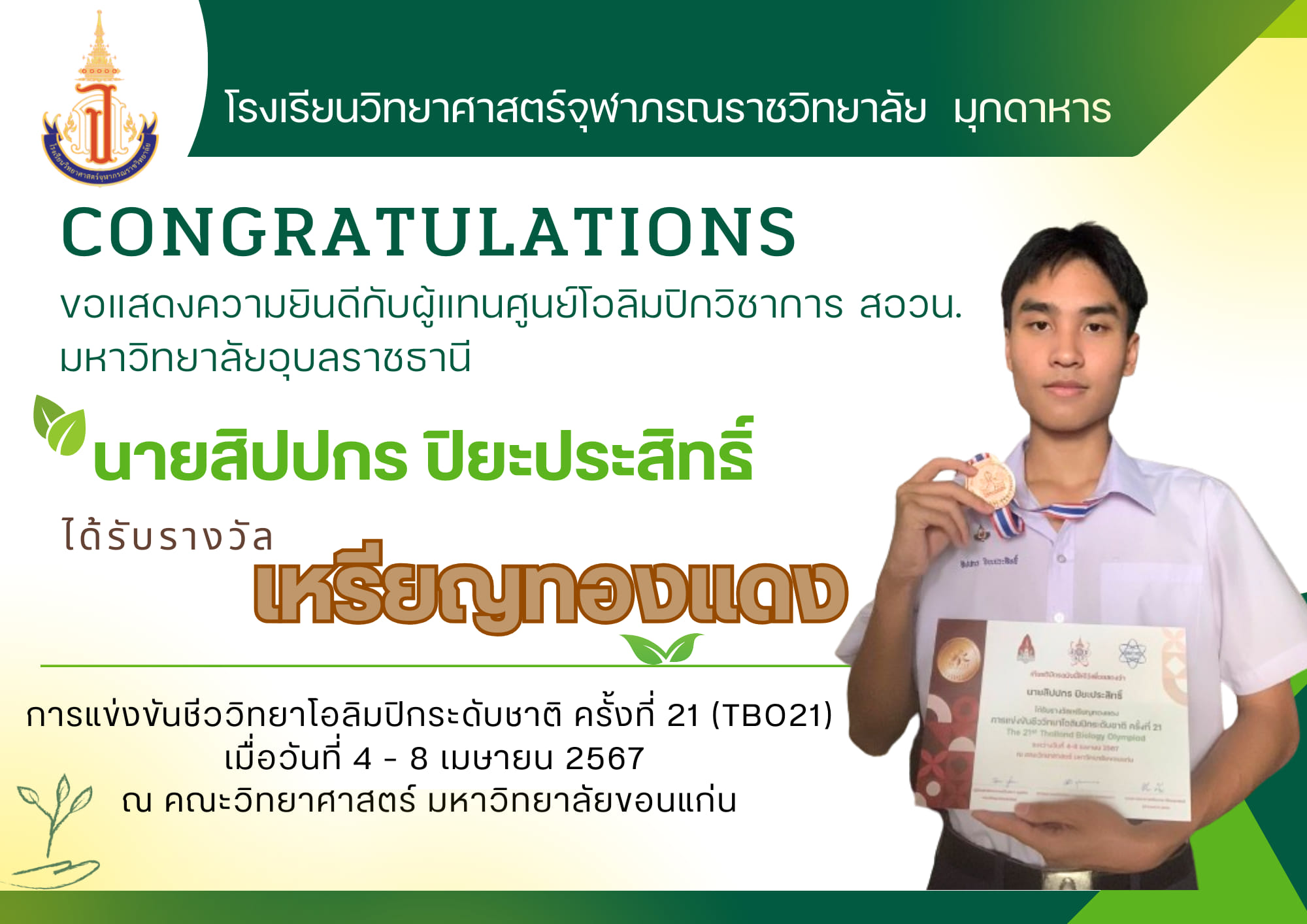 แสดงความยินดีกับนักเรียนโรงเรียนวิทยาศาสตร์จุฬาภรณราชวิทยาลัย มุกดาหาร ที่ได้รับเหรียญรางวัลและเป็นตัวแทนการแข่งขันโอลิมปิกวิชาการ สอวน. สาขาชีววิทยา ระดับชาติ