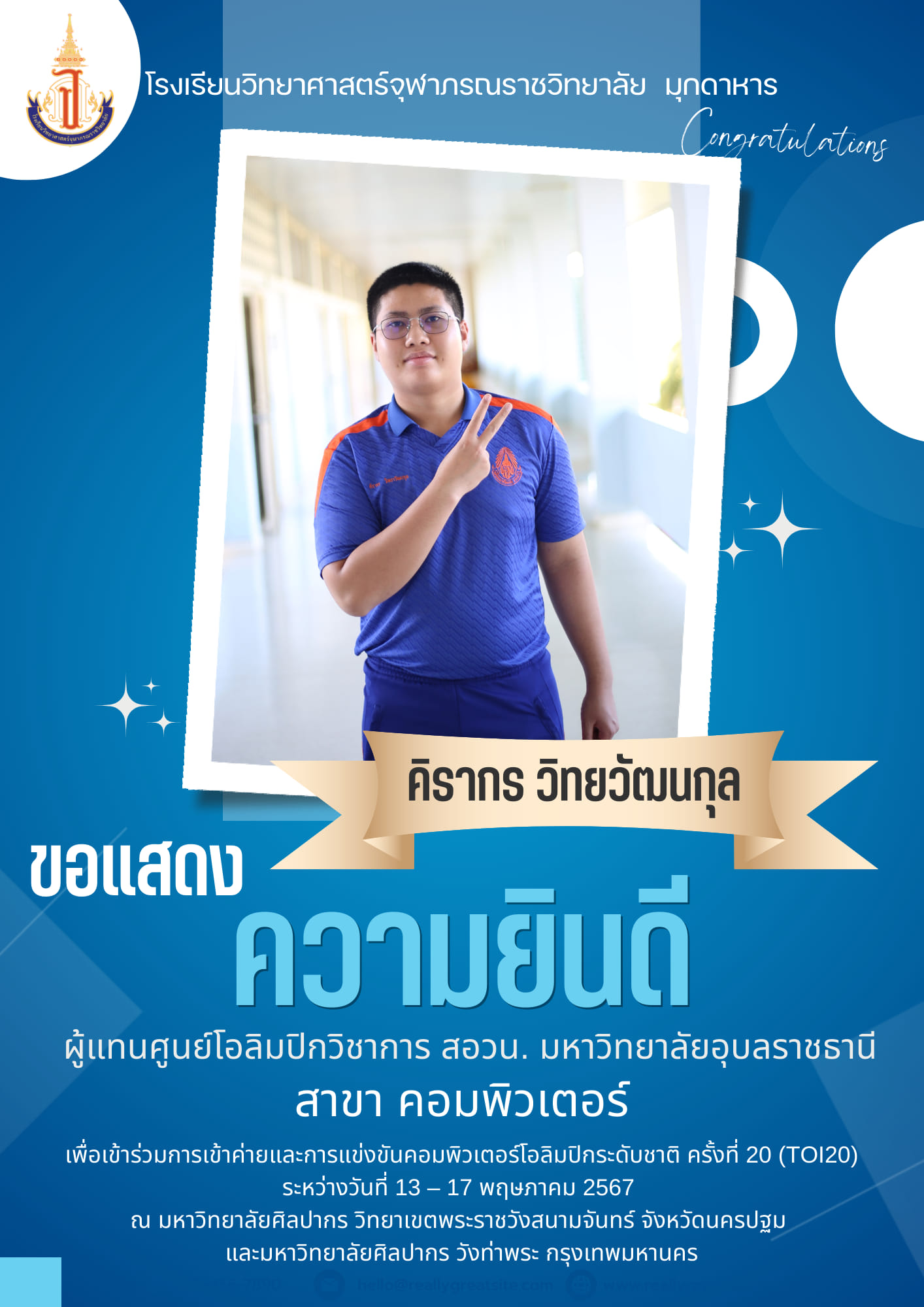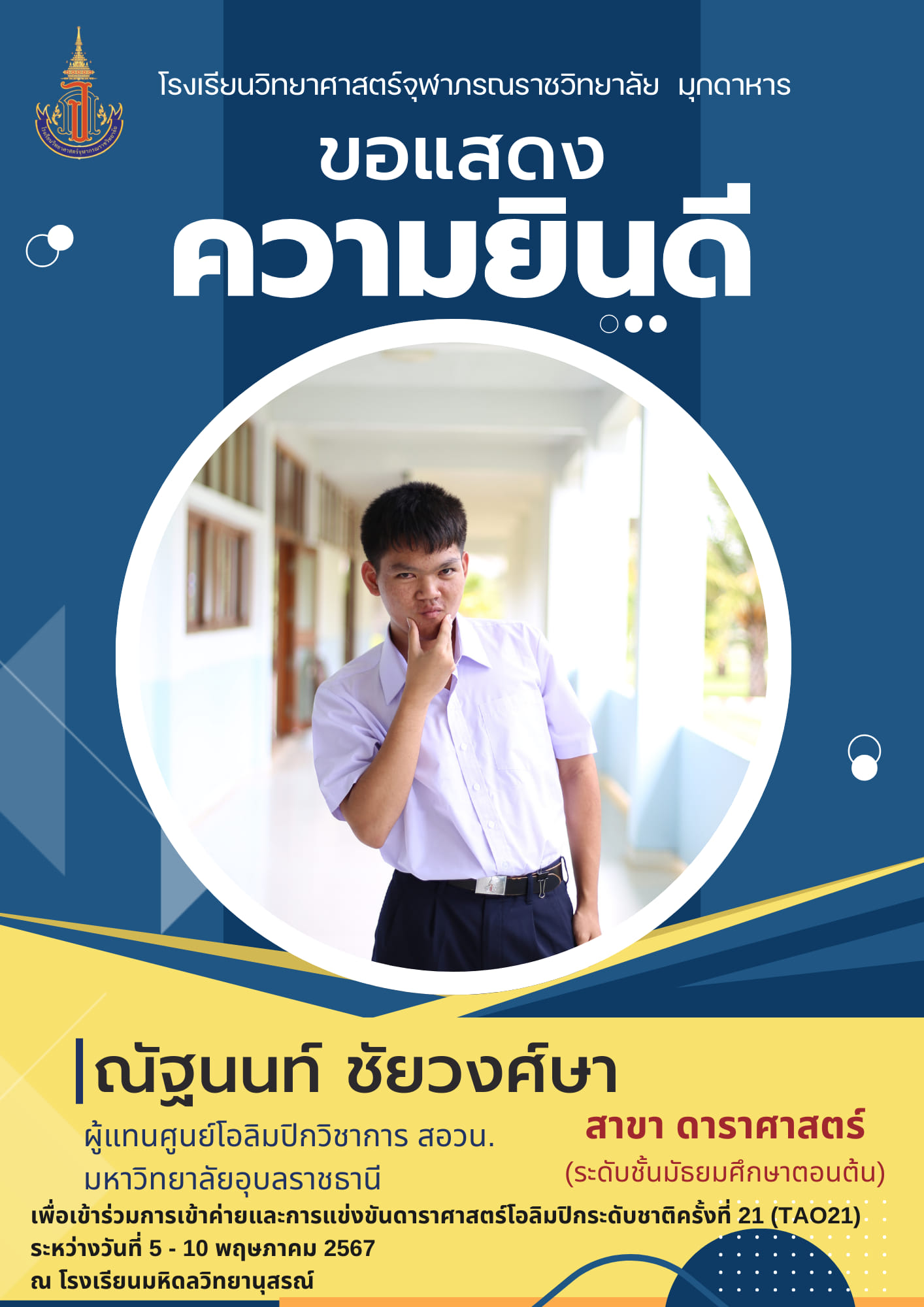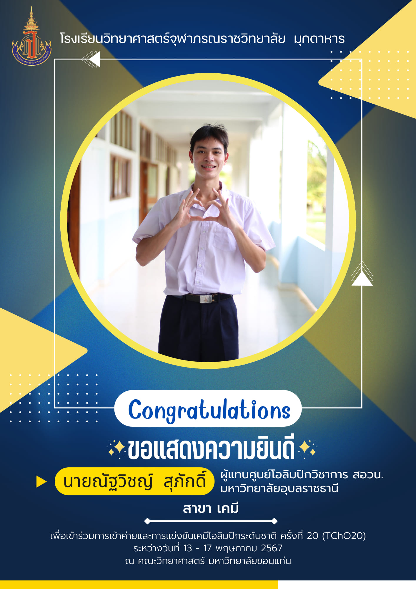 แสดงความยินดีกับนักเรียนโรงเรียนวิทยาศาสตร์จุฬาภรณราชวิทยาลัย มุกดาหาร ที่ได้รับเหรียญรางวัลและเป็นตัวแทนการแข่งขันโอลิมปิกวิชาการ สอวน. สาขาชีววิทยา ระดับชาติ