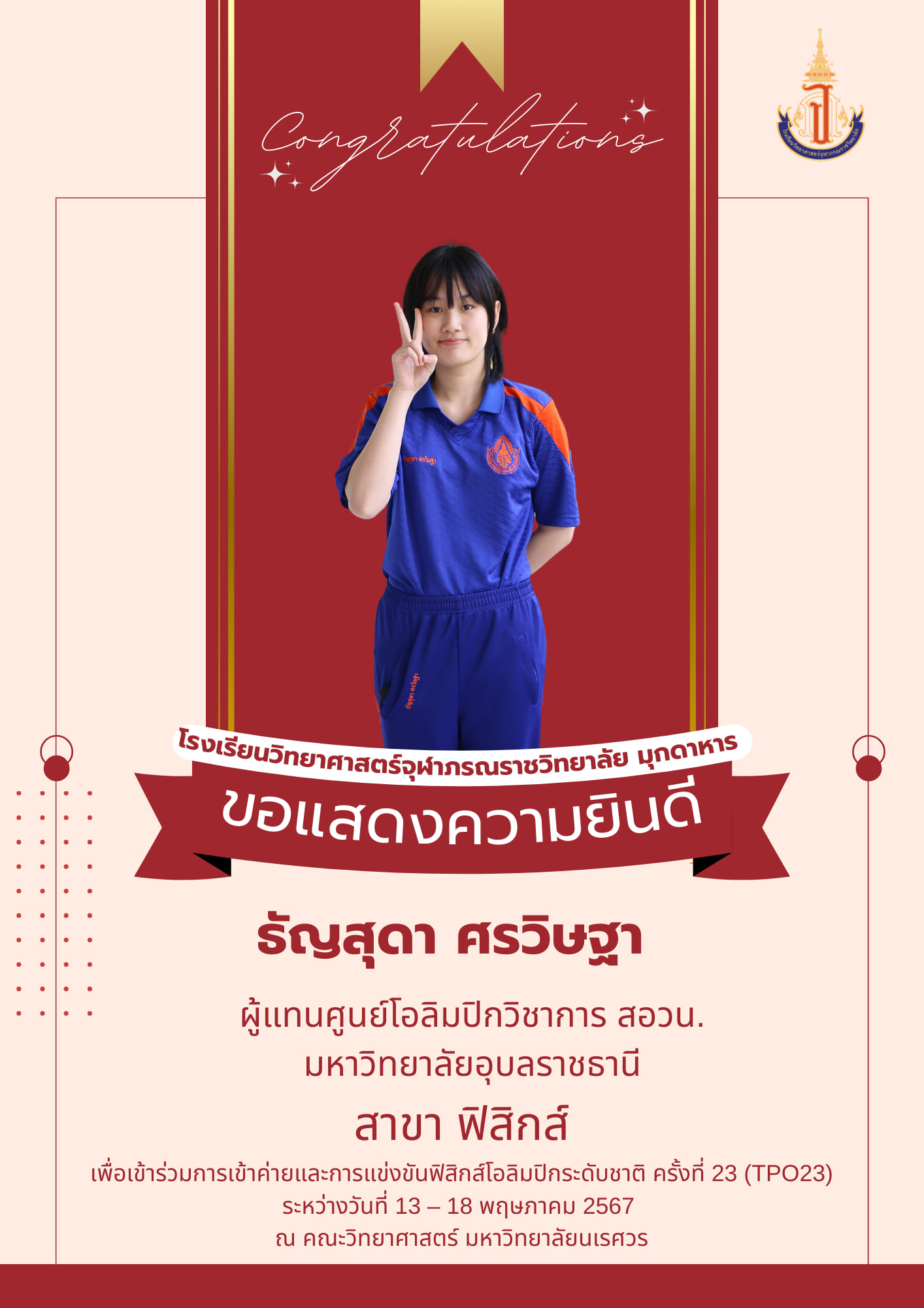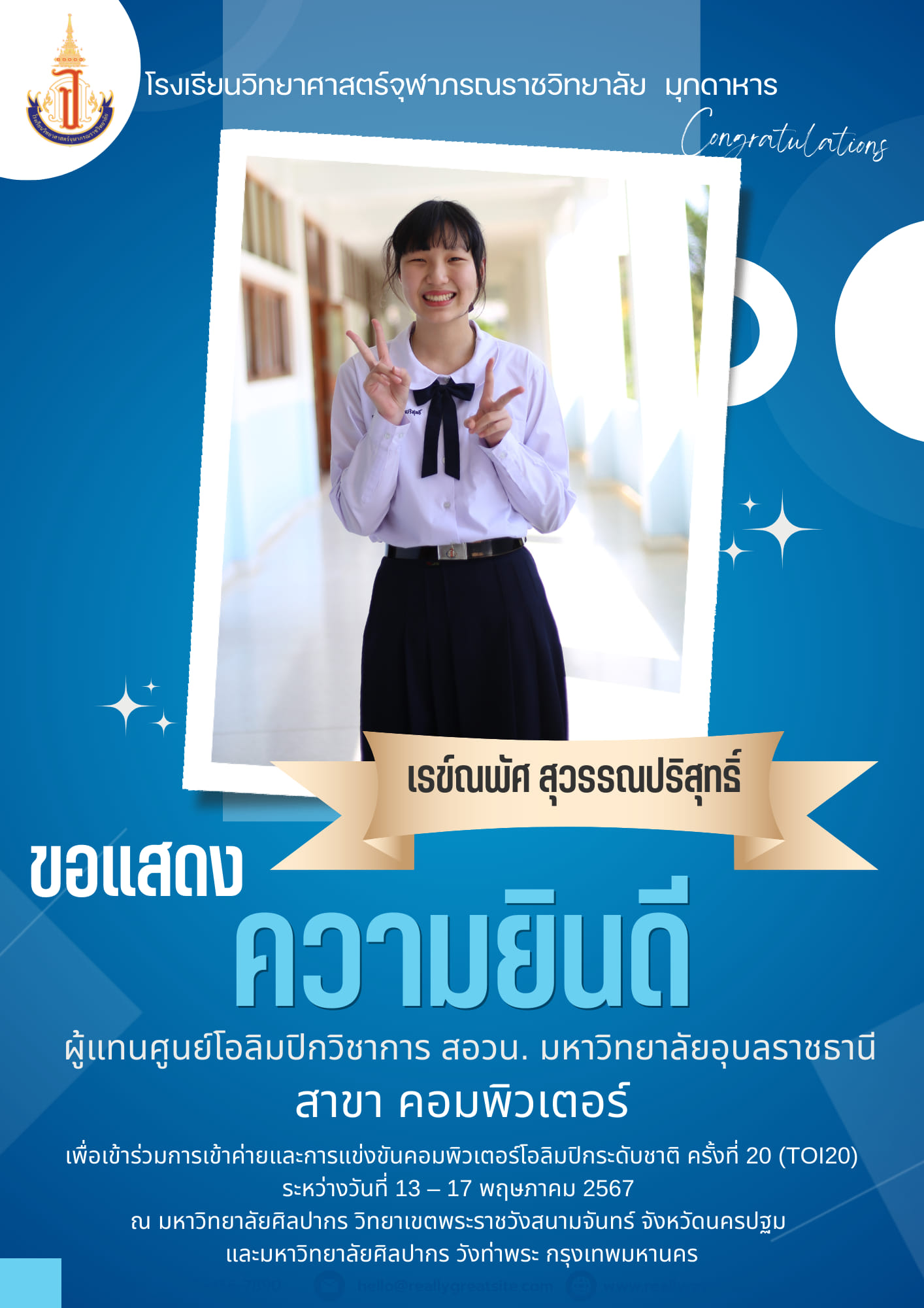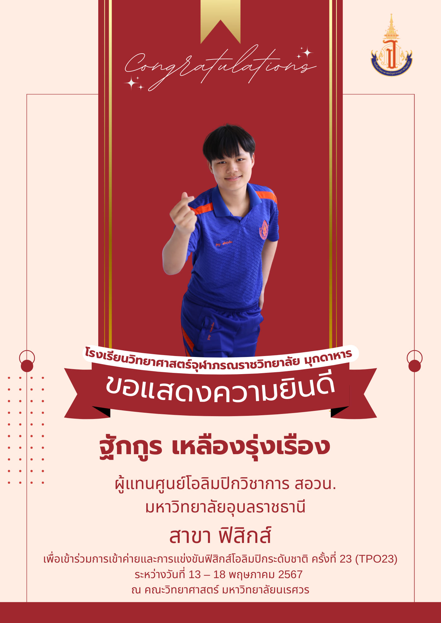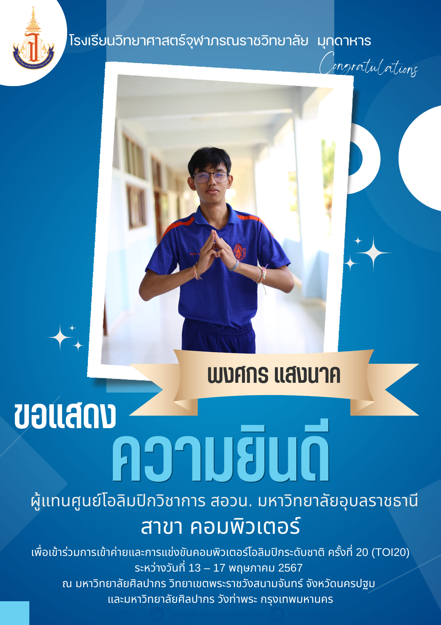 แสดงความยินดีกับนักเรียนโรงเรียนวิทยาศาสตร์จุฬาภรณราชวิทยาลัย มุกดาหาร ที่ได้รับเหรียญรางวัลและเป็นตัวแทนการแข่งขันโอลิมปิกวิชาการ สอวน. สาขาชีววิทยา ระดับชาติ