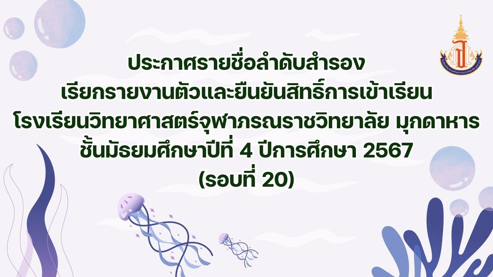 ประกาศรายชื่อลำดับสำรองที่เรียกรายงานตัวและยืนยันสิทธิ์การเข้าเรียน ม.4 โรงเรียนวิทยาศาสตร์จุฬาภรณราชวิทยาลัย มุกดาหาร ปีการศึกษา 2567 (รอบที่ 20)