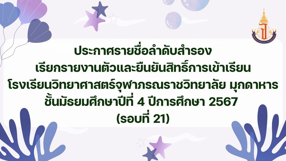 ประกาศรายชื่อลำดับสำรองที่เรียกรายงานตัวและยืนยันสิทธิ์การเข้าเรียน ม.4 โรงเรียนวิทยาศาสตร์จุฬาภรณราชวิทยาลัย มุกดาหาร ปีการศึกษา 2567 (รอบที่ 21)