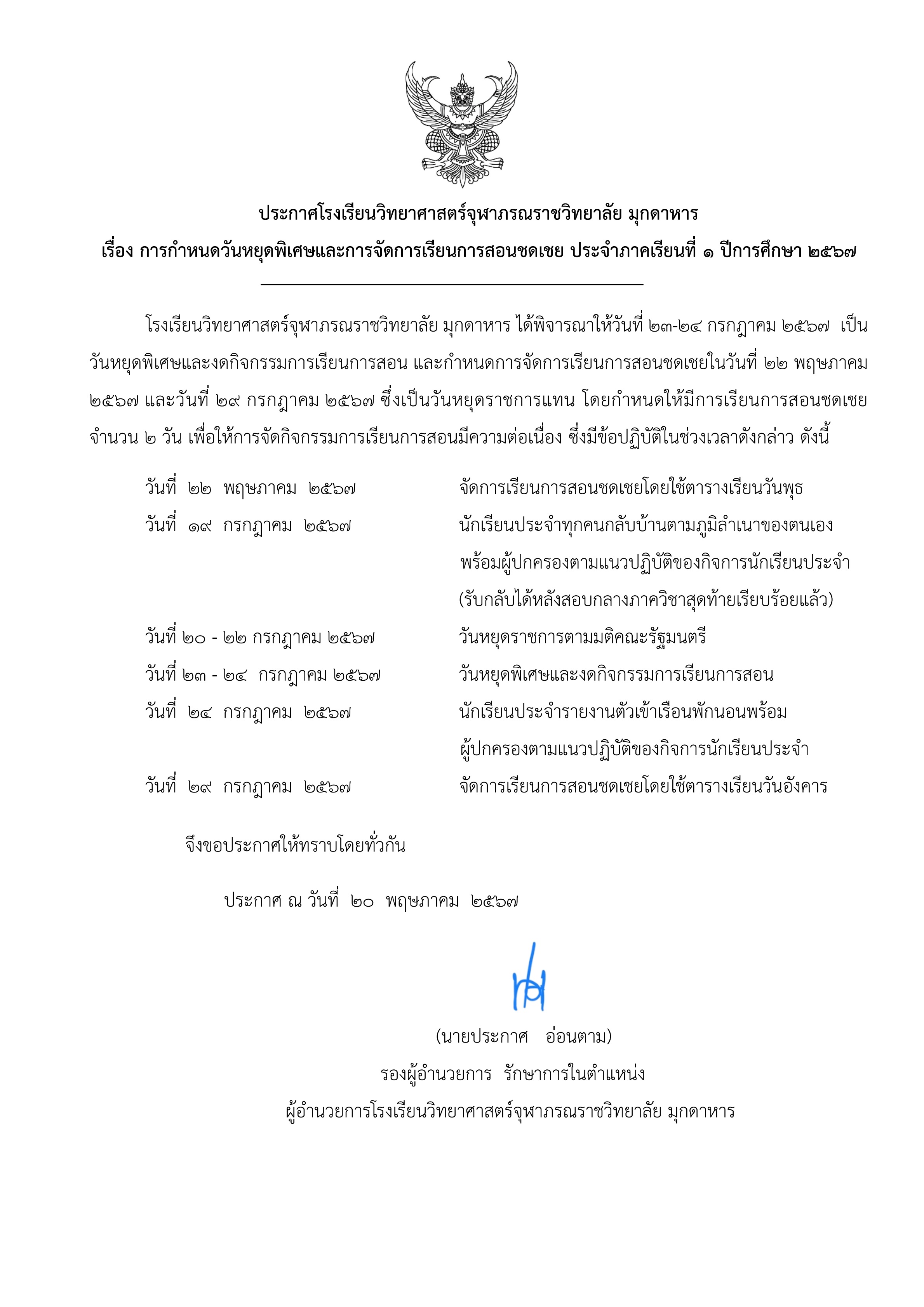 ประกาศกำหนดวันหยุดพิเศษและการจัดการเรียนการสอนชดเชย ประจำภาคเรียนที่ 1/2567