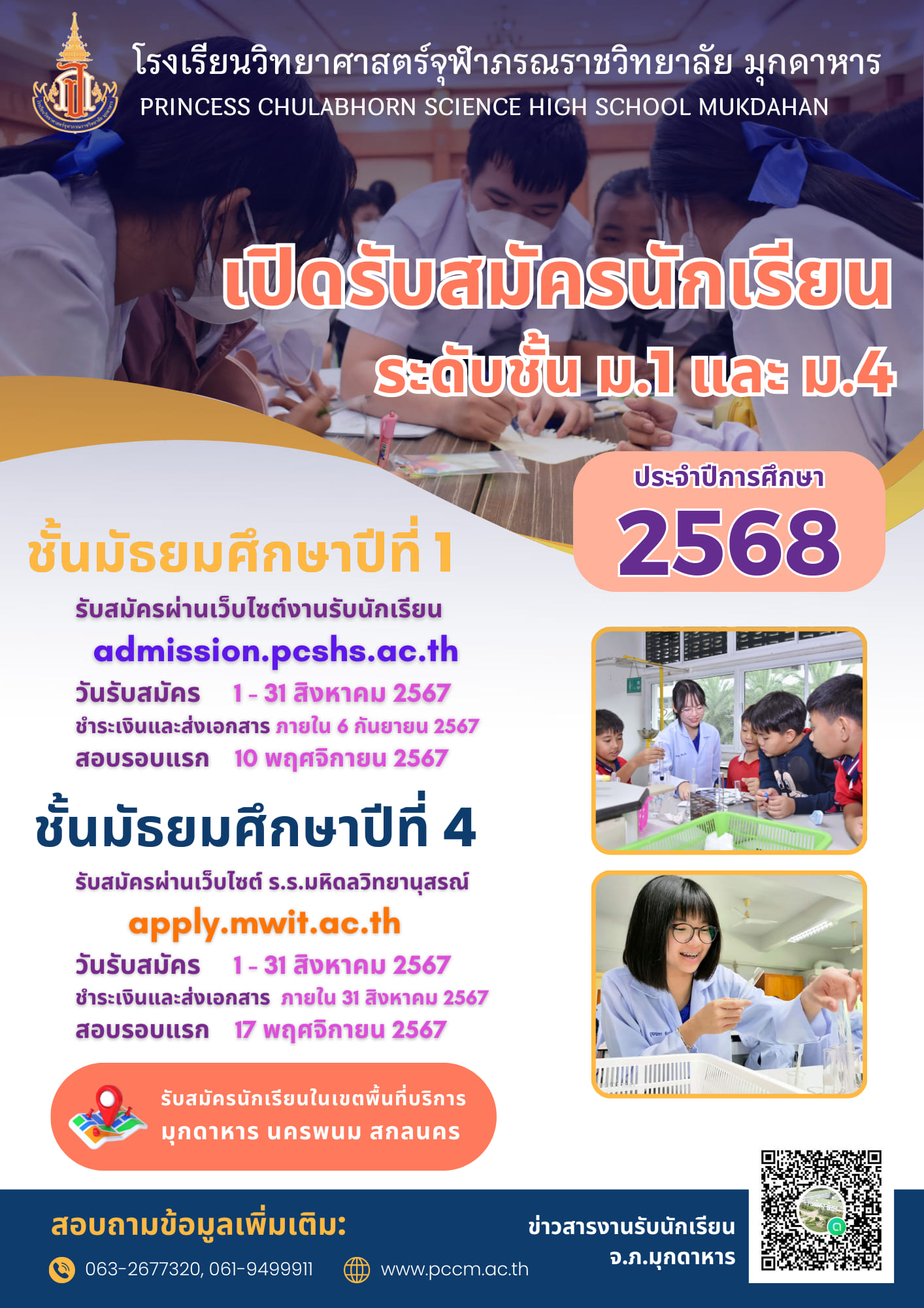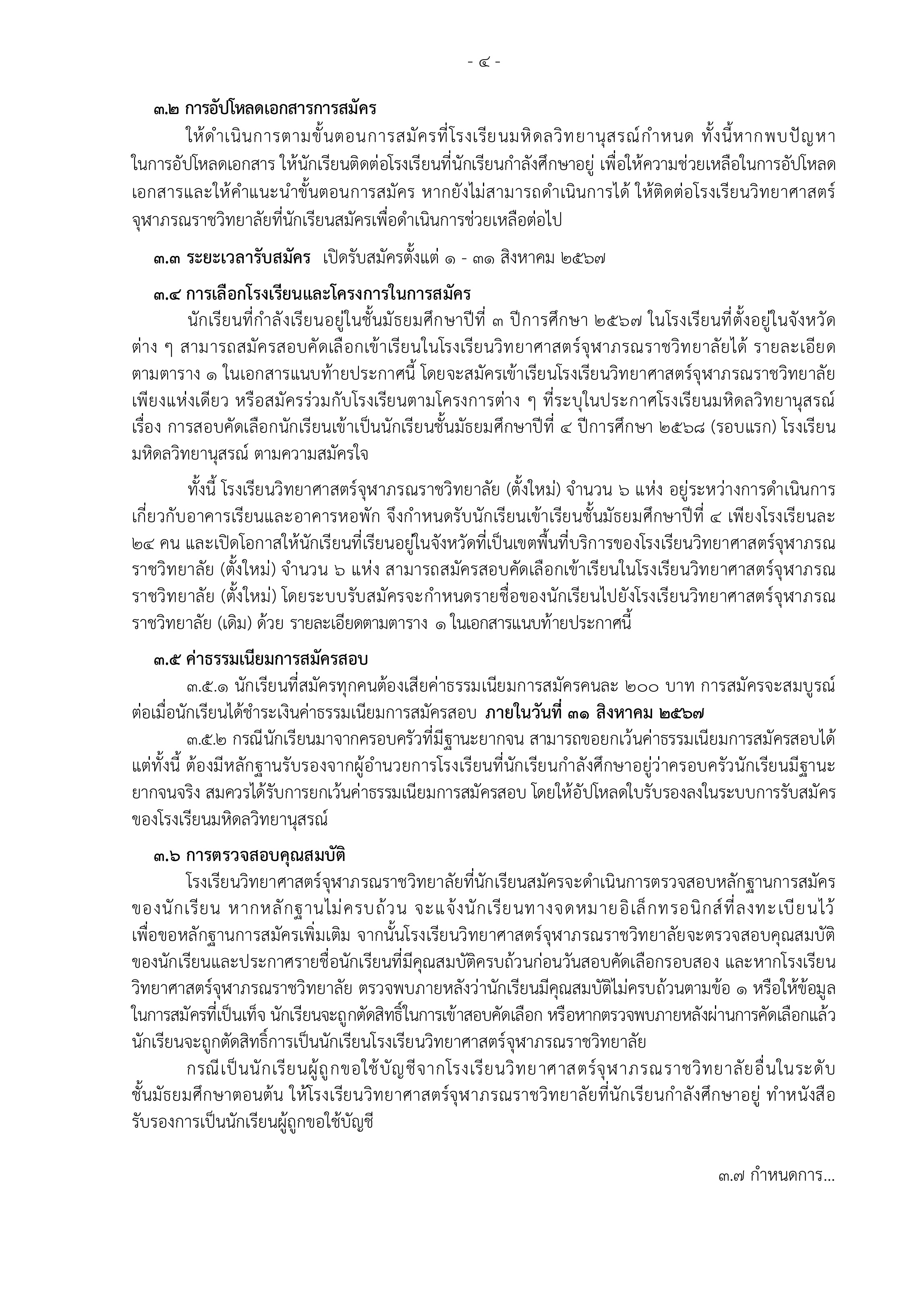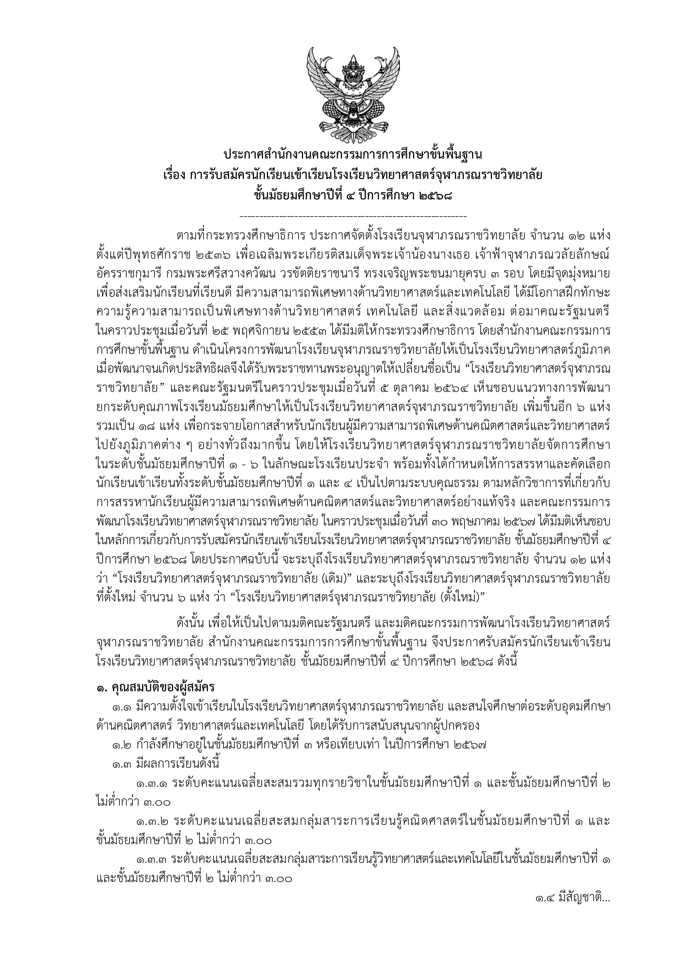 ประกาศรับสมัครนักเรียนเข้าเรียน โรงเรียนวิทยาศาสตร์จุฬาภรณราชวิทยาลัย ชั้นมัธยมศึกษาปีที่ 4 ปีการศึกษา 2568