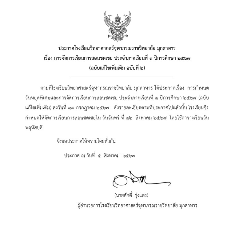 ประกาศการจัดการเรียนการสอนชดเชย ประจำภาคเรียนที่ 1 ปีการศึกษา 2567 (แก้ไขเพิ่มเติม ฉบับที่ 2)