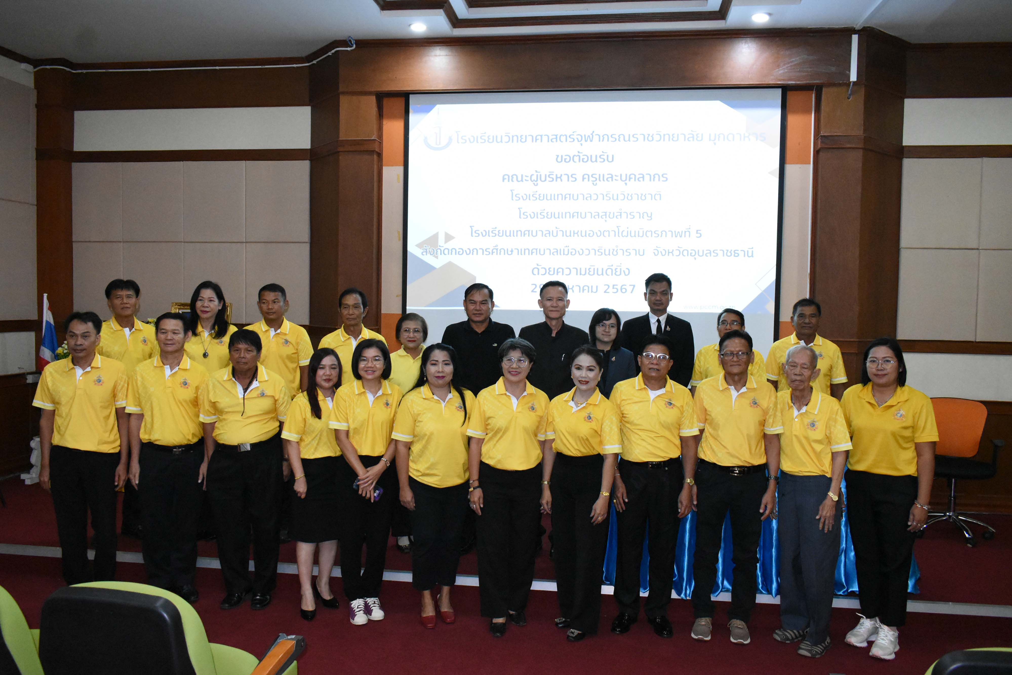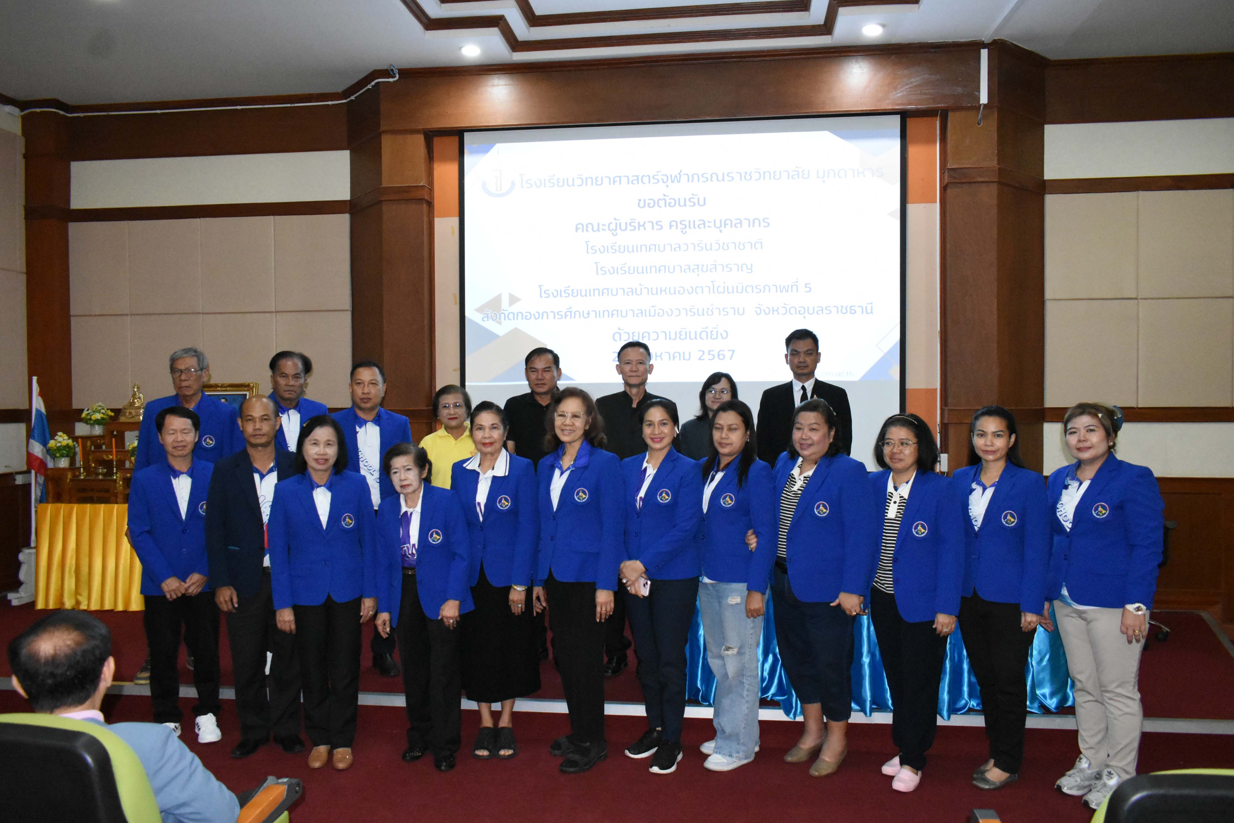 ในวันพฤหัสบดีที่ 29 สิงหาคม พ.ศ. 2567 เวลา 09.00 น. นายศักดิ์ รุ่งแสง ผู้อำนวยการโรงเรียนวิทยาศาสตร์จุฬาภรราชวิทยาลัย มุกดาหาร พร้อมด้วยรองผู้อำนวยการทั้ง 3 กลุ่มงานร่วมต้อนรับคณะผู้บริหาร ครู และนักเรียน จากโรงเรียนเทศบาลวารินวิชาชาติ โรงเรียนเทศบาลหนองตาโผ่มิตรภาพที่ 5 และโรงเรียนเทศบาลสุขสำราญ สังกัดกองการศึกษาเทศบาลเมืองวารินชำราบ จังหวัดอุบลราชธานี ที่เข้าทัศนศึกษาเยี่ยมชมบรรยากาศในการจัดการเรียนการสอน ของโรงเรียนวิทยาศาสตร์จุฬาภรราชวิทยาลัย มุกดาหาร ณ ห้องสโลป อาคารปฎิบัติการคอมพิวเตอร์