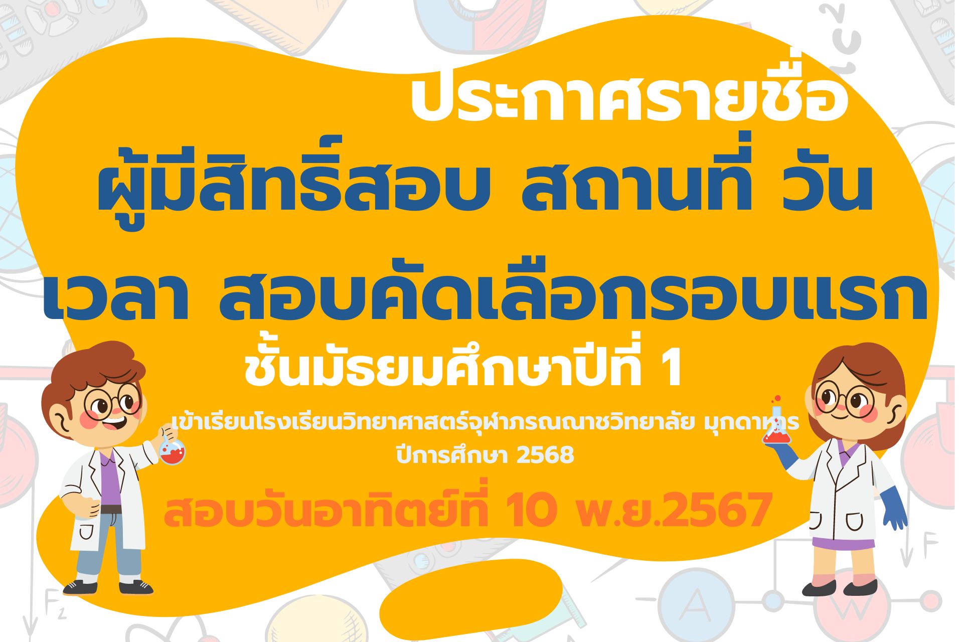 - ผู้สมัครที่ไม่มีชื่อในประกาศควรทำอย่างไร สำหรับผู้สมัครรายใดที่ได้สมัครตามขั้นตอนถูกต้อง มีคุณสมบัติครบถ้วน และชำระเงินค่าสมัครทันตามกำหนด แต่พบว่าไม่มีชื่อในประกาศ ให้นำหลักฐานการสมัครพร้อมใบคำร้อง(อยู่ในหน้าสุดท้ายของไฟล์ประกาศรายชื่อ) ยื่นติดต่อที่โรงเรียนวิทยาศาสตร์จุฬาภรณราชวิทยาลัย มุกดาหาร ภายในวันที่ 11 ตุลาคม 2567 ตามวันเวลาราชการ (08.30-16.30 น.)
