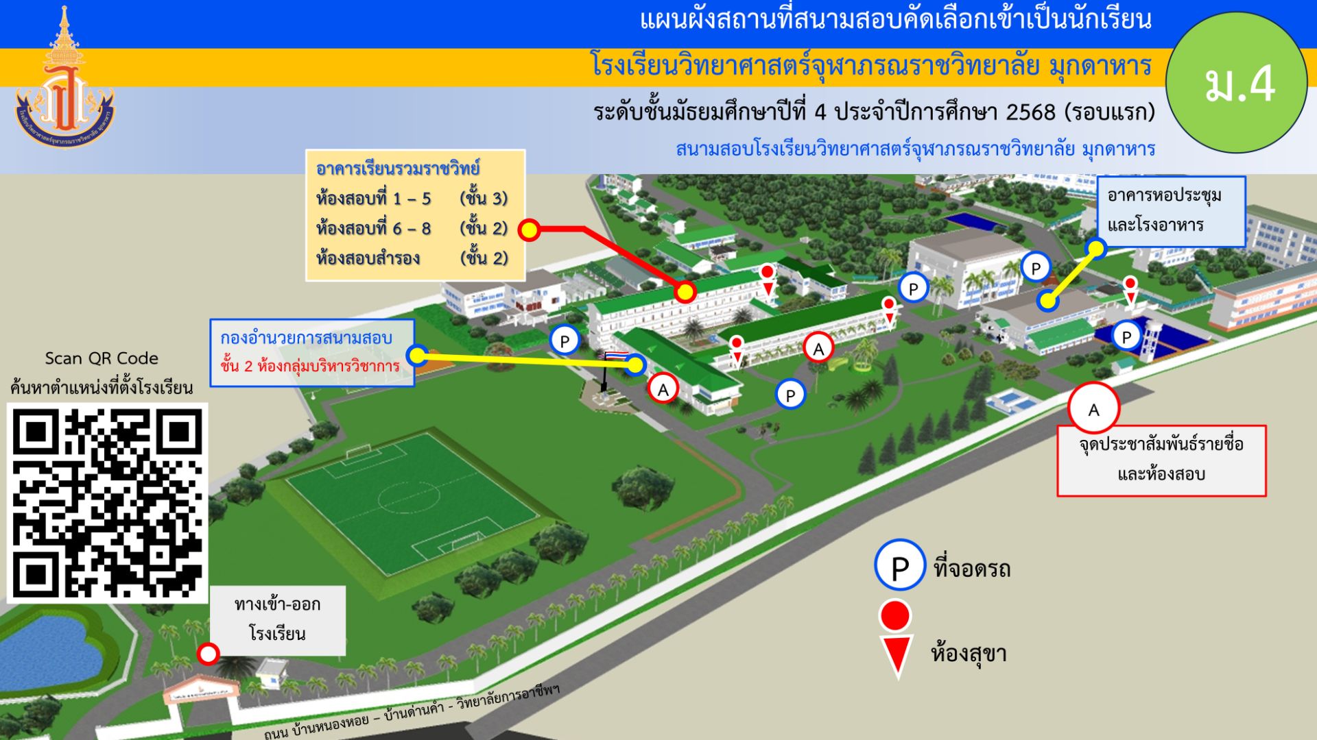 แผนผังสถานที่และห้องสอบ สนามสอบคัดเลือกเข้าเป็นนักเรียน ระดับชั้นมัธยมศึกษาปีที่ 4 ประจำปีการศึกษา 2568 (รอบแรก) โรงเรียนวิทยาศาสตร์จุฬาภรณราชวิทยาลัย มุกดาหาร
