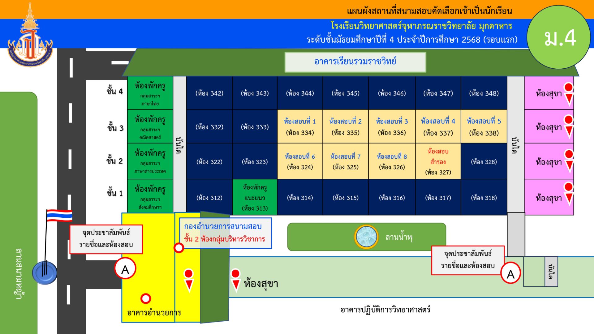 แผนผังสถานที่และห้องสอบ สนามสอบคัดเลือกเข้าเป็นนักเรียน ระดับชั้นมัธยมศึกษาปีที่ 4 ประจำปีการศึกษา 2568 (รอบแรก)