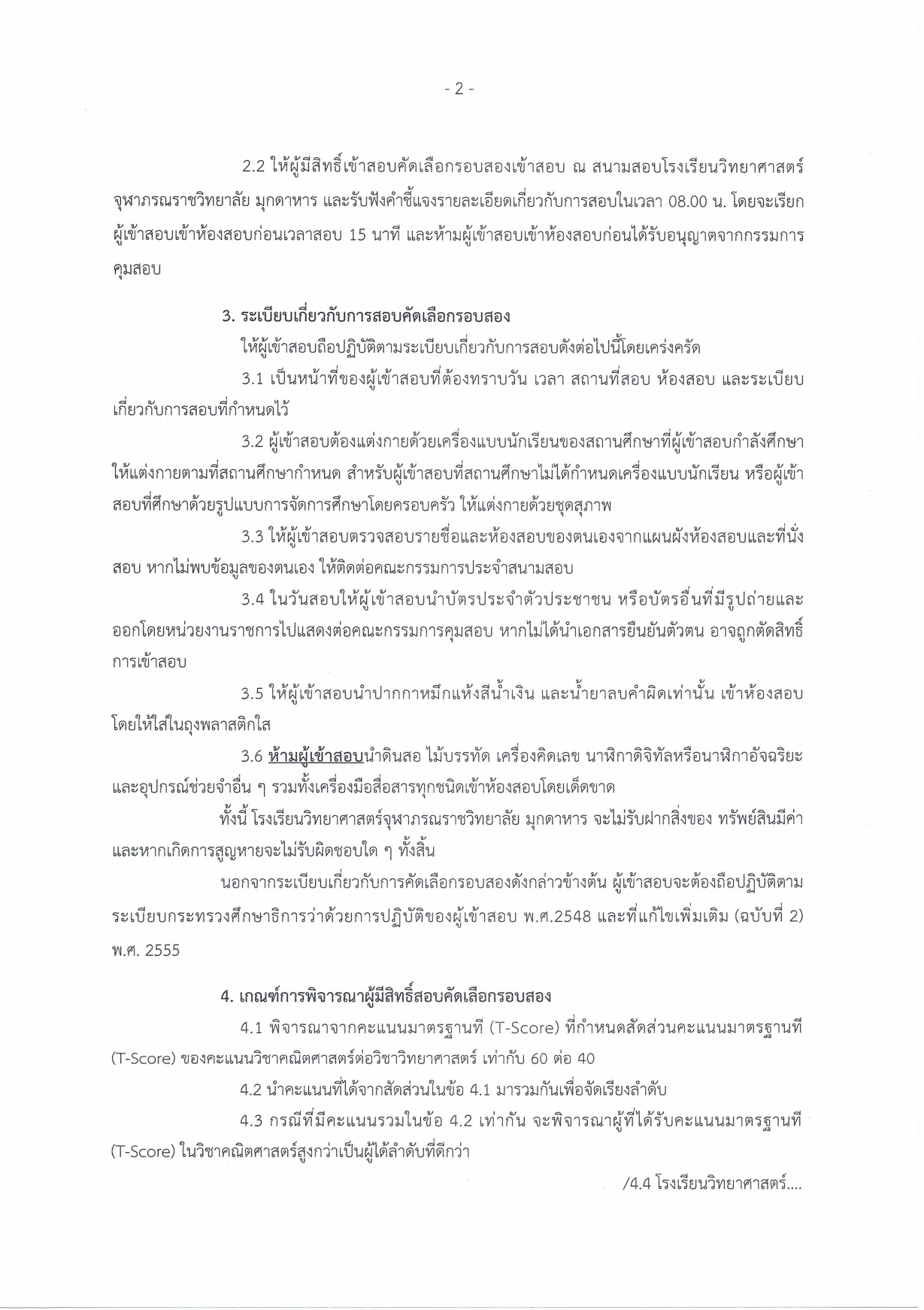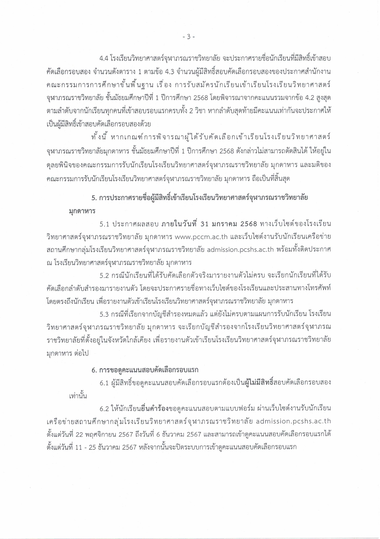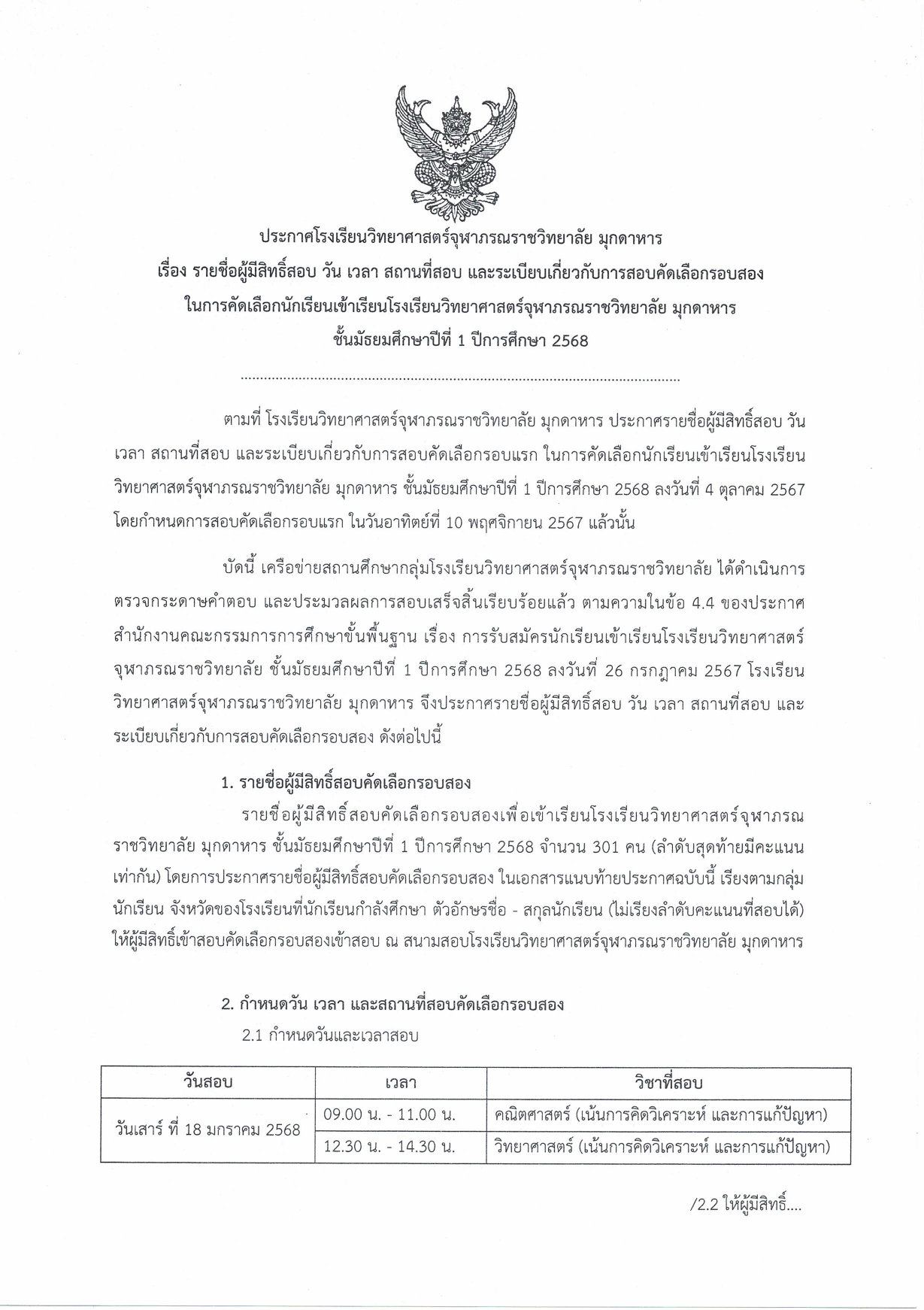 ประกาศรายชื่อผู้มีคุณสมบัติและมีสิทธิ์สอบคัดเลือกรอบสอง เข้าเรียนชั้น ม.1 โรงเรียนวิทยาศาสตร์จุฬาภรณราชวิทยาลัย มุกดาหาร ปีการศึกษา 2568