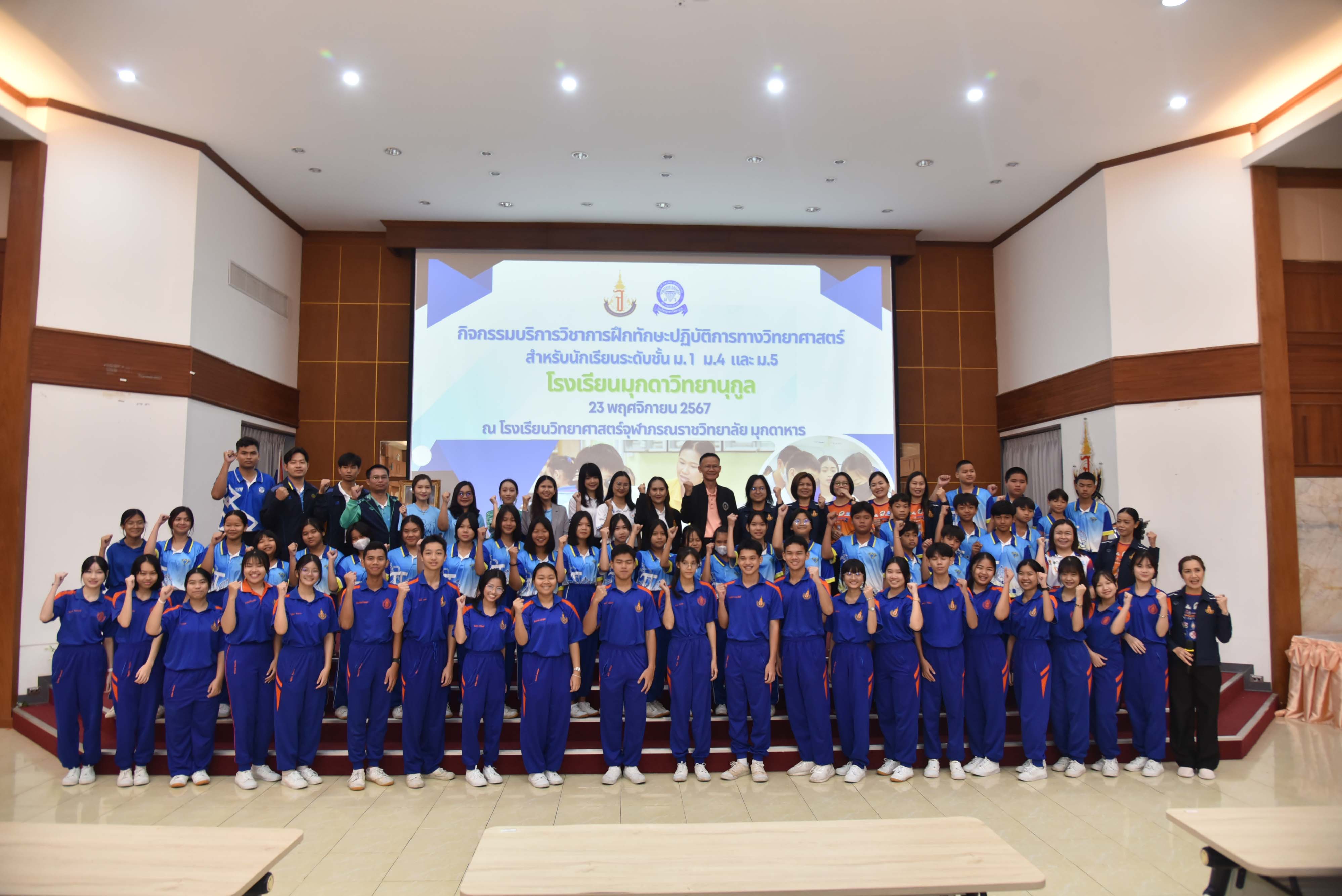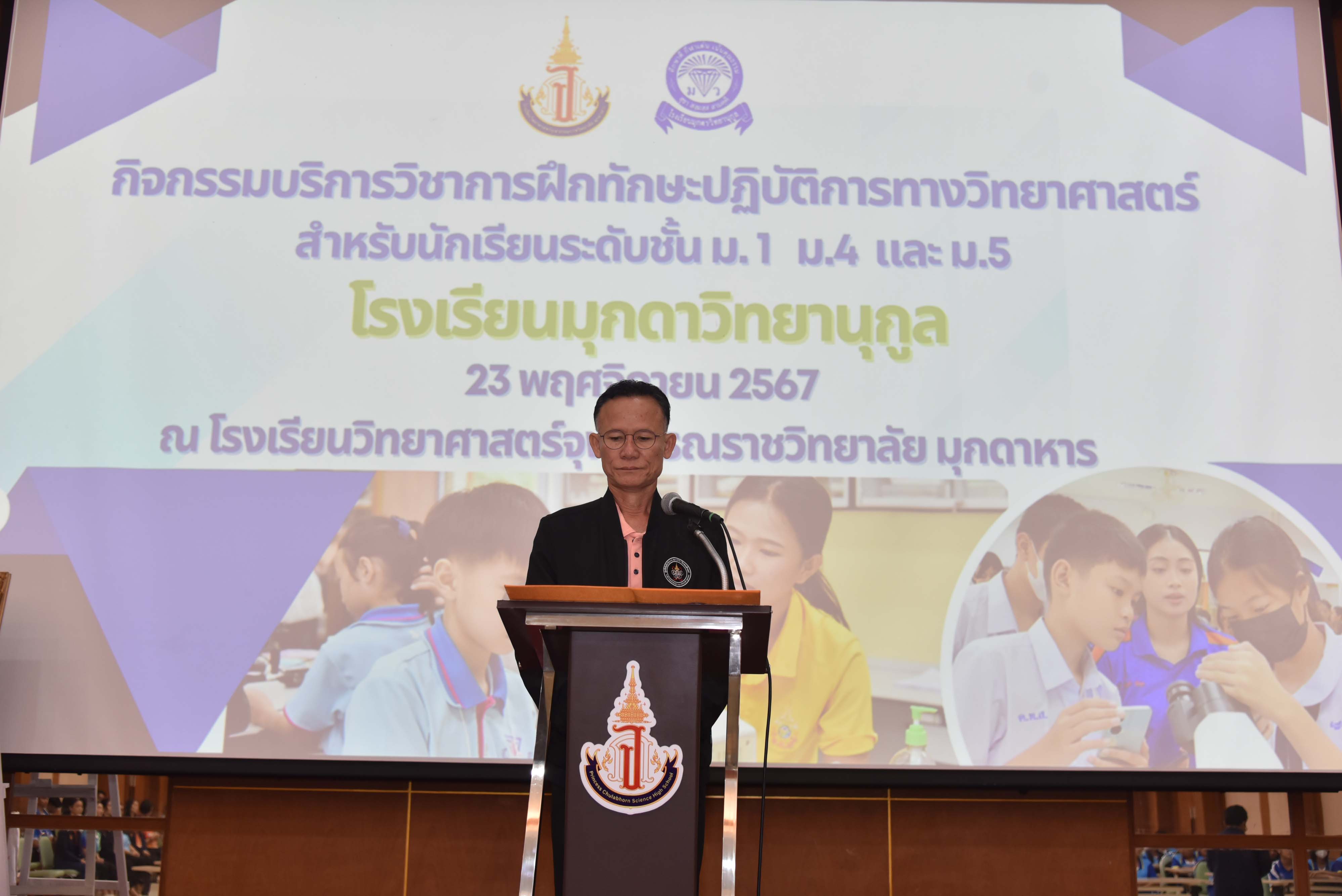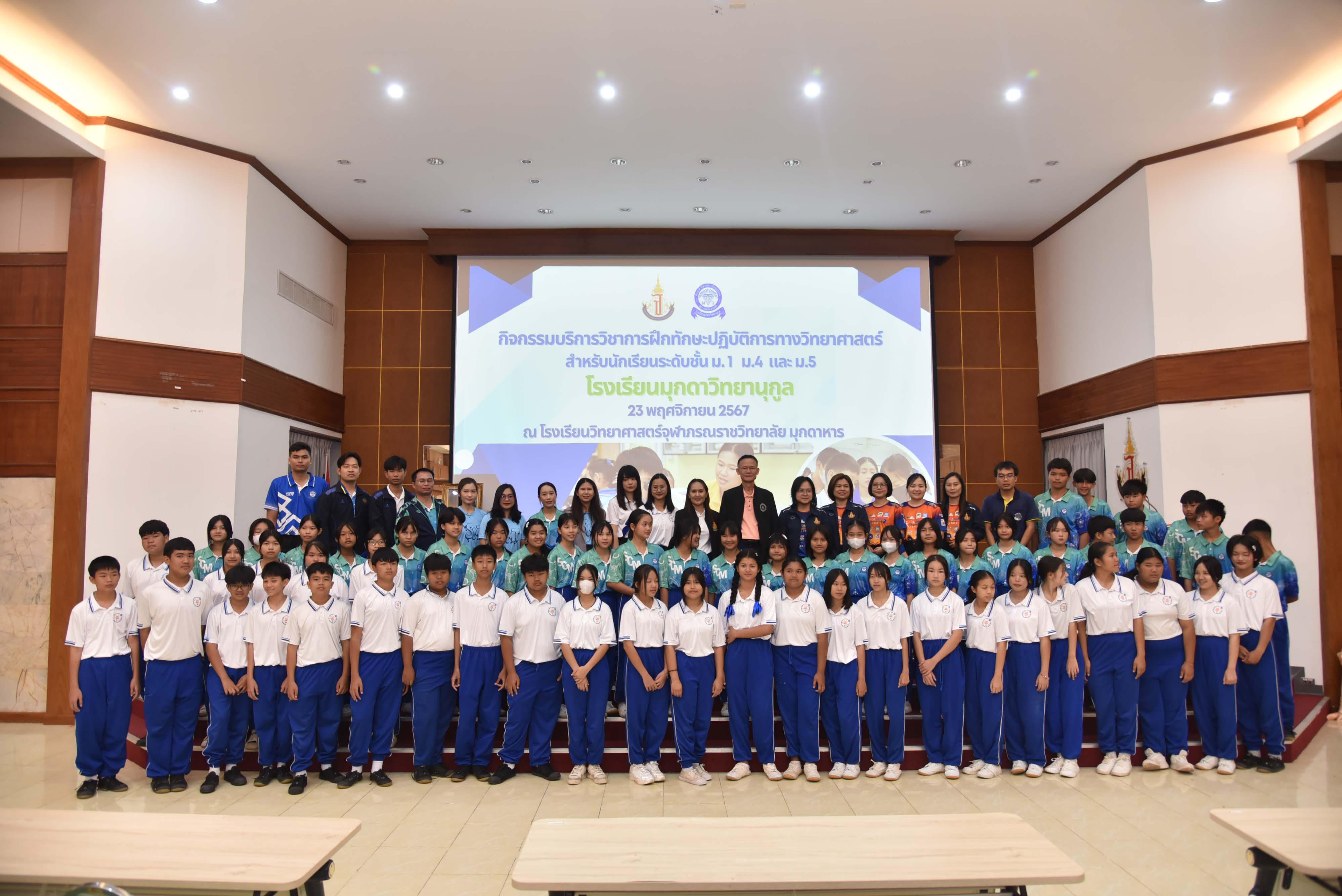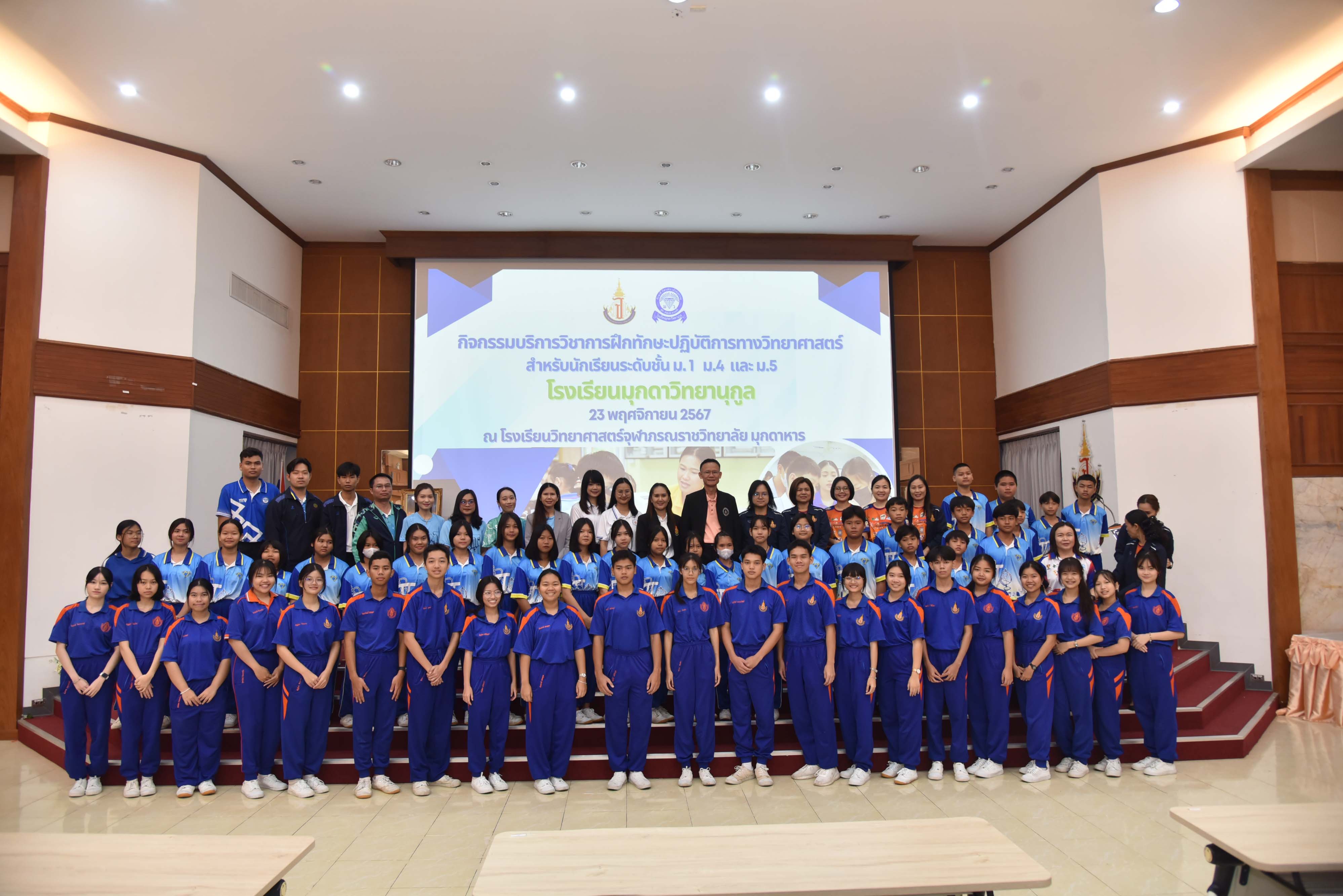 ในวันเสาร์ที่ 23 พฤศจิกายน 2567 08.30 น. นายศักดิ์ รุ่งแสง ผู้อำนวยการโรงเรียนวิทยาศาสตร์จุฬาภรณราชวิทยาลัย มุกดาหาร มอบหมายให้นายประกาศ อ่อนตาม รองผู้อำนวยการโรงเรียนวิทยาศาสตร์จุฬาภรณราชวิทยาลัย มุกดาหาร เป็นประธานในพิธีเปิดกิจกรรมบริการวิชาการ การฝึกทักษะปฏิบัติการทางวิทยาศาสตร์ สำหรับนักเรียนระดับชั้นมัธยมศึกษา จำนวนกว่า 180 คน พร้อมด้วยคณะผู้บริหาร ครู และบุคลากร จากโรงเรียนมุกดาวิทยานุกูล อำเภอเมืองมุกดาหาร จังหวัดมุกดาหาร ณ หอประชุมโรงเรียนวิทยาศาสตร์จุฬาภรณราชวิทยาลัย มุกดาหาร ซึ่งในการบริการวิชาการครั้งนี้ทางโรงเรียนได้แบ่งกิจกรรมออกเป็น 4 ฐาน ได้แก่ กิจกรรมฐานการวิเคราะห์ปริมาณโลหะปนเปื้อนในน้าด้วยเทคนิค Digital Image Colorimetry, กิจกรรมฐานการวิเคราะห์เชิงคุณภาพแคทไอออน , กิจกรรมฐานการหาความยาวคลื่อนของแสง เริ่มจัดกิจกรรมตั้งแต่เวลา 08.30 - 16.00 น.