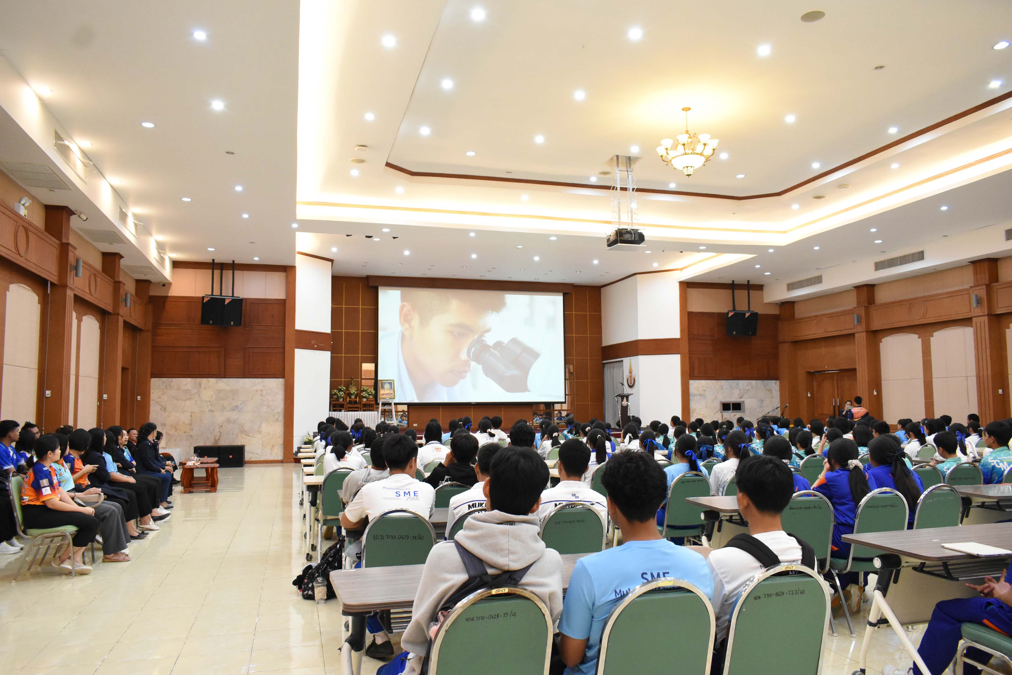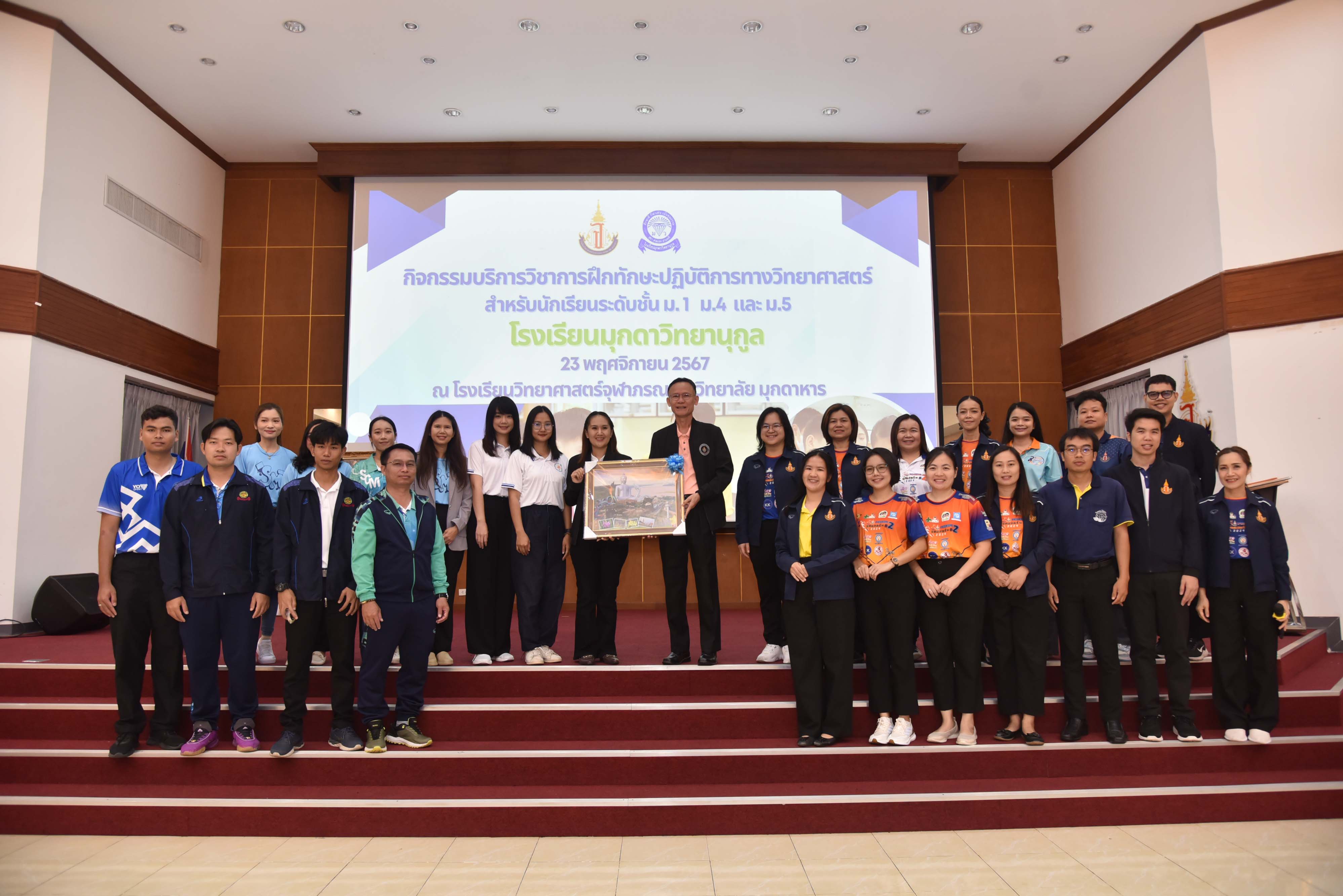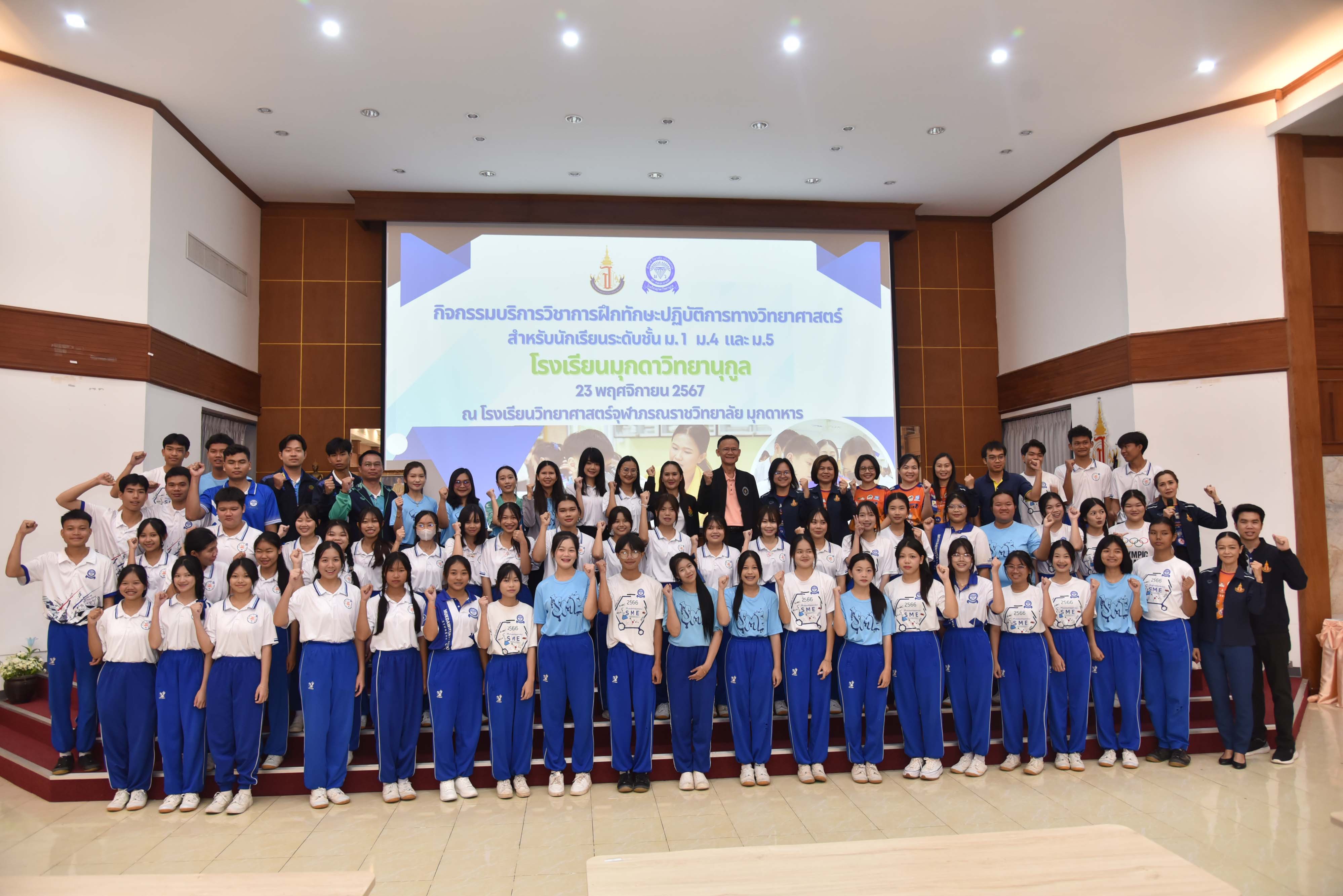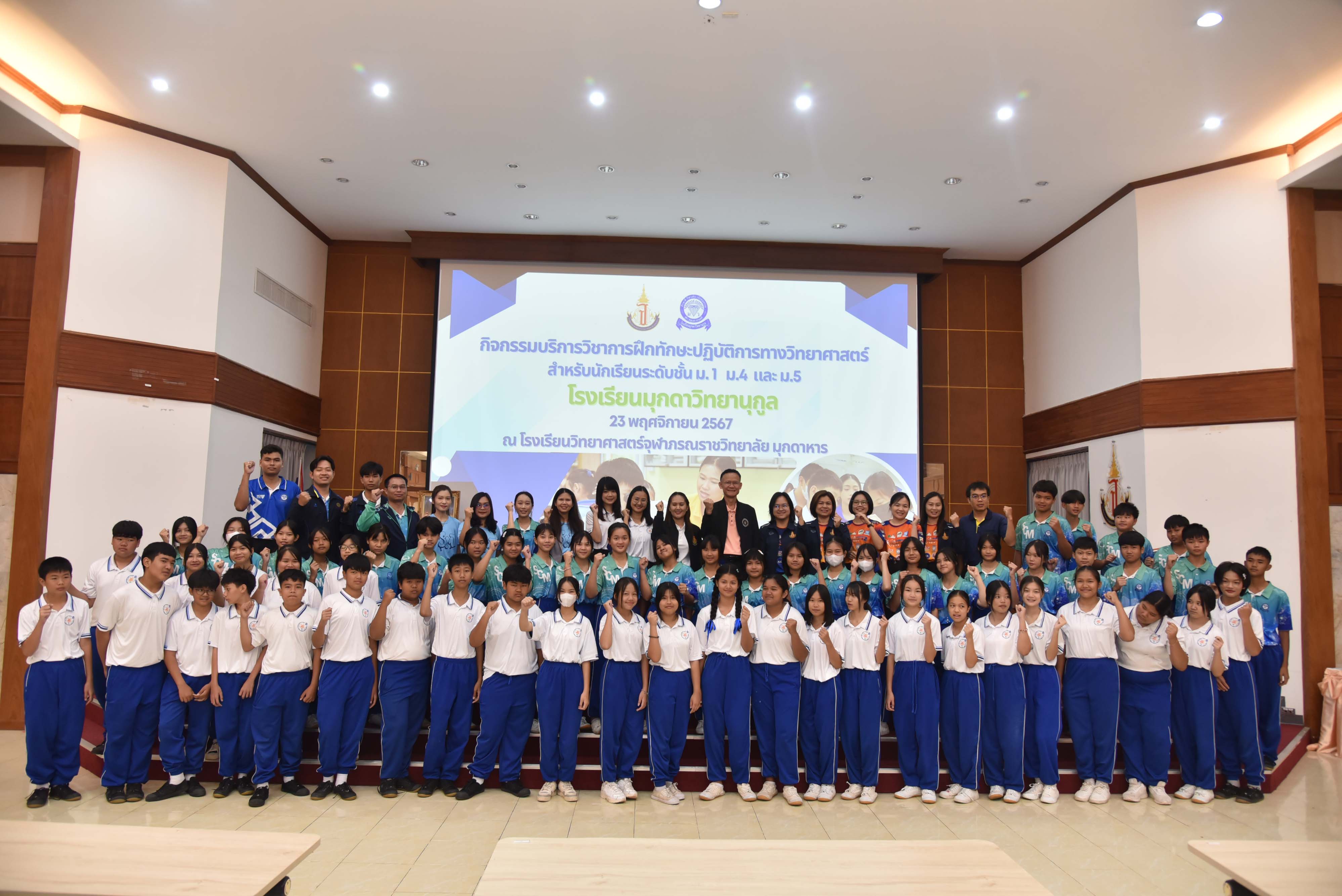 ในวันเสาร์ที่ 23 พฤศจิกายน 2567 08.30 น. นายศักดิ์ รุ่งแสง ผู้อำนวยการโรงเรียนวิทยาศาสตร์จุฬาภรณราชวิทยาลัย มุกดาหาร มอบหมายให้นายประกาศ อ่อนตาม รองผู้อำนวยการโรงเรียนวิทยาศาสตร์จุฬาภรณราชวิทยาลัย มุกดาหาร เป็นประธานในพิธีเปิดกิจกรรมบริการวิชาการ การฝึกทักษะปฏิบัติการทางวิทยาศาสตร์ สำหรับนักเรียนระดับชั้นมัธยมศึกษา จำนวนกว่า 180 คน พร้อมด้วยคณะผู้บริหาร ครู และบุคลากร จากโรงเรียนมุกดาวิทยานุกูล อำเภอเมืองมุกดาหาร จังหวัดมุกดาหาร ณ หอประชุมโรงเรียนวิทยาศาสตร์จุฬาภรณราชวิทยาลัย มุกดาหาร ซึ่งในการบริการวิชาการครั้งนี้ทางโรงเรียนได้แบ่งกิจกรรมออกเป็น 4 ฐาน ได้แก่ กิจกรรมฐานการวิเคราะห์ปริมาณโลหะปนเปื้อนในน้าด้วยเทคนิค Digital Image Colorimetry, กิจกรรมฐานการวิเคราะห์เชิงคุณภาพแคทไอออน , กิจกรรมฐานการหาความยาวคลื่อนของแสง เริ่มจัดกิจกรรมตั้งแต่เวลา 08.30 - 16.00 น.