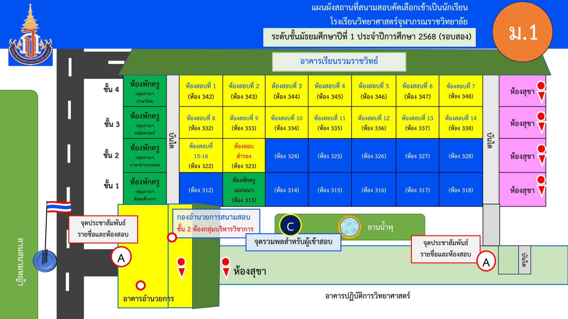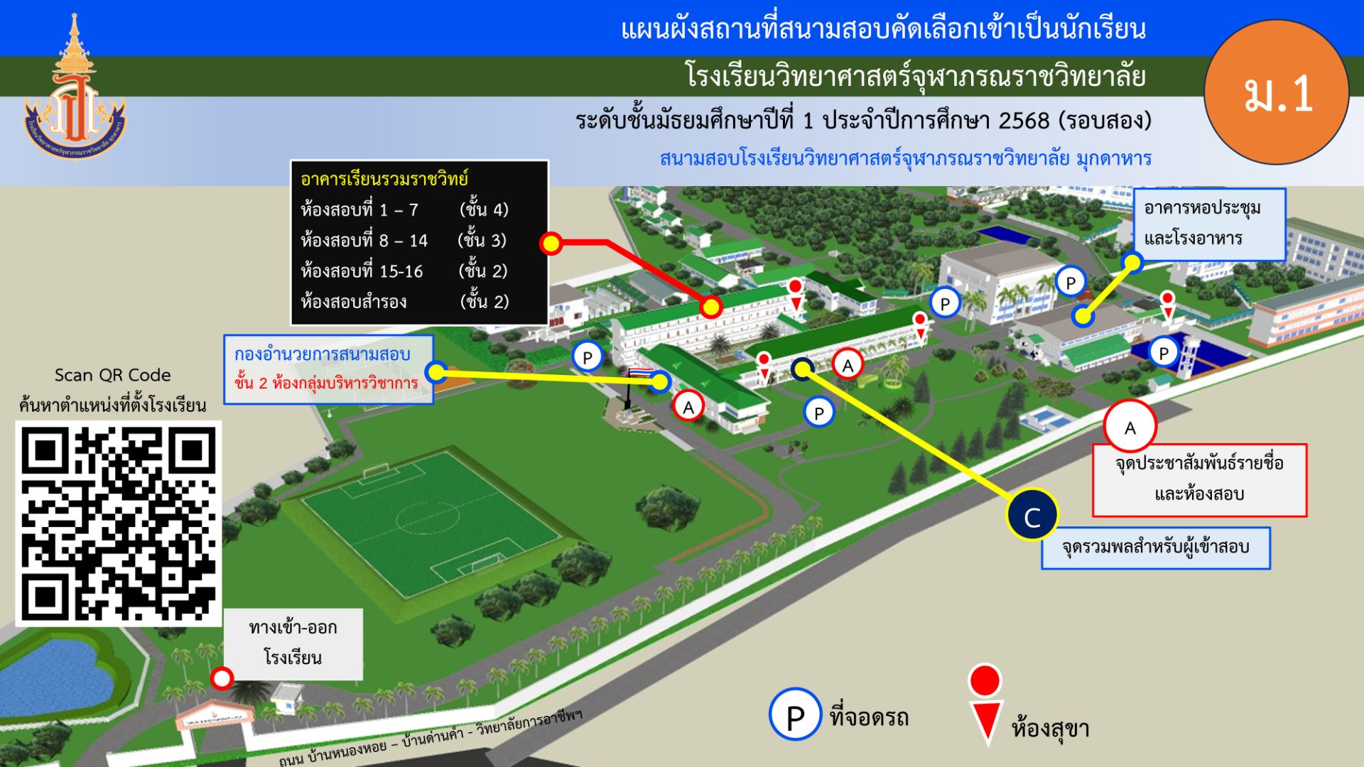 แผนผังสถานที่สอบและระเบียบการเข้าสอบคัดเลือกเข้าเป็นนักเรียน โรงเรียนวิทยาศาสตร์จุฬาภรณราชวิทยาลัย ระดับชั้น ม.1 ประจำปีการศึกษา 2568 (รองสอง)