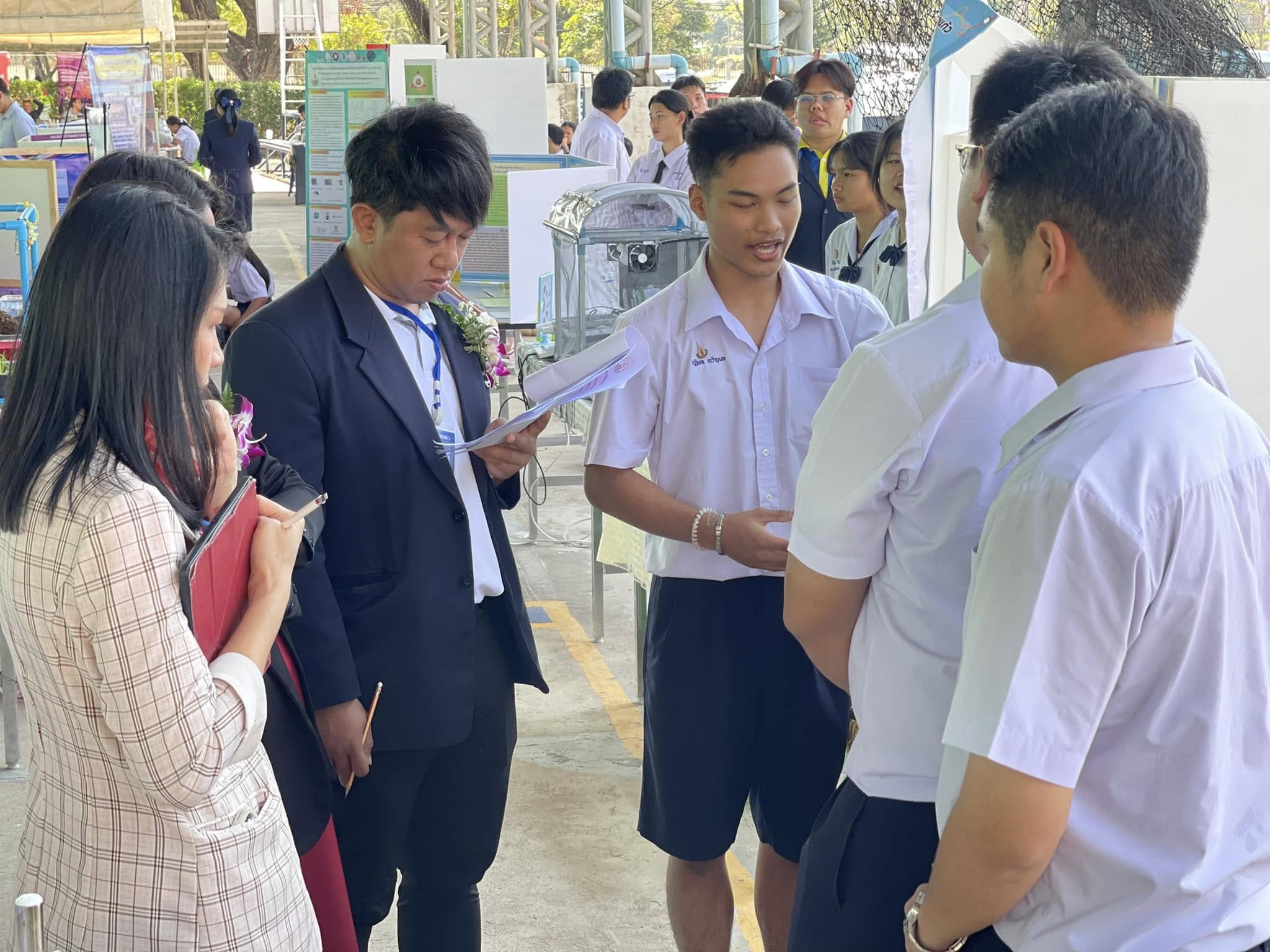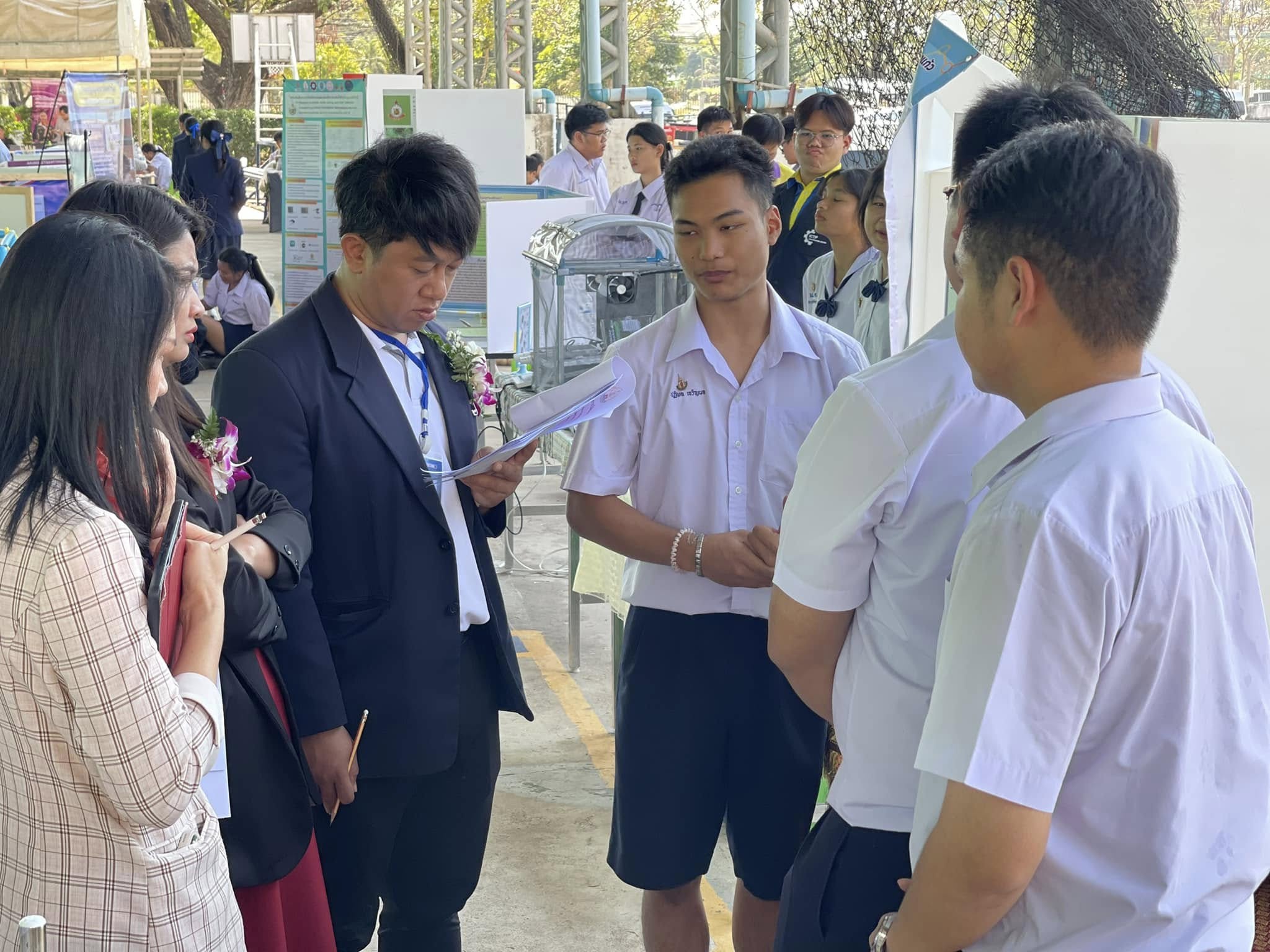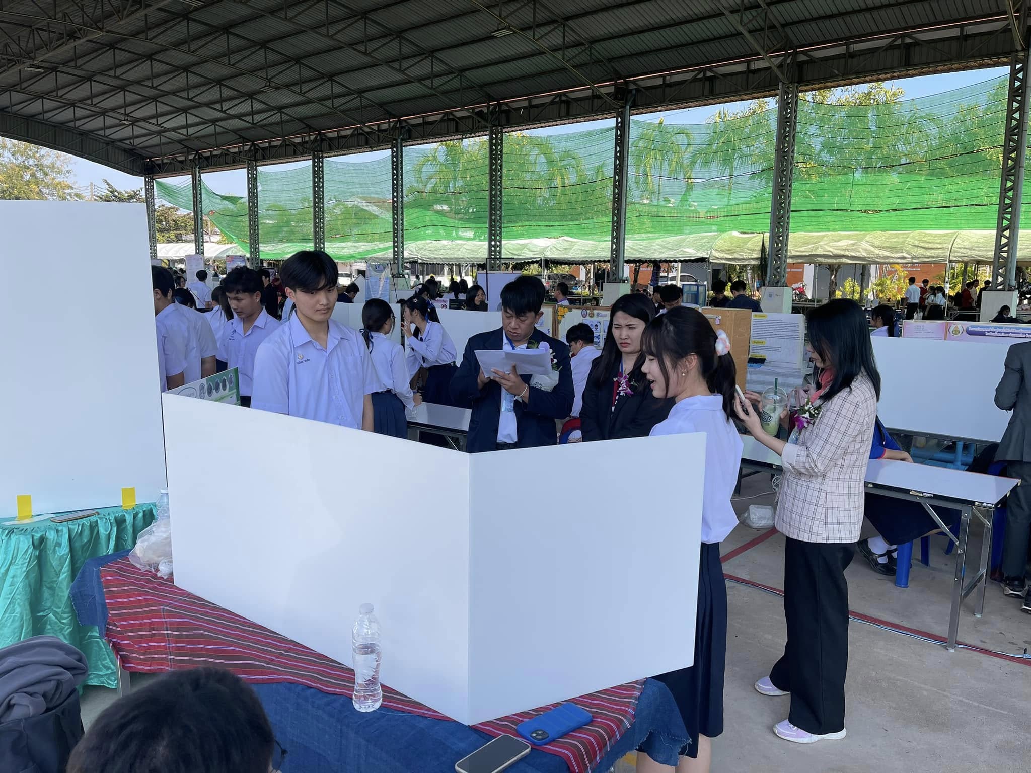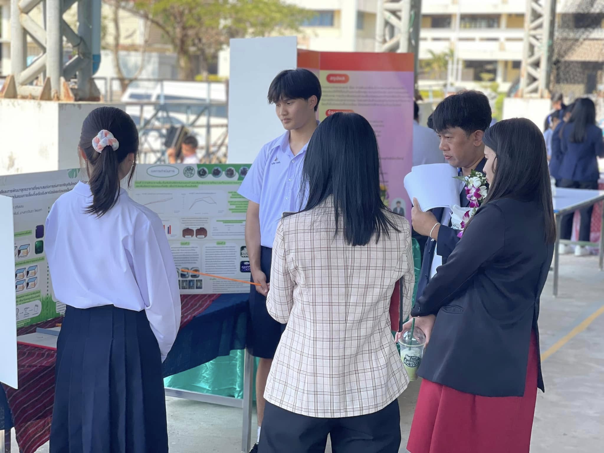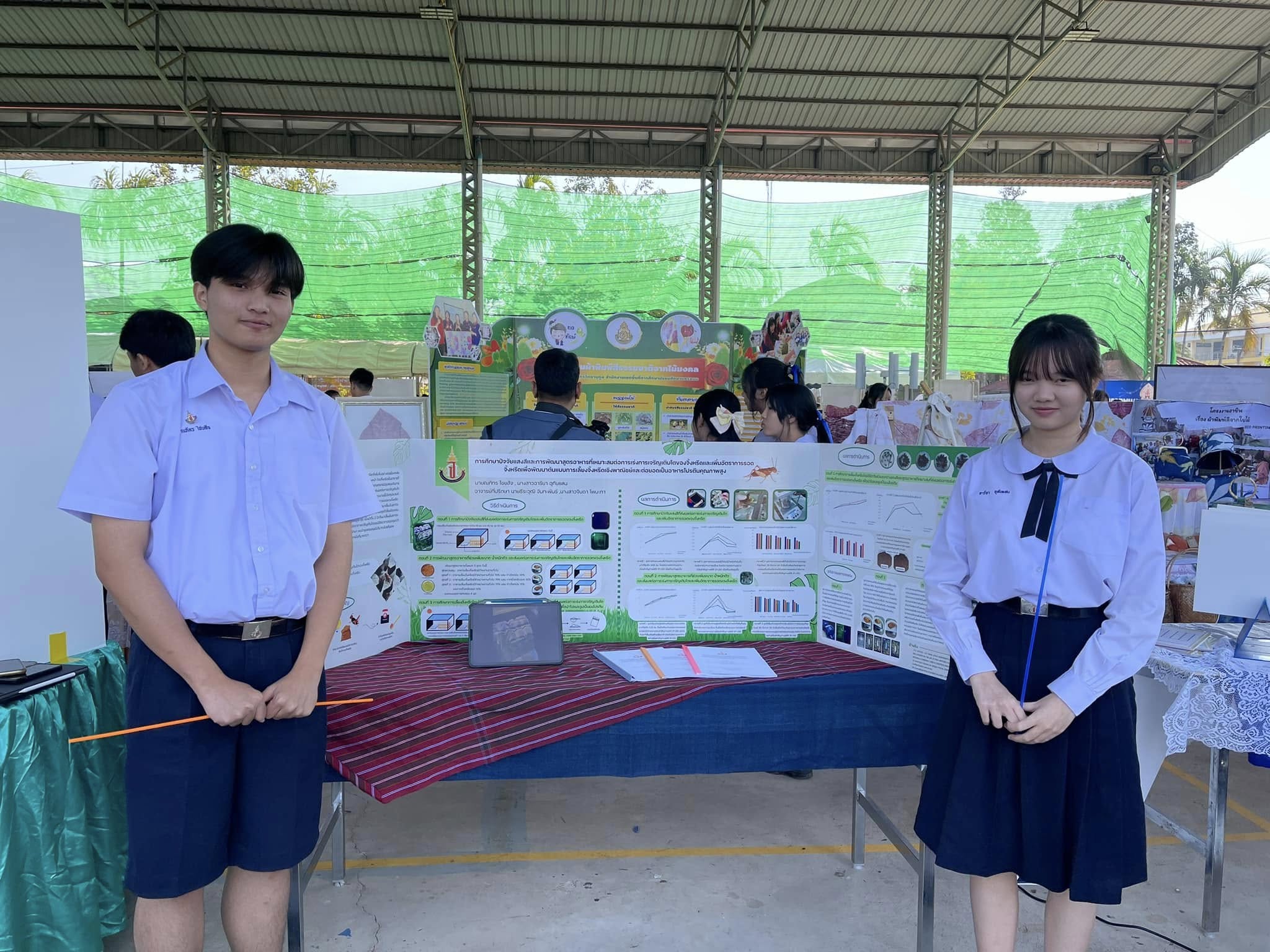 รางวัลเหรียญทอง โครงงานการศึกษาปัจจัยแสงสีและการพัฒนาสูตรอาหารที่เหมาะสมต่อการเร่งการเจริญเติบโตของจิ้งหรีดและเพิ่มอัตราการรอดจิ้งหรีดเพื่อพัฒนาต้นแบบการเลี้ยงจิ้งหรีดเชิงพาณิชย์และต่อยอดเป็นอาหารโปรตีนคุณภาพสูง ผูพัฒนาผลงาน นายณภัทร ไชยสัจ และนางสาวอารียา อุทัยแสน ครูที่ปรึกษา