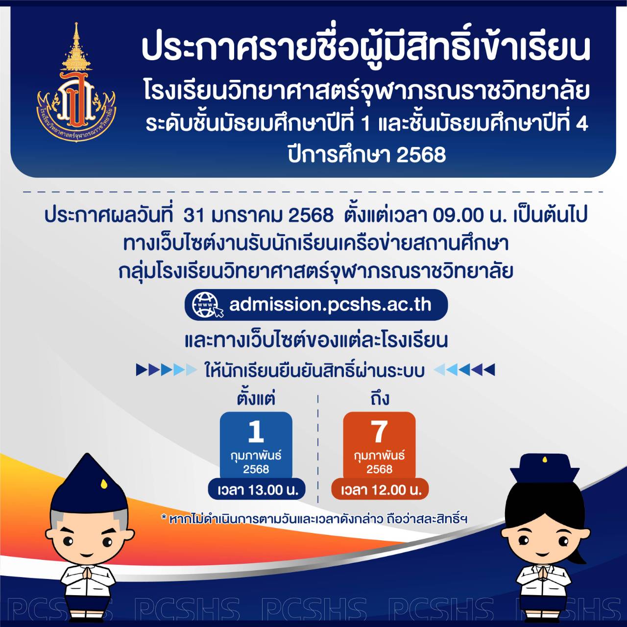 ให้นักเรียนที่มีรายชื่อเป็นผู้มีสิทธิ์เข้าเรียนชั้นมัธยมศึกษาปีที่ 1 และชั้นมัธยมศึกษาปีที่ 4 โรงเรียนวิทยาศาสร์จุฬาภรณราชวิทยาลัย มุกดาหาร ปีการศึกษา 2568 ตัวจริง รายงานตัวและยืนยันสิทธิ์ออนไลน์ ตั้งแต่วันที่ 1 กุมภาพันธ์ 2568 เวลา 13.00 น. ถึงวันที่ 7 กุมภาพันธ์ 2568 เวลา 12.00 น. ที่เว็บไซต์ https://apply.pcshs.ac.th/Admission/login