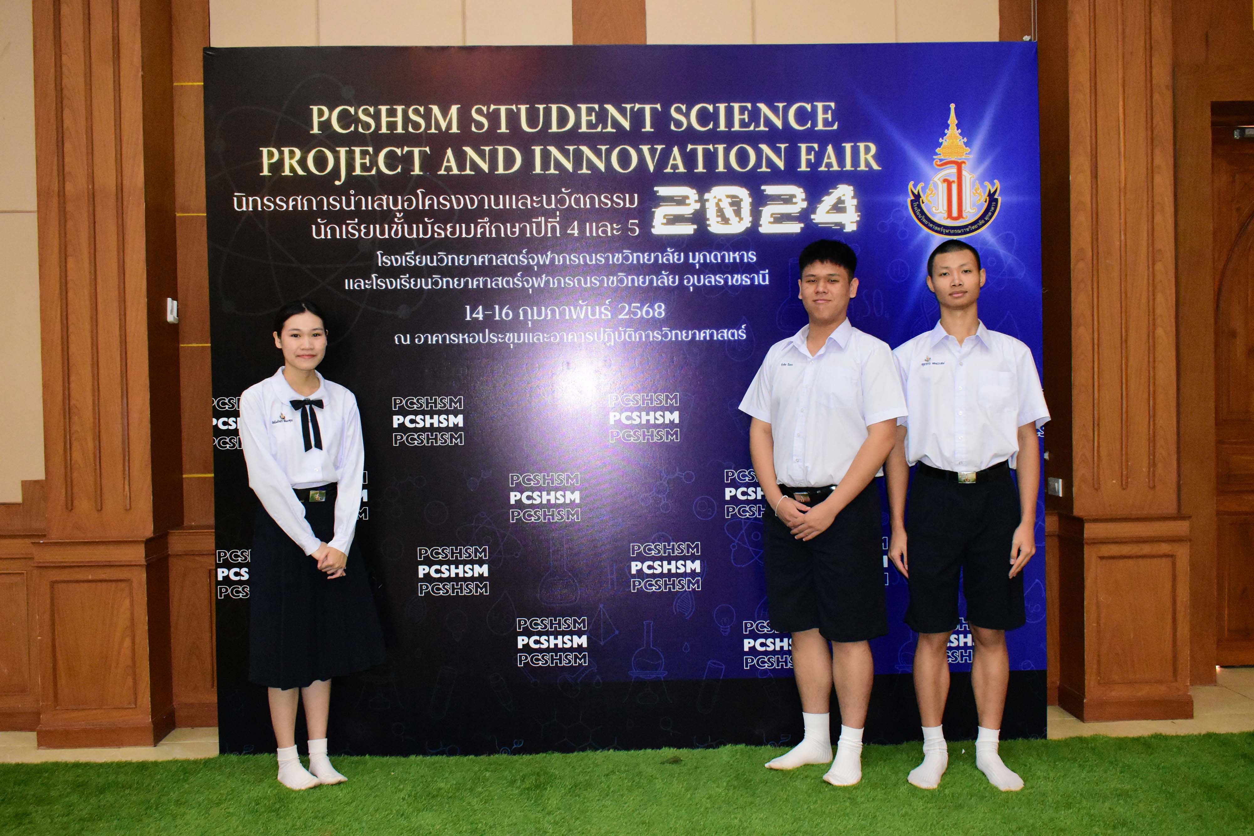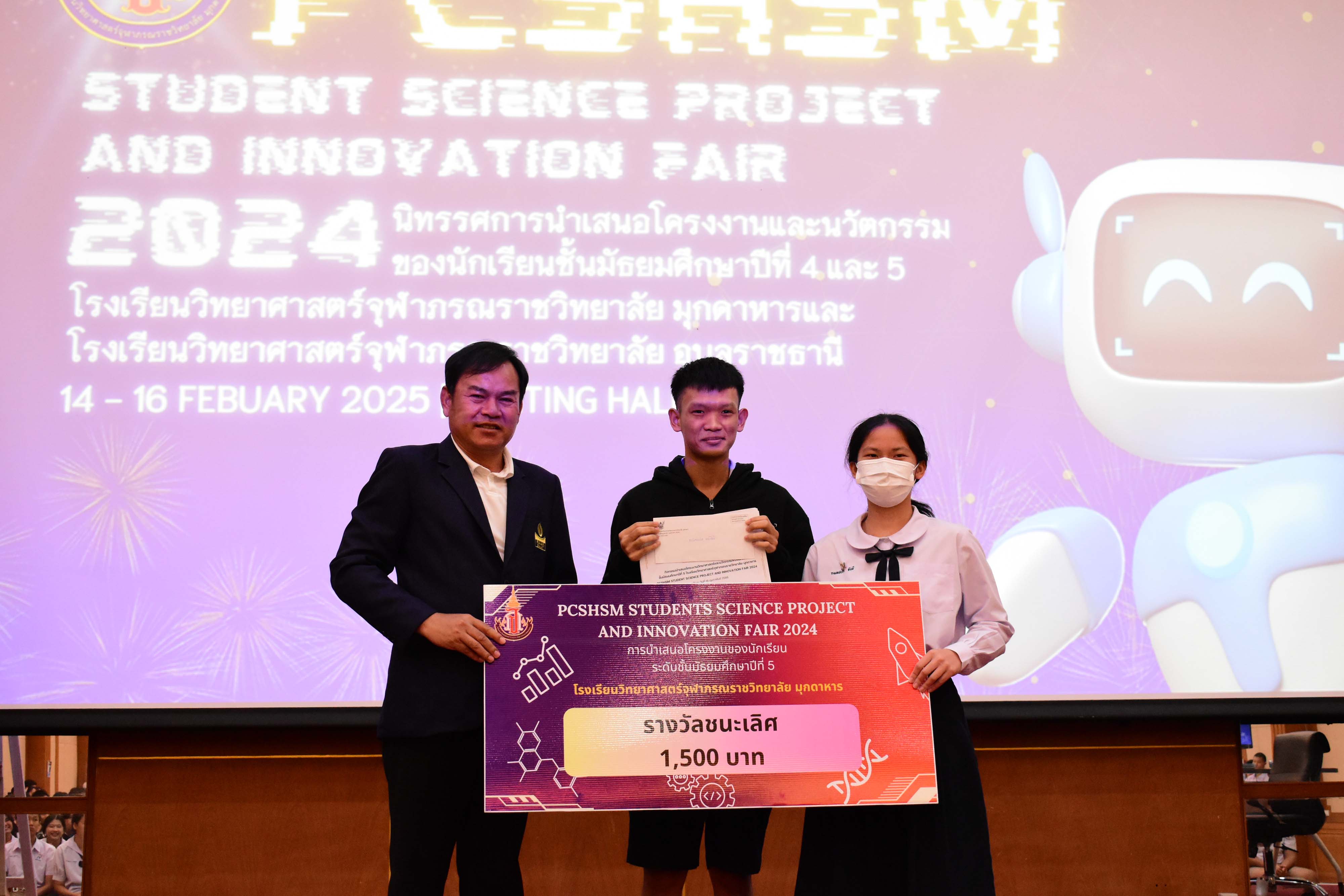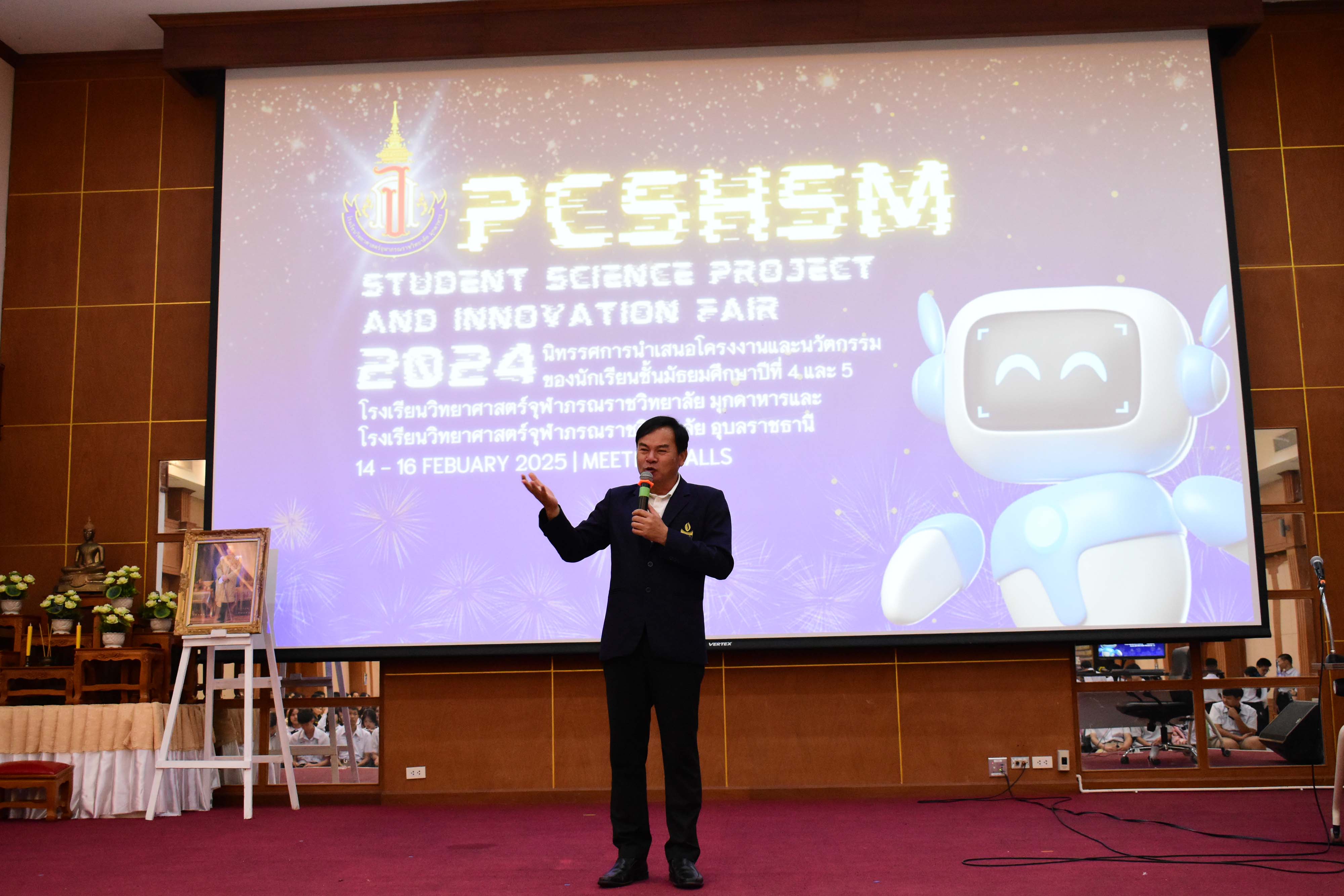 งานส่งเสริมพัฒนาโครงงานนวัตกรรมนักเรียนและสะเต็มศึกษา กลุ่มสาระการเรียนรู้วิทยาศาสตร์และเทคโนโลยี และนักเรียนระดับชั้นมัธยมศึกษาปีที่ 5 ร่วมกับโรงเรียนวิทยาศาสตร์จุฬาภรณราชวิทยาลัย มุกดาหาร จัดงานการนำเสนอโครงงานและนวัตกรรมนักเรียน PCSHSM Student Science Project and Innovation 2024 ระหว่างวันที่ 14 ถึง 16 กุมภาพันธ์ พ.ศ. 2568 ในการจัดงานครั้งนี้นายศักดิ์ รุ่งแสง ผู้อำนวยการโรงเรียนวิทยาศาสตร์จุฬาภรณราชวิทยาลัย มุกดาหาร ได้ให้เกียรติมาเป็นประธานกล่าวเปิดงานและมอบรางวัล ภายในงานมีการนำเสนอนวัตกรรมของนักเรียนชั้นมัธยมศึกษาปีที่ 4 และการนำเสนอโครงงาน ของนักเรียนชั้นมัธยมศึกษาปีที่ 5 โรงเรียนวิทยาศาสตร์จุฬาภรณราชวิทยาลัย มุกดาหาร และโรงเรียนวิทยาศาสตร์จุฬาภรณราชวิทยาลัย อุบลราชธานี โดยได้รับความอนุเคราะห์จากคณาจารย์จากมหาวิทยาลัยพี่เลี้ยง มาร่วมวิพากษ์และตัดสินโครงงาน นอกจากนี้ยังได้รับเกียรติจากคุณครูขุนทอง คล้ายทอง ครูจากโรงเรียนวิทยาศาสตร์จุฬาภรณราชวิทยาลัย ปทุมธานี มาเป็น Keynote Speaker สร้างแรงบันดาลใจให้แก่น้องๆโรงเรียนวิทยาศาสตร์จุฬาภรณราชวิทยาลัย และน้องๆจากโรงเรียนโพธิ์ไทรวิทยา โรงเรียนหนองสูงสามัคคีวิทยา โรงเรียนคำชะอีวิทยาคาร เพื่อนำไปปรับใช้ในการทำโครงงานให้ประสบผลสำเร็จต่อไป