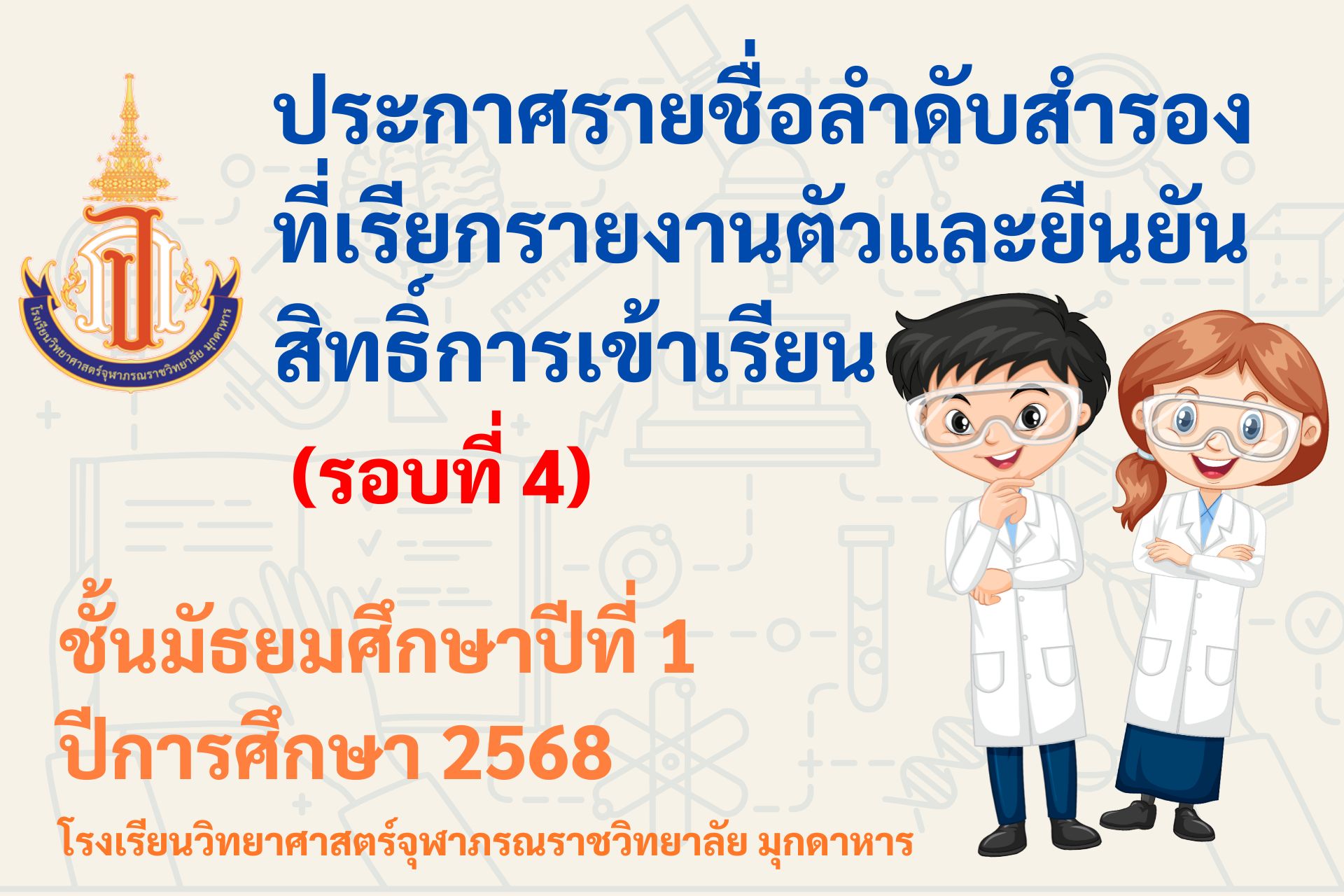 ประกาศรายชื่อลำดับสำรองที่เรียกรายงานตัวและยืนยันสิทธิ์การเข้าเรียน ม.1 โรงเรียนวิทยาศาสตร์จุฬาภรณราชวิทยาลัย มุกดาหาร ปีการศึกษา 2568 (รอบที่ 4)