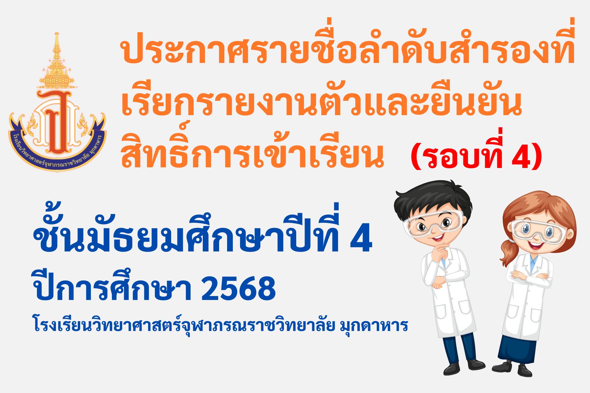 ประกาศรายชื่อลำดับสำรองที่เรียกรายงานตัวและยืนยันสิทธิ์การเข้าเรียน ม.4 โรงเรียนวิทยาศาสตร์จุฬาภรณราชวิทยาลัย มุกดาหาร ปีการศึกษา 2568 (รอบที่ 4)