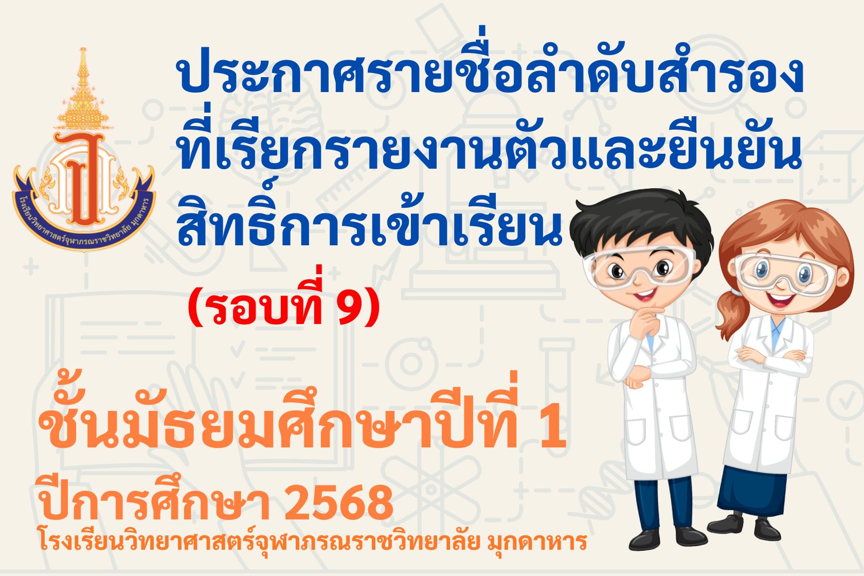 ประกาศรายชื่อลำดับสำรองที่เรียกรายงานตัวและยืนยันสิทธิ์การเข้าเรียน ม.1 โรงเรียนวิทยาศาสตร์จุฬาภรณราชวิทยาลัย มุกดาหาร ปีการศึกษา 2568 (รอบที่ 9)