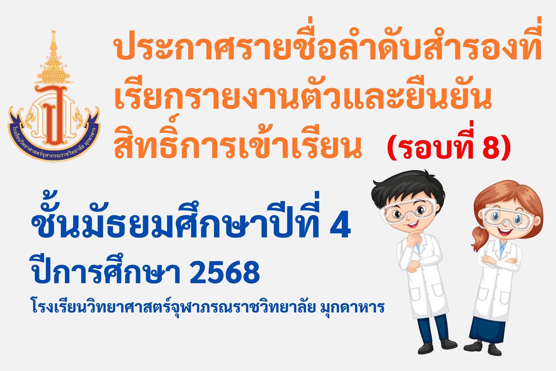 ประกาศรายชื่อลำดับสำรองที่เรียกรายงานตัวและยืนยันสิทธิ์การเข้าเรียน ม.4 โรงเรียนวิทยาศาสตร์จุฬาภรณราชวิทยาลัย มุกดาหาร ปีการศึกษา 2568 (รอบที่ 8)