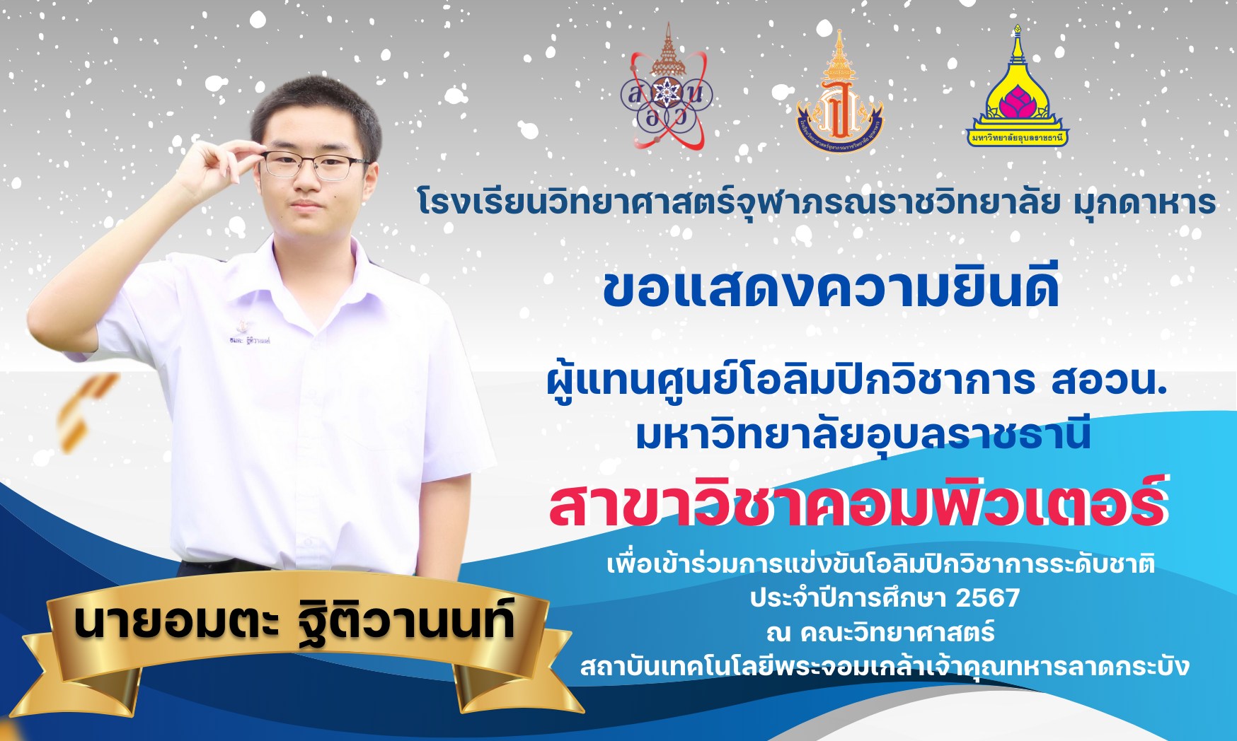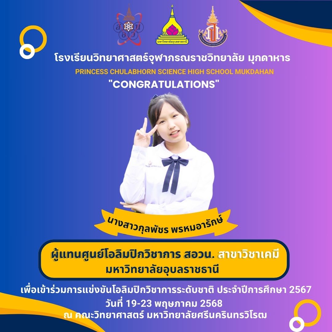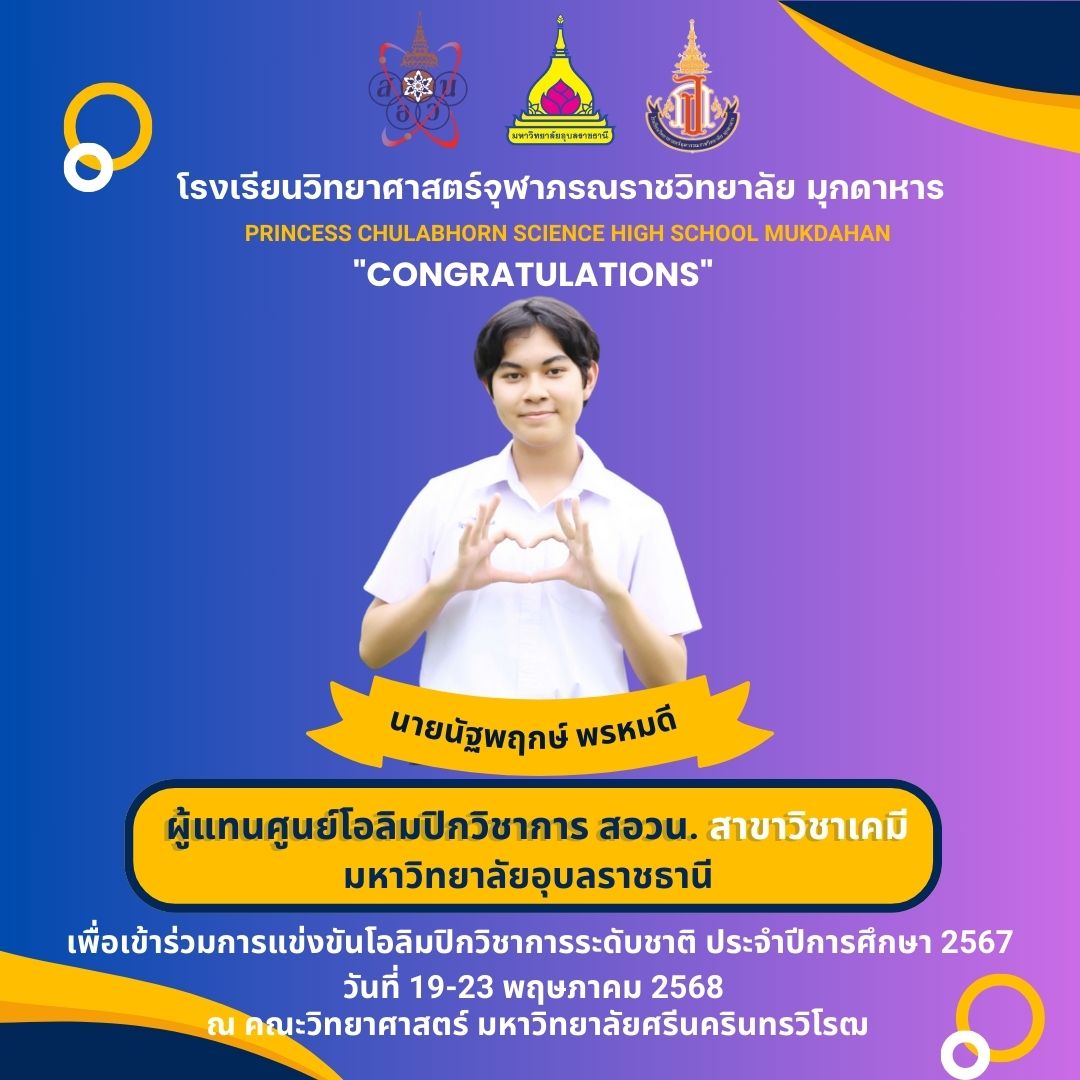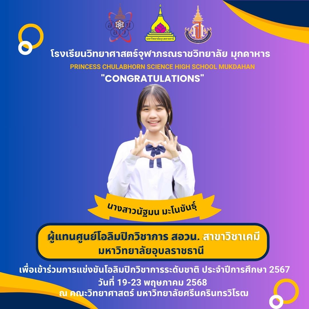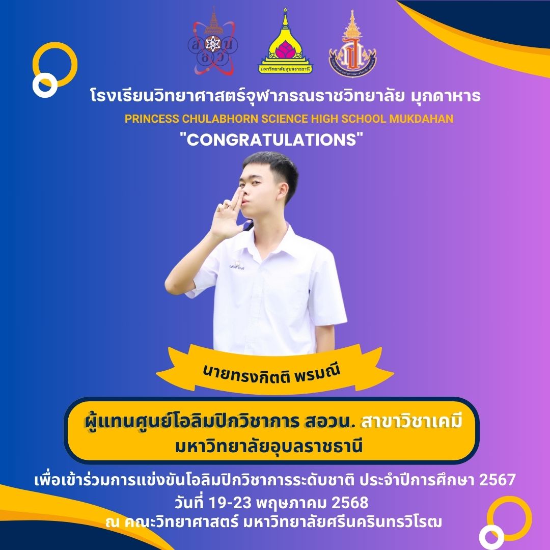 แสดงความยินดีกับที่ได้เป็นผู้แทนศูนย์โอลิมปิกวิชาการ สอวน. มหาวิทยาลัยอุบลราชธานี เพื่อเข้าร่วมการแข่งขันโอลิมปิกเคมีระดับชาติ ประจำปีการศึกษา 2567