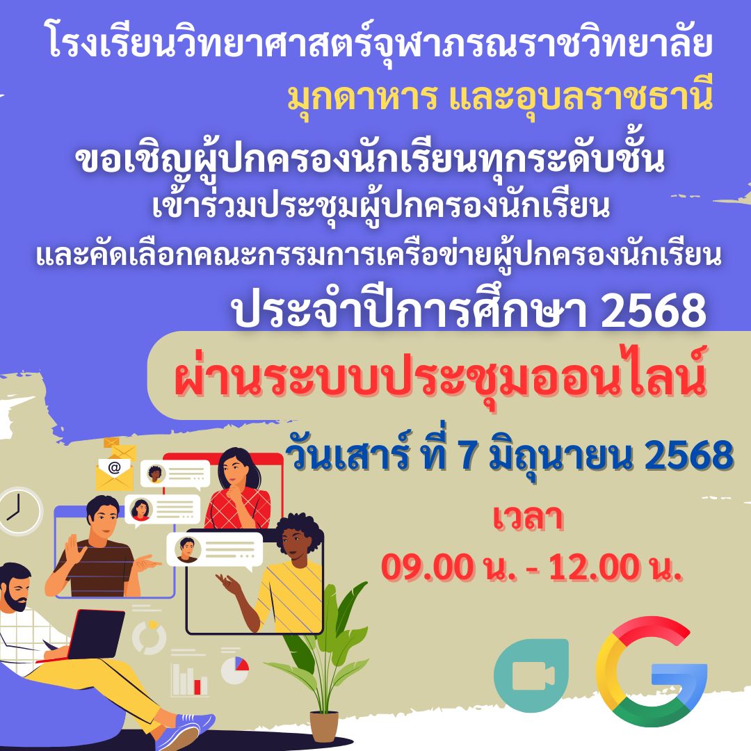 โรงเรียนวิทยาศาสตร์จุฬาภรณราชวิทยาลัย มุกดาหาร และอุบลราชธานี ขอเชิญผู้ปกครองนักเรียนทุกระดับชั้น เข้าร่วมประชุมผู้ปกครองนักเรียนประจำปีการศึกษา 2568 ผ่านระบบประชุมออนไลน์ วันเสาร์ที่ 7 มิถุนายน 2568 เวลา 09.00 - 12.00 น