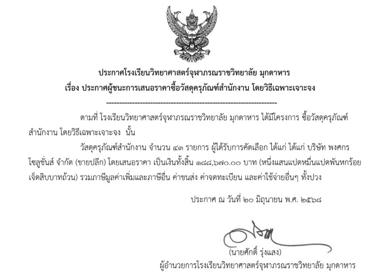 ประกาศผู้ชนะการเสนอราคาซื้อวัสดุครุภัณฑ์สำนักงาน โดยวิธีเฉพาะเจาะจง
