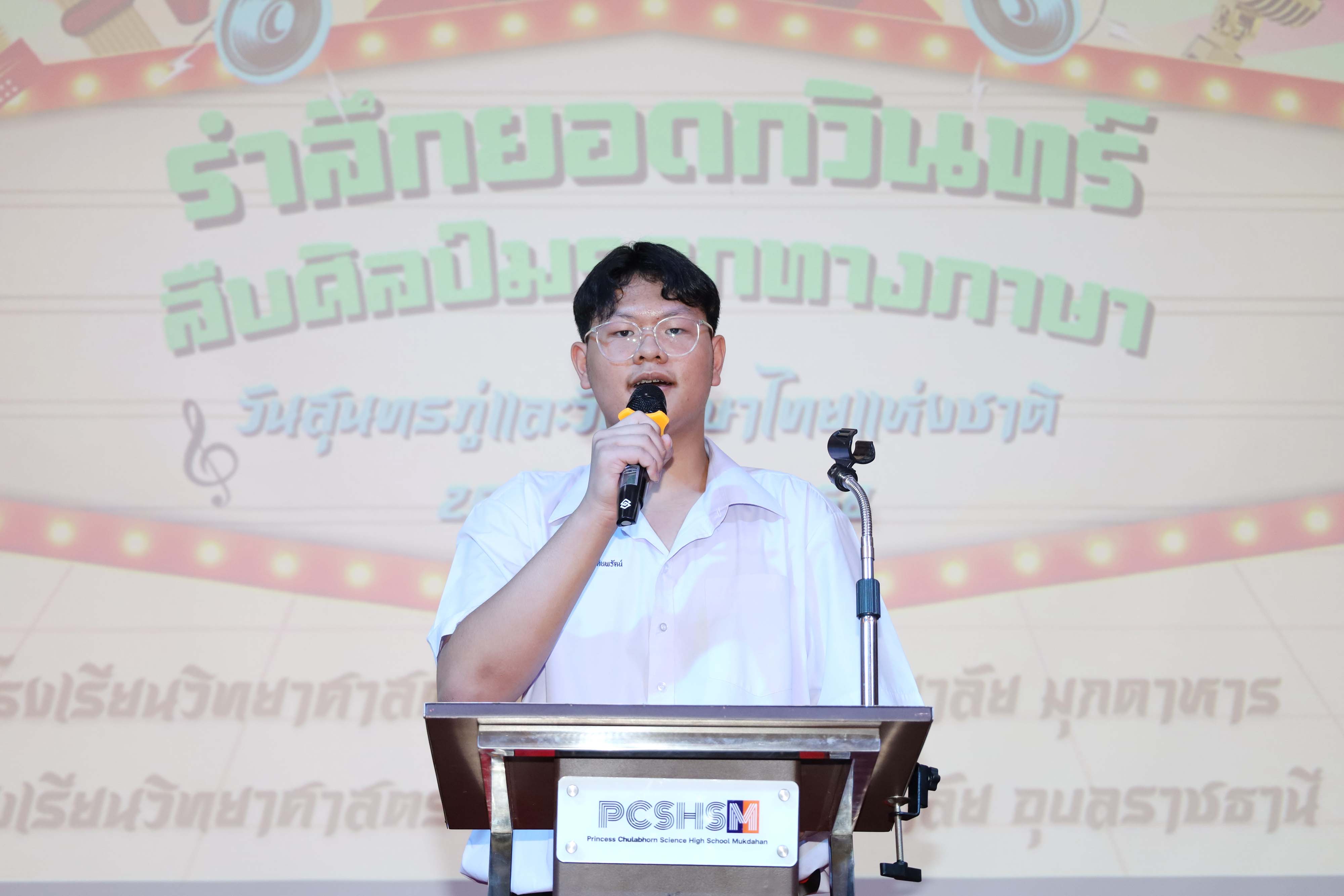 ในวันพฤหัสบดีที่ 26 มิถุนายน พ.ศ. 2568 เวลา 08.00 น. นายศักดิ์ รุ่งแสง ผู้อำนวยการโรงเรียนวิทยาศาสตร์จุฬาภรราชวิทยาลัย มุกดาหาร เป็นประธานในพิธีบวงสรวงสักการะดวงวิญญาณสุนทรภู่กวีเอกของโลก อ่านคำกล่าวบวงสรวง เพื่อเป็นการสักการะดวงวิญญาณของพระสุนทรโวหาร(สุนทรภู่) ซึ่งเป็นกวีเอกของไทยและของโลก ประจำปีการศึกษา 2568 ณ บริเวณสนามจัดกิจกรรมหน้าเสาธงชาติ และในเวลา 13.00 น. นางสาวเสาวคนธ์ ฉัตรวิไล รองผู้อำนวยการโรงเรียนวิทยาศาสตร์จุฬาภรราชวิทยาลัย มุกดาหาร ได้เป็นประธานกล่าวเปิดงานกิจกรรมวันภาษาไทยแห่งชาติ ประจำปีการศึกษา 2568 ณ หอประชุมโรงเรียนทยาศาสตร์จุฬาภรราชวิทยาลัย มุกดาหาร ภายในงานมีกิจกรรมการแสดงโขน การแสดงของคณะแสดง 4 คณะ การประกวดวาดภาพ การแต่งกลอน และการออกบูธขายอาหาร ขนมไทย ไอติม เครื่องดื่ม ของลูกๆนักเรียน