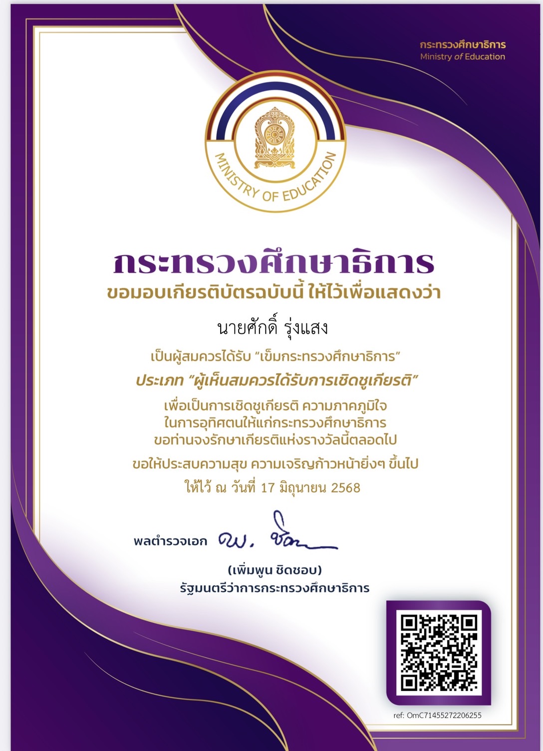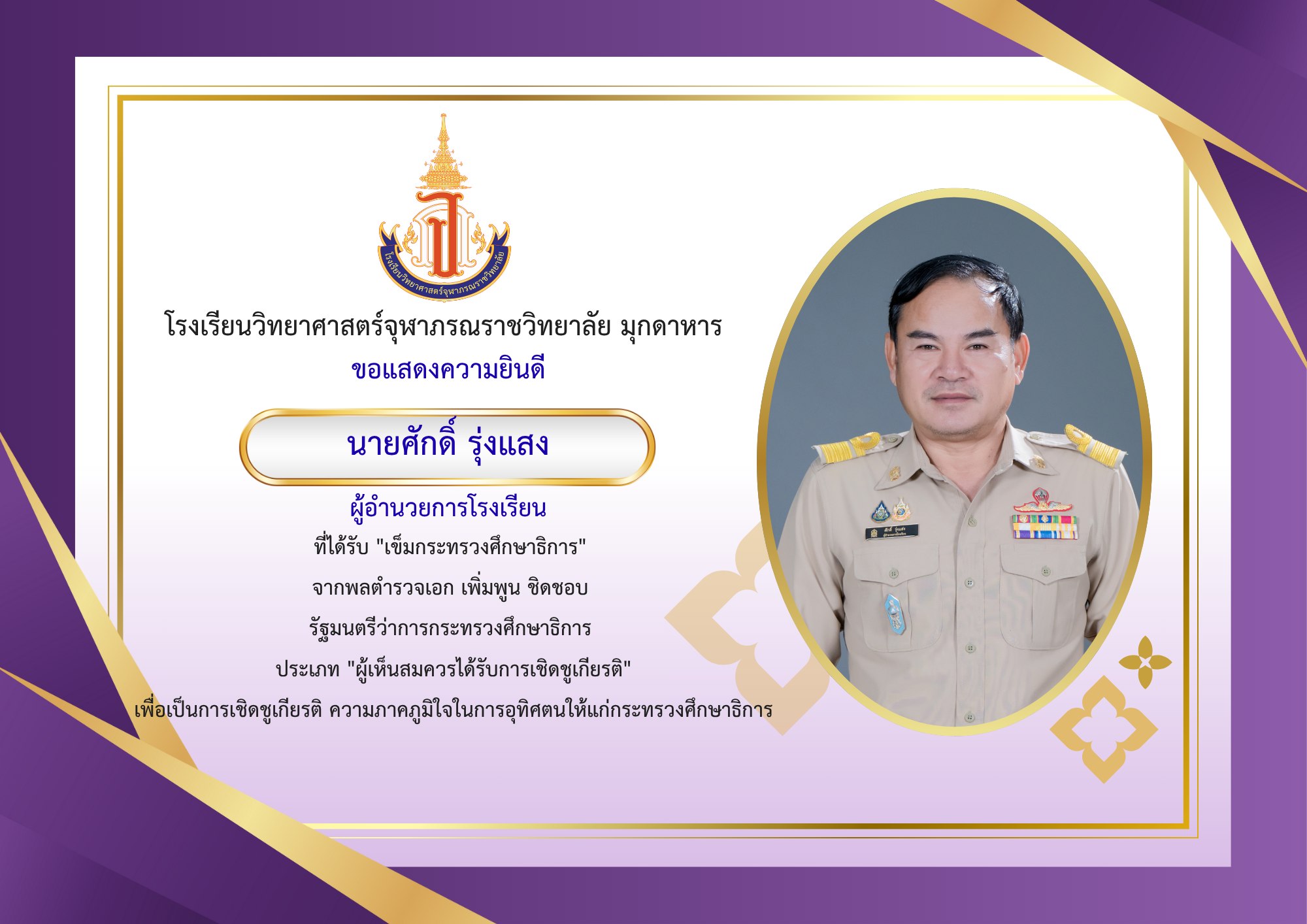 ขอแสดงความยินดีกับ นายศักดิ์ รุ่งแสง ผู้อำนวยการโรงเรียนวิทยาศาสตร์จุฬาภรณราชวิทยาลัย มุกดาหาร ที่ได้รับ เข็มกระทรวงศึกษาธิการ