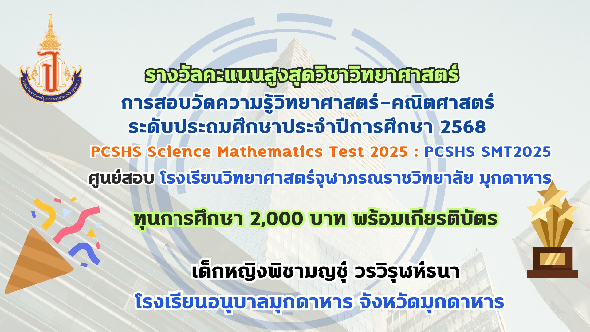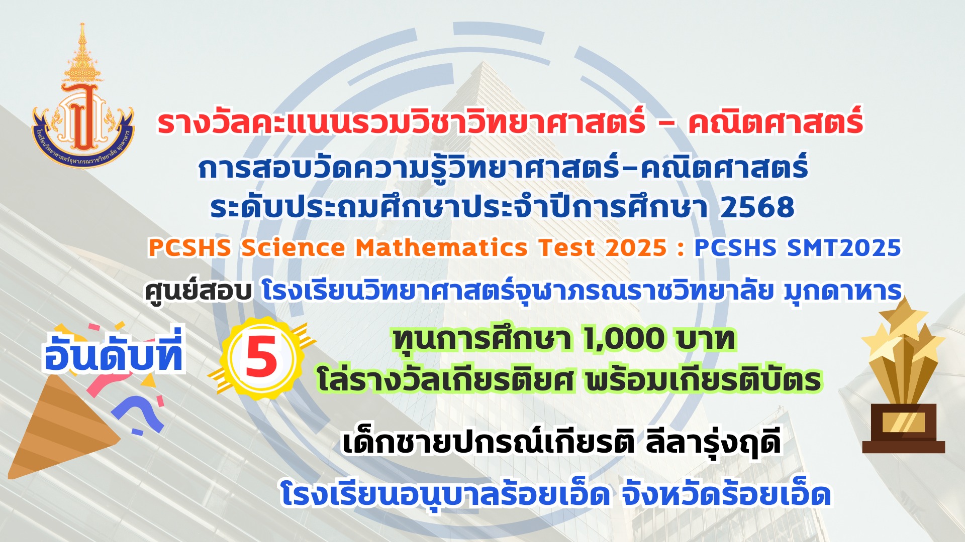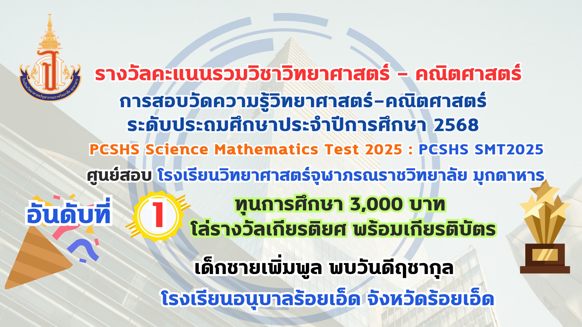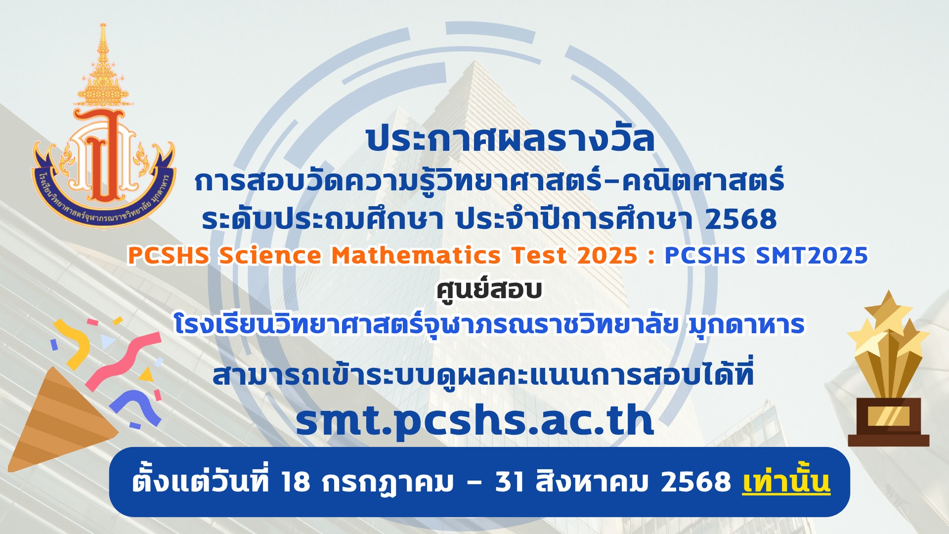 โรงเรียนวิทยาศาสตร์จุฬาภรณราชวิทยาลัย มุกดาหาร ประกาศผลรางวัลการสอบวัดความรู้วิทยาศาสตร์-คณิตศาสตร์ ระดับประถมศึกษา ประจำปีการศึกษา 2568 PCSHS Science Mathematics Test 2025 : PCSHS SMT2025 ศูนย์สอบ โรงเรียนวิทยาศาสตร์จุฬาภรณราชวิทยาลัย มุกดาหาร สามารถเข้าระบบดูผลคะแนนการสอบได้ที่ https://smt.pcshs.ac.th ตั้งแต่วันที่ 18 กรกฏาคม - 31 สิงหาคม 2568 เท่านั้น