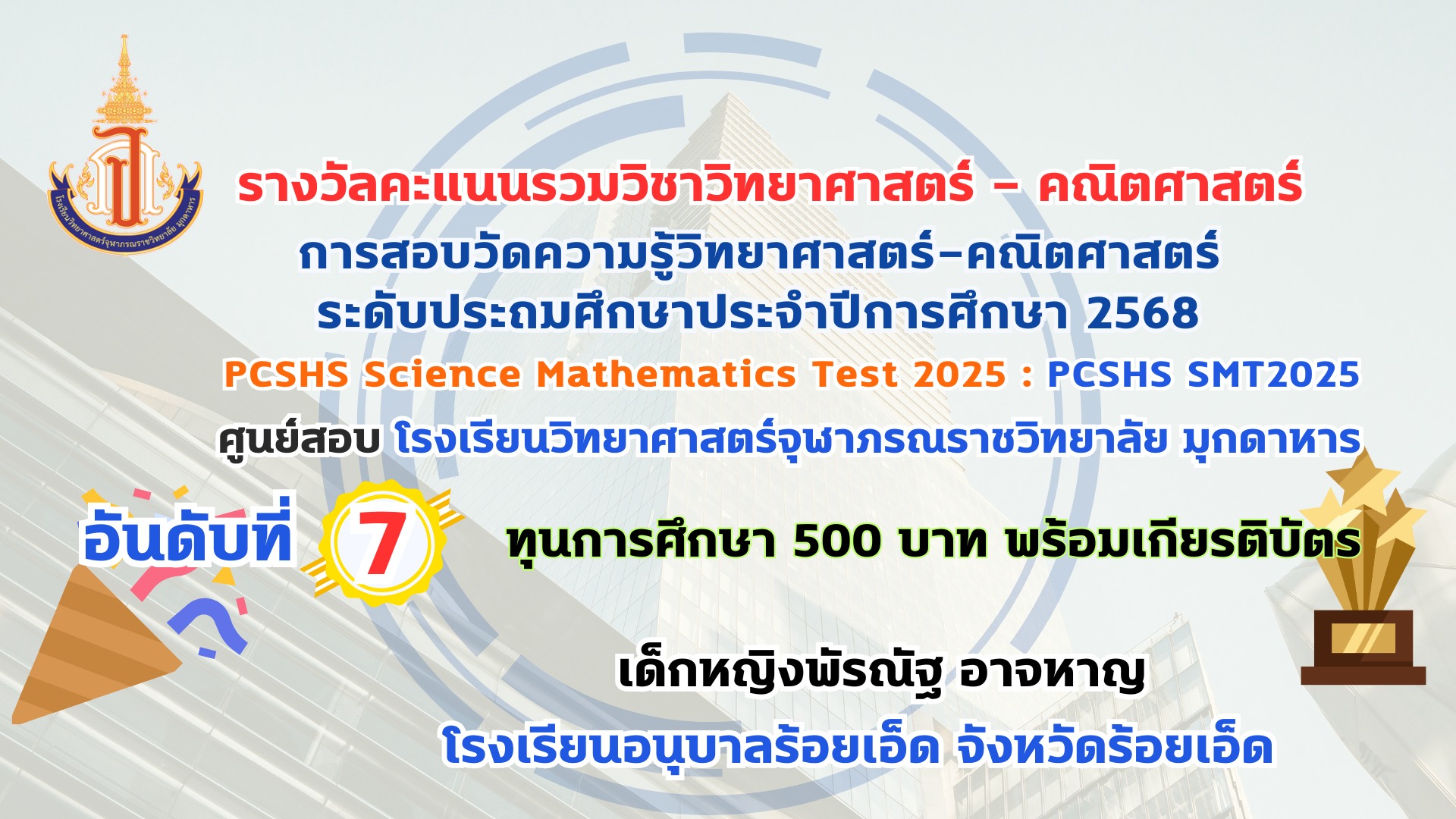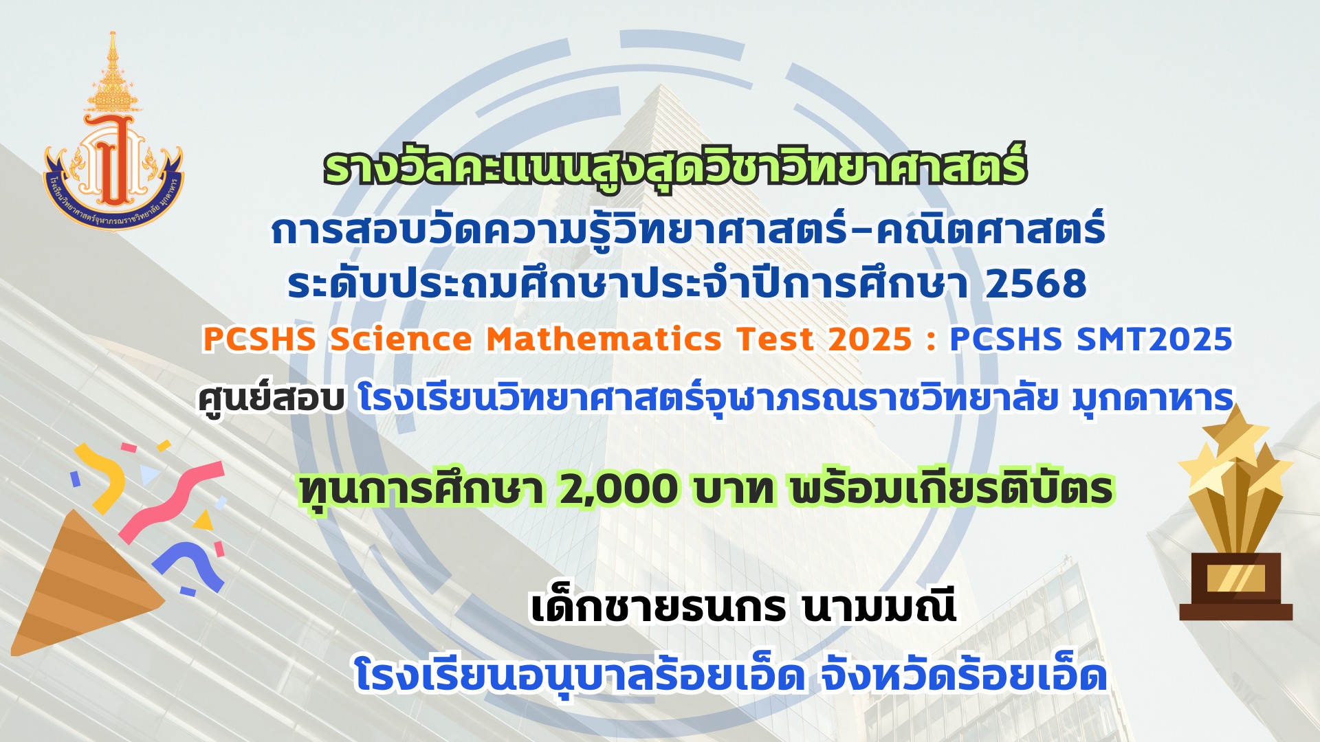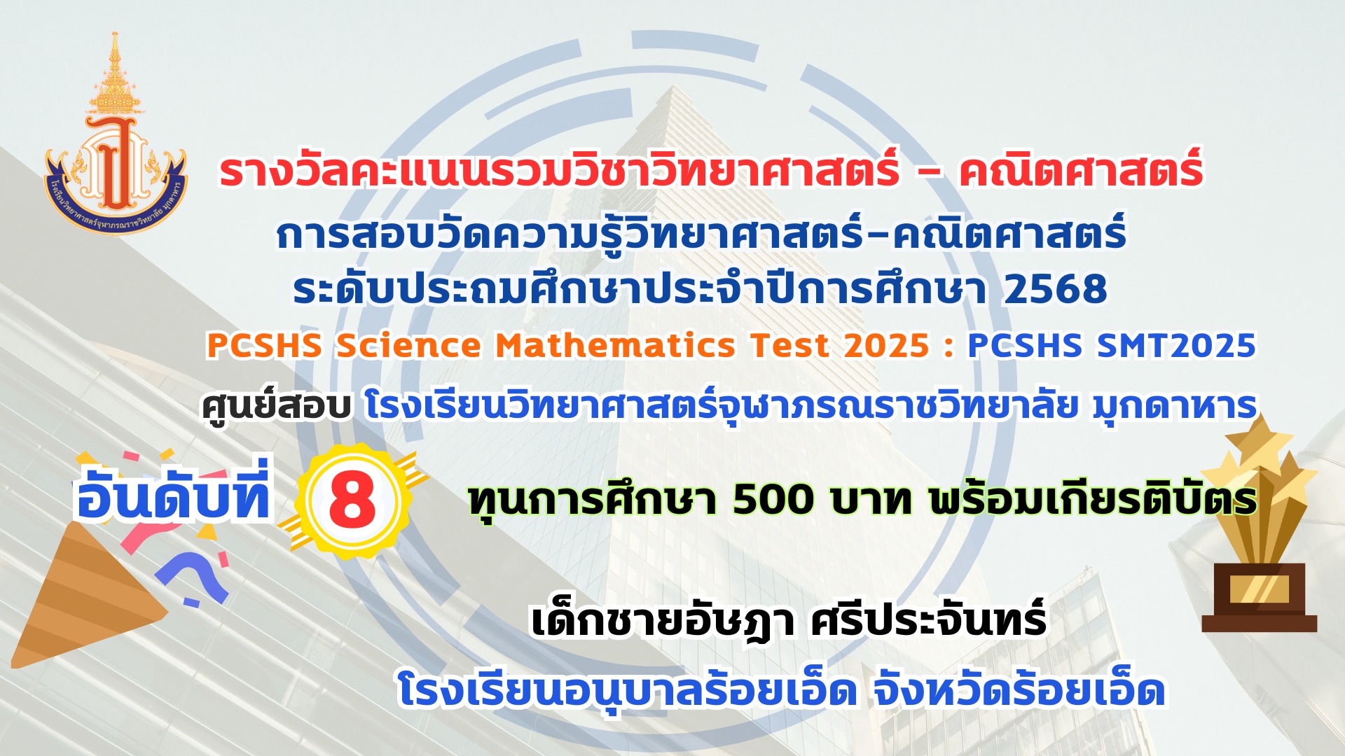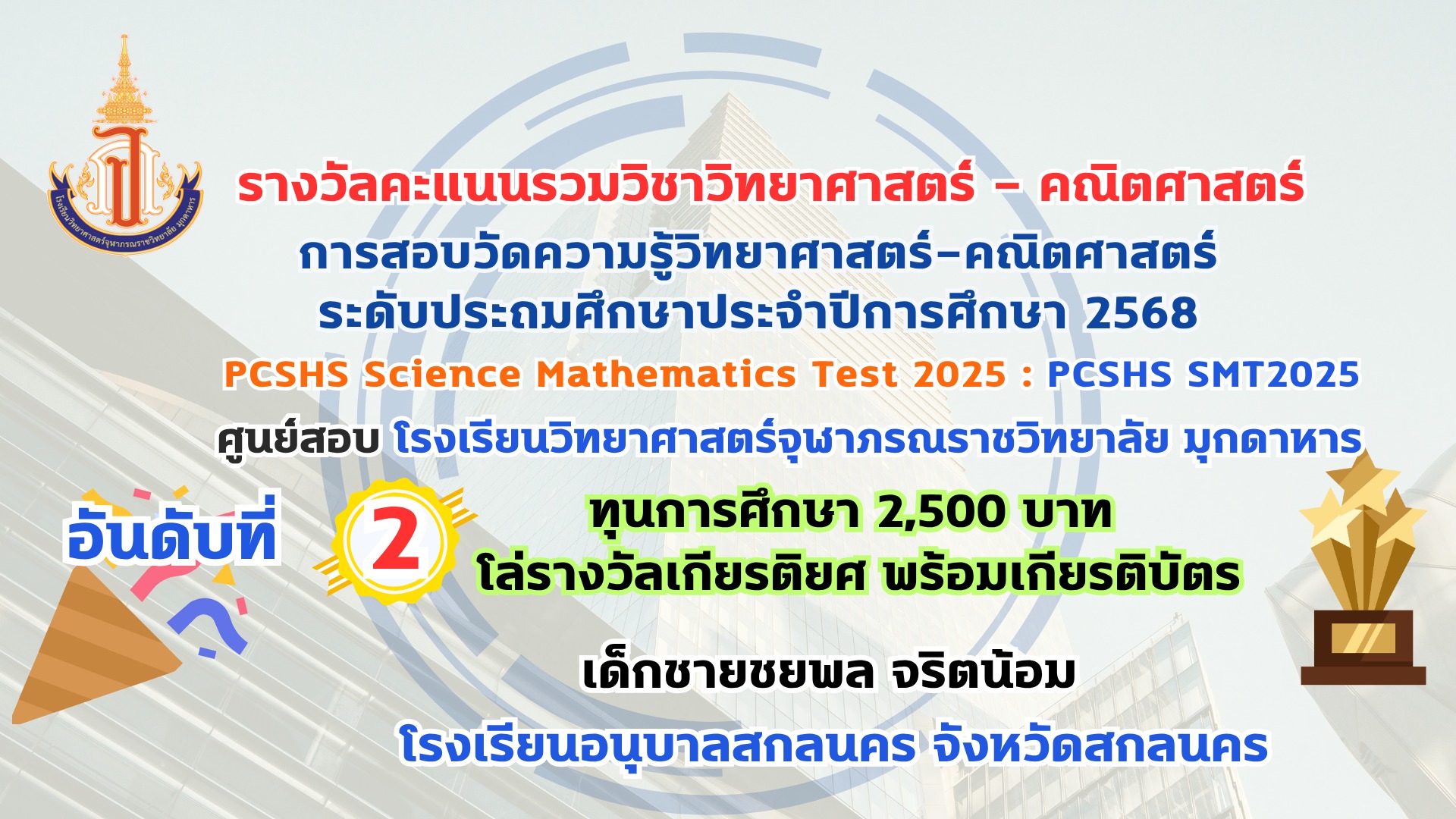 โรงเรียนวิทยาศาสตร์จุฬาภรณราชวิทยาลัย มุกดาหาร ประกาศผลรางวัลการสอบวัดความรู้วิทยาศาสตร์-คณิตศาสตร์ ระดับประถมศึกษา ประจำปีการศึกษา 2568 PCSHS Science Mathematics Test 2025 : PCSHS SMT2025 ศูนย์สอบ โรงเรียนวิทยาศาสตร์จุฬาภรณราชวิทยาลัย มุกดาหาร สามารถเข้าระบบดูผลคะแนนการสอบได้ที่ https://smt.pcshs.ac.th ตั้งแต่วันที่ 18 กรกฏาคม - 31 สิงหาคม 2568 เท่านั้น