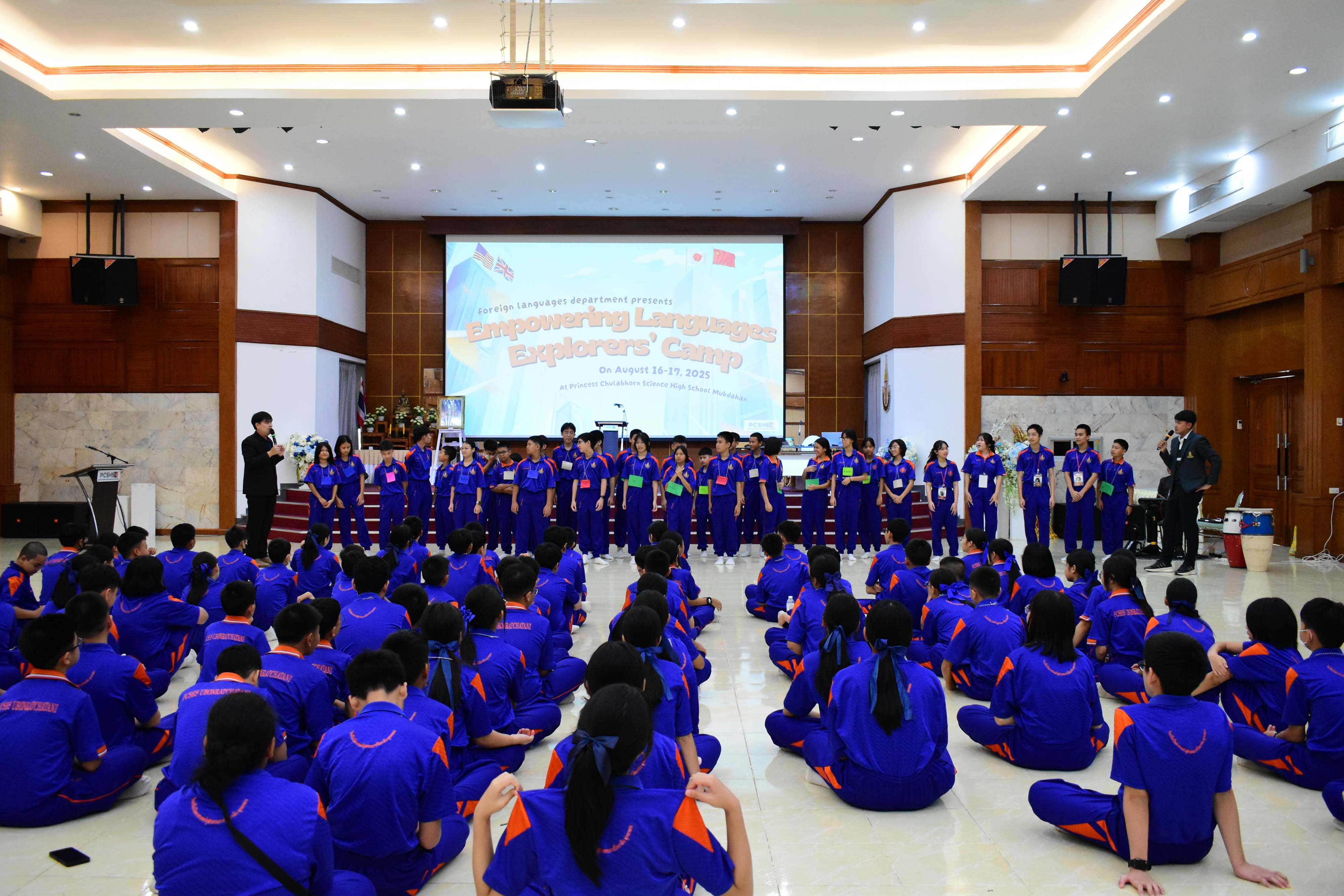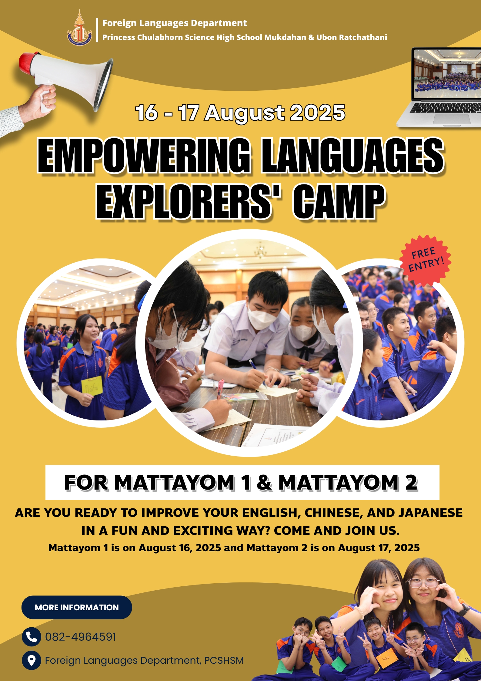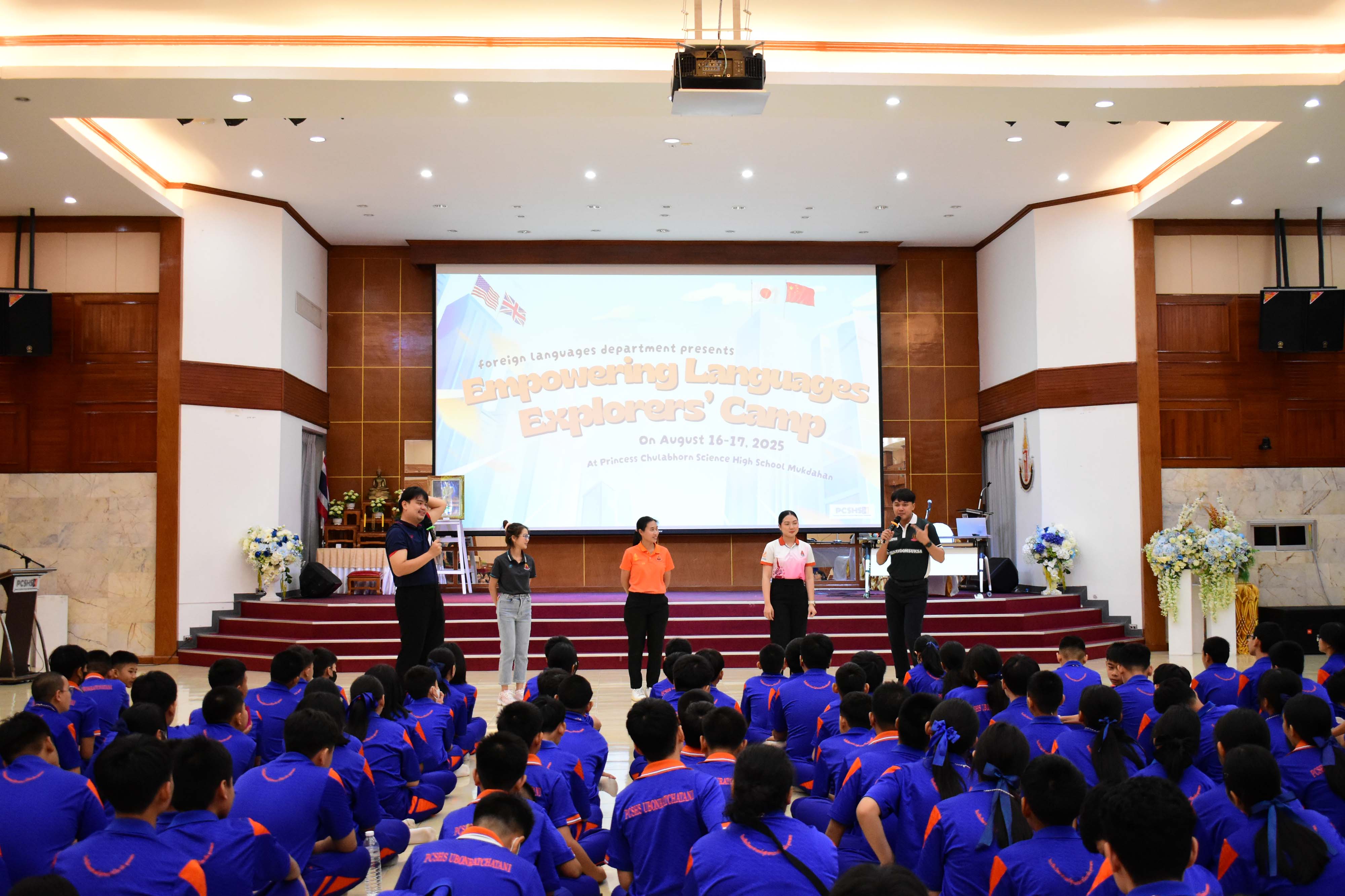 กลุ่มสาระการเรียนรู้ภาษาต่างประเทศ โรงเรียนวิทยาศาสตร์จุฬาภรณราชวิทยาลัย มุกดาหาร จัดกิจกรรม Empowering Languages Explorers Camp เพื่อพัฒนาทักษะการสื่อสารและสร้างทัศนคติที่ดีต่อภาษาอังกฤษ ภาษาจีน และภาษาญี่ปุ่นของนักเรียนชั้นมัธยมศึกษาปีที่ 1 และมัธยมศึกษาปีที่ 2 จากคณะวิทยากร ในระหว่างวันที่ 16 - 17 สิงหาคม 2568