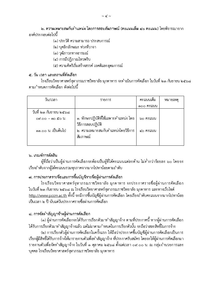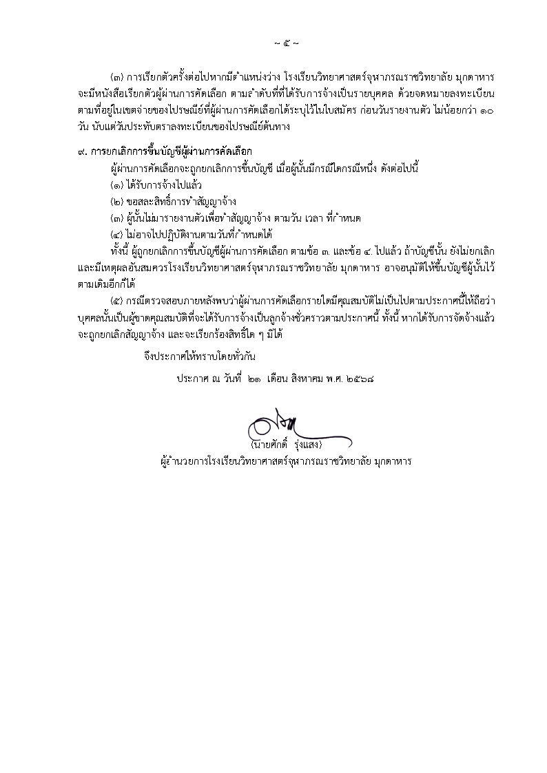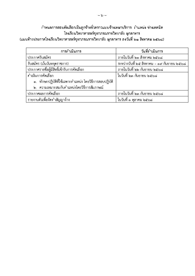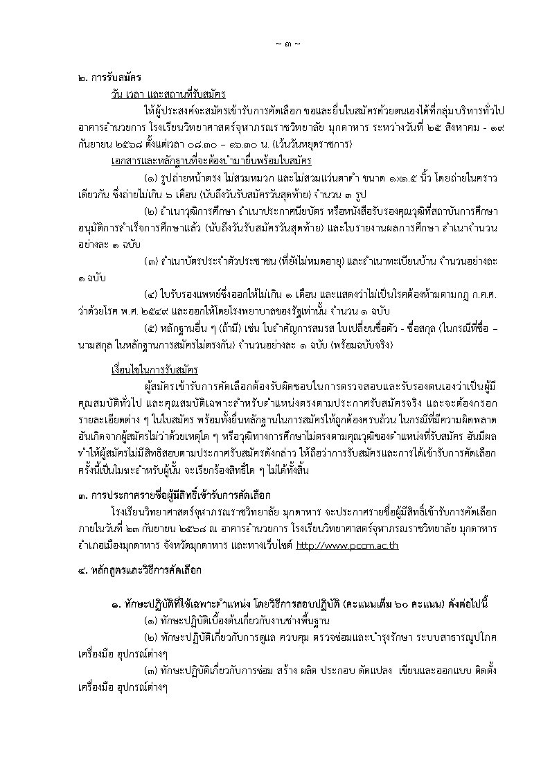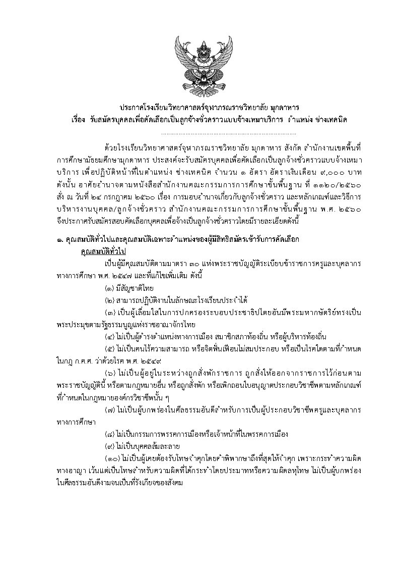 ประกาศรับสมัครบุคคลเพื่อคัดเลือกเป็นลูกจ้างชั่วคราวแบบจ้างเหมาบริการ ตำแหน่งช่างเทคนิค จำนวน ๑ อัตรา อัตราเงินเดือน 9,000 บาท สำเร็จการศึกษาระดับชั้นมัธยมศึกษาตอนปลาย(ม.6) หรือผู้สำเร็จการศึกษาในระดับประกาศนียบัตรวิชาชีพ (ปวช.) หรือเทียบเท่าไม่ต่ำกว่านี้ขึ้นไปทุกสาขาวิชา ยื่นใบสมัครด้วยตนเองได้ที่กลุ่มบริหารทั่วไป อาคารอำนวยการ โรงเรียนวิทยาศาสตร์จุฬาภรณราชวิทยาลัย มุกดาหาร ระหว่างวันที่ 25 สิงหาคม - 19กันยายน 2568 ตั้งแต่เวลา 08.30 – 16.30 น. (เว้นวันหยุดราชการ) ประกาศรายชื่อผู้มีสิทธิ์เข้ารับการคัดเลือก ภายในวันที่ 23 กันยายน 2568
