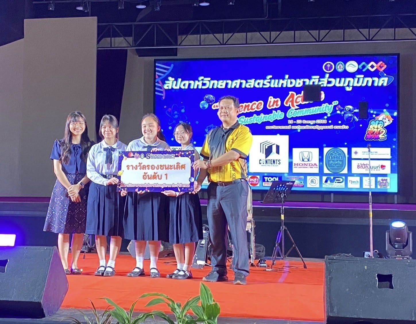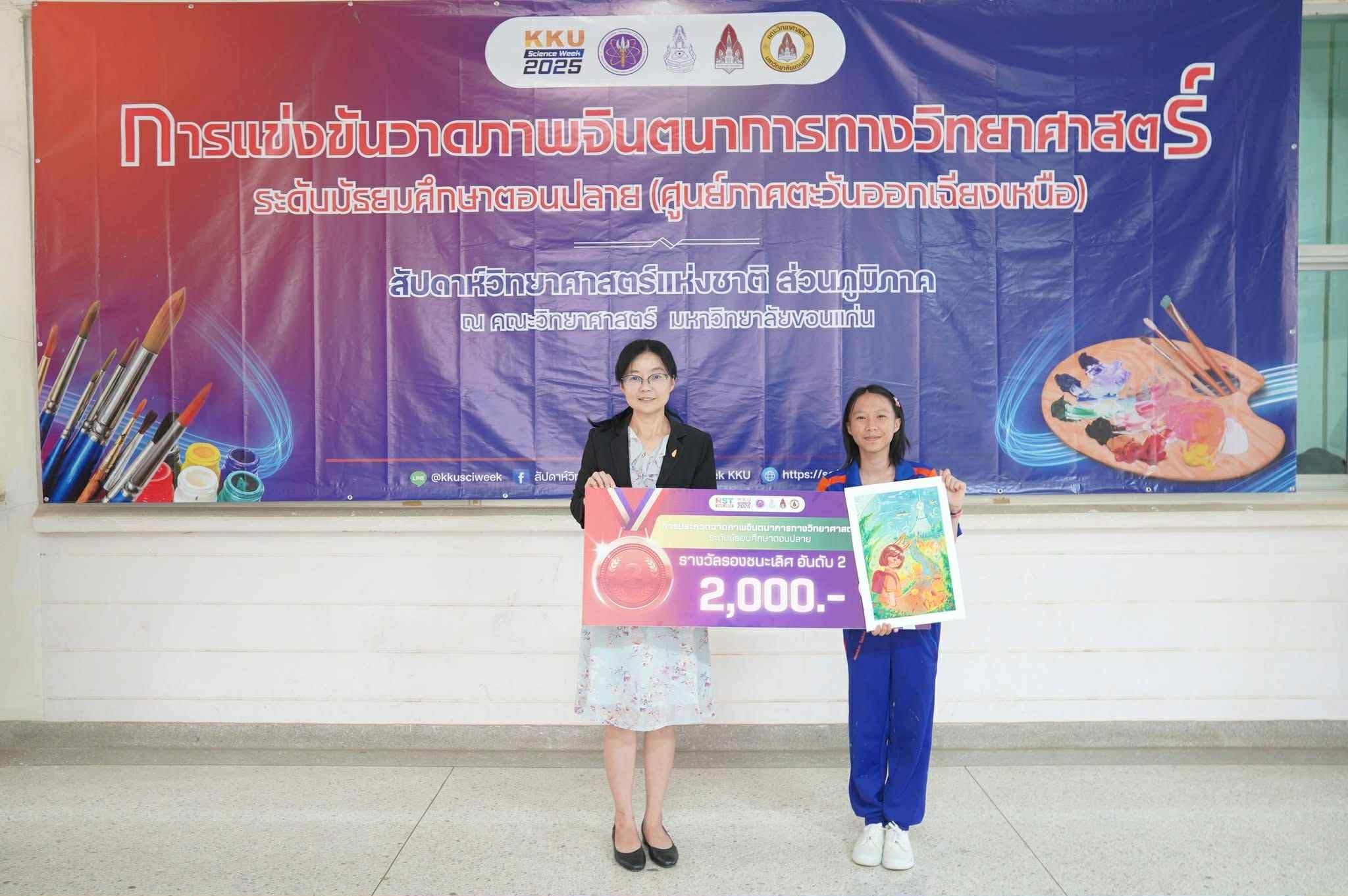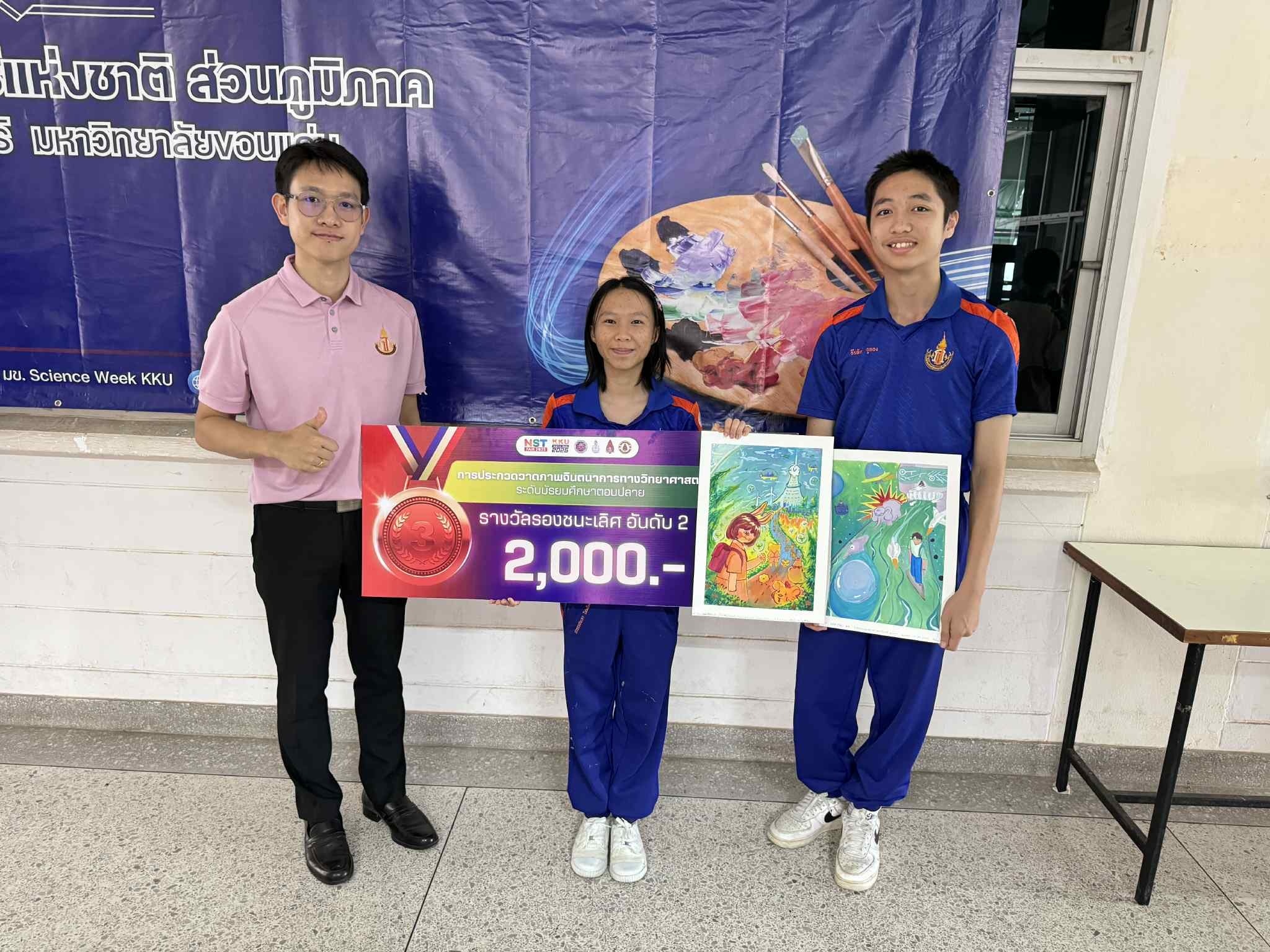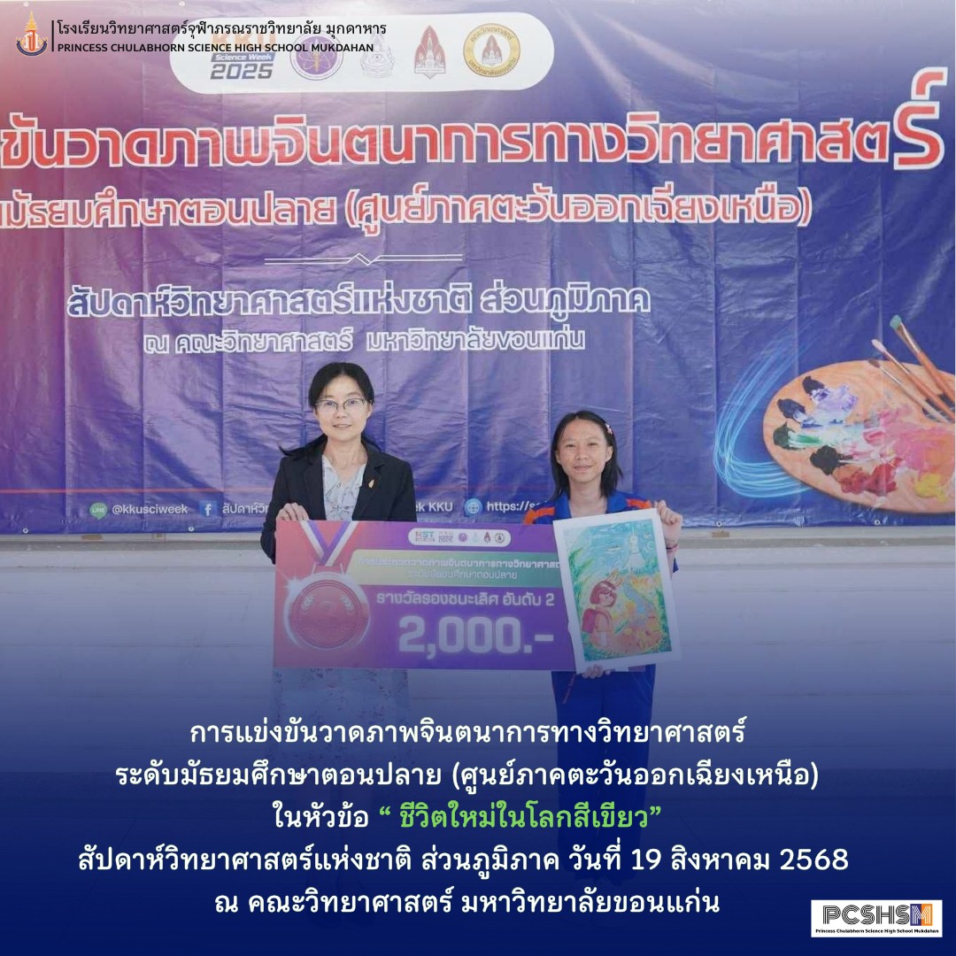 ผู้พัฒนางาน 1. ด.ญ.ณัชชา รังคะราษฎร์ 2.ด.ญ.ภัทรียา ดวงสมสา 3. ด.ช.อริยพงษ์ โกศลกิตติอัมพร อาจารย์ที่ปรึกษา นายธีระวุฒิ จันทะพันธ์ นางสาวจินดา โพนะทา นางสาวกนกพร ปูคะธรรม - รางวัลรองชนะเลิศอันดับ 2 แสดงความยินดีกับนางสาวปวรรณประภา โสมอินทร์ ชั้น ม.6/5 การแข่งขันวาดภาพจินตนาการทางวิทยาศาสตร์ ระดับมัธยมศึกษาตอนปลาย (ศูนย์ภาคตะวันออกเฉียงเหนือ) ในหัวข้อ ชีวิตใหม่ในโลกสีเขียว สัปดาห์วิทยาศาสตร์แห่งชาติ ส่วนภูมิภาค วันที่ 19 สิงหาคม 2568 ณ คณะวิทยาศาสตร์ มหาวิทยาลัยขอนแก่น