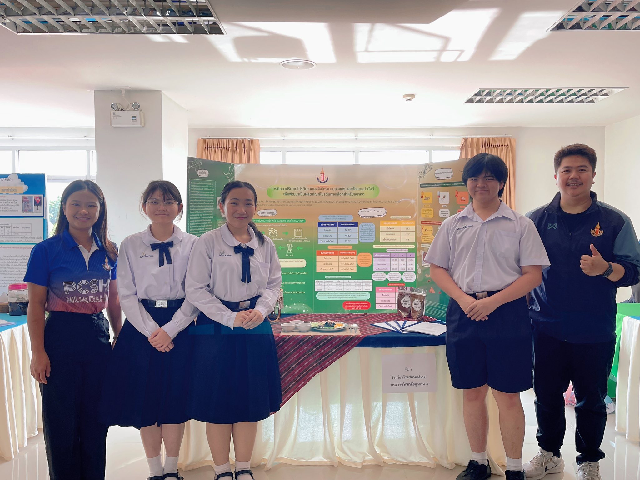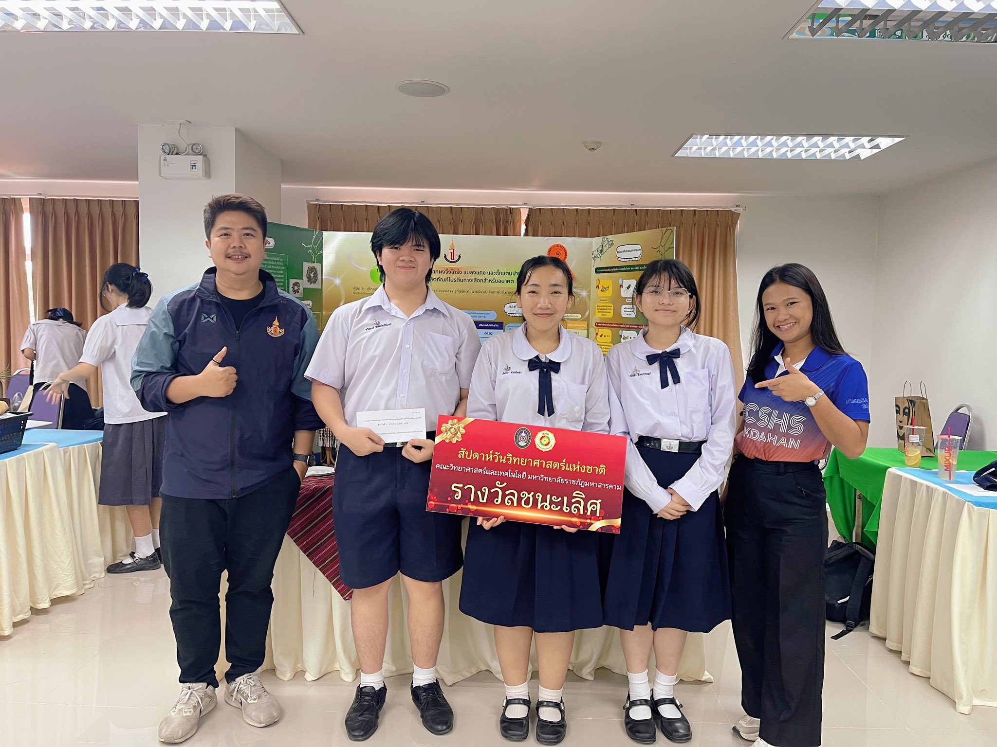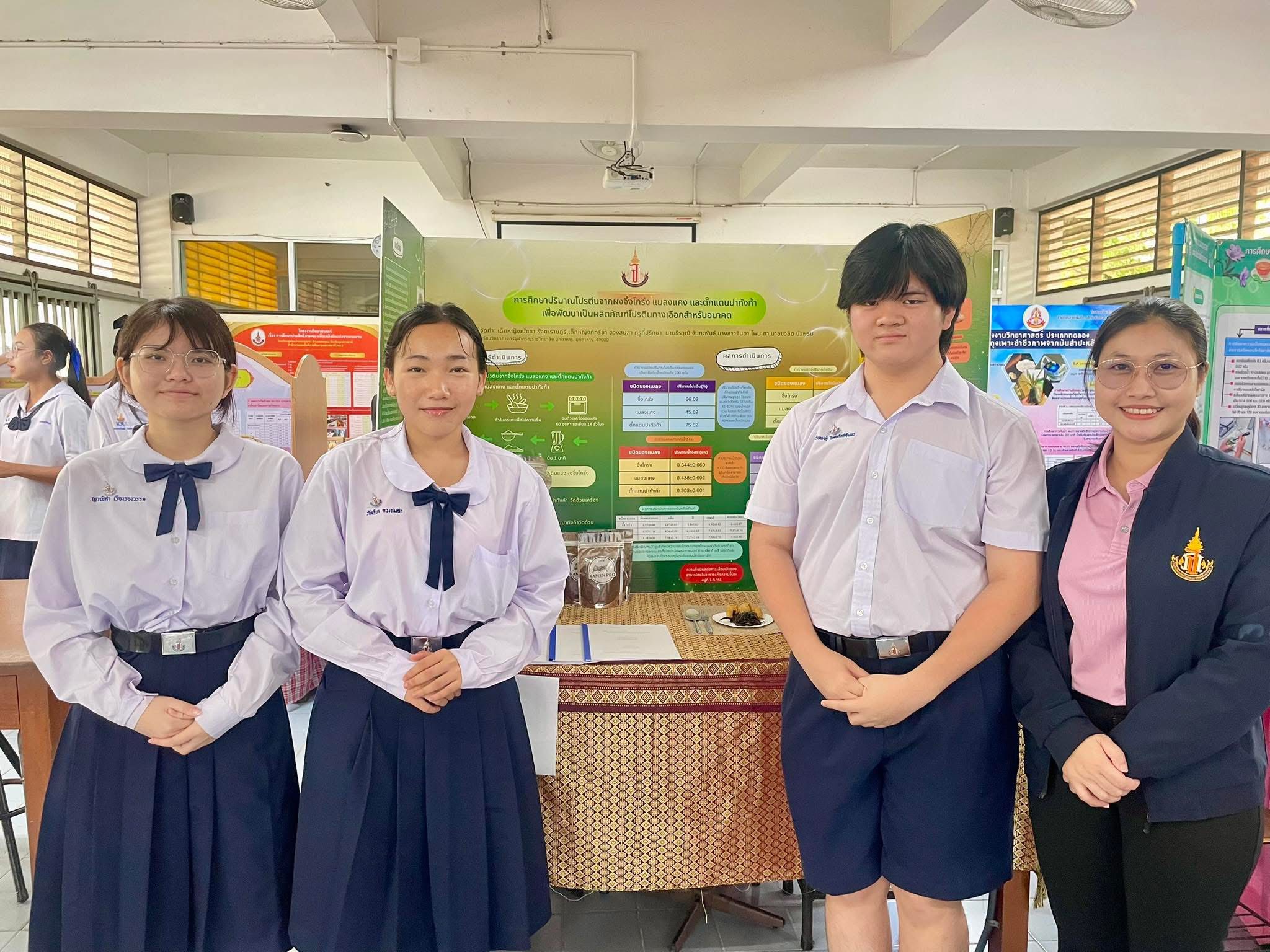 - รางวัลชนะเลิศ การประกวดโครงงานวิทยาศาสตร์ ระดับ ม.ต้น เนื่องในงาน สัปดาห์วันวิทยาศาสตร์ ประจำปี 2568 วันที่ 21 สิงหาคม 2568 ณ มหาวิทยาลัยราชภัฏมหาสารคาม โดยมีรายละเอียด ดังนี้ รางวัลชนะเลิศ ชื่อโครงงานวิทยาศาสตร์ การศึกษาปริมาณโปรตีนจากผงจิ้งโกร่ง แมลงแคง และตั๊กแตน เพื่อพัฒนาเป็นผลิตภัณฑ์โปรตีนทางเลือกสำหรับอนาคต ผู้พัฒนางาน 1. ด.ญ.ณัชชา รังคะราษฎร์ 2.ด.ญ.ภัทรียา ดวงสมสา 3. ด.ช.อริยพงษ์ โกศลกิตติอัมพร อาจารย์ที่ปรึกษา นายธีระวุฒิ จันทะพันธ์ นางสาวจินดา โพนะทา