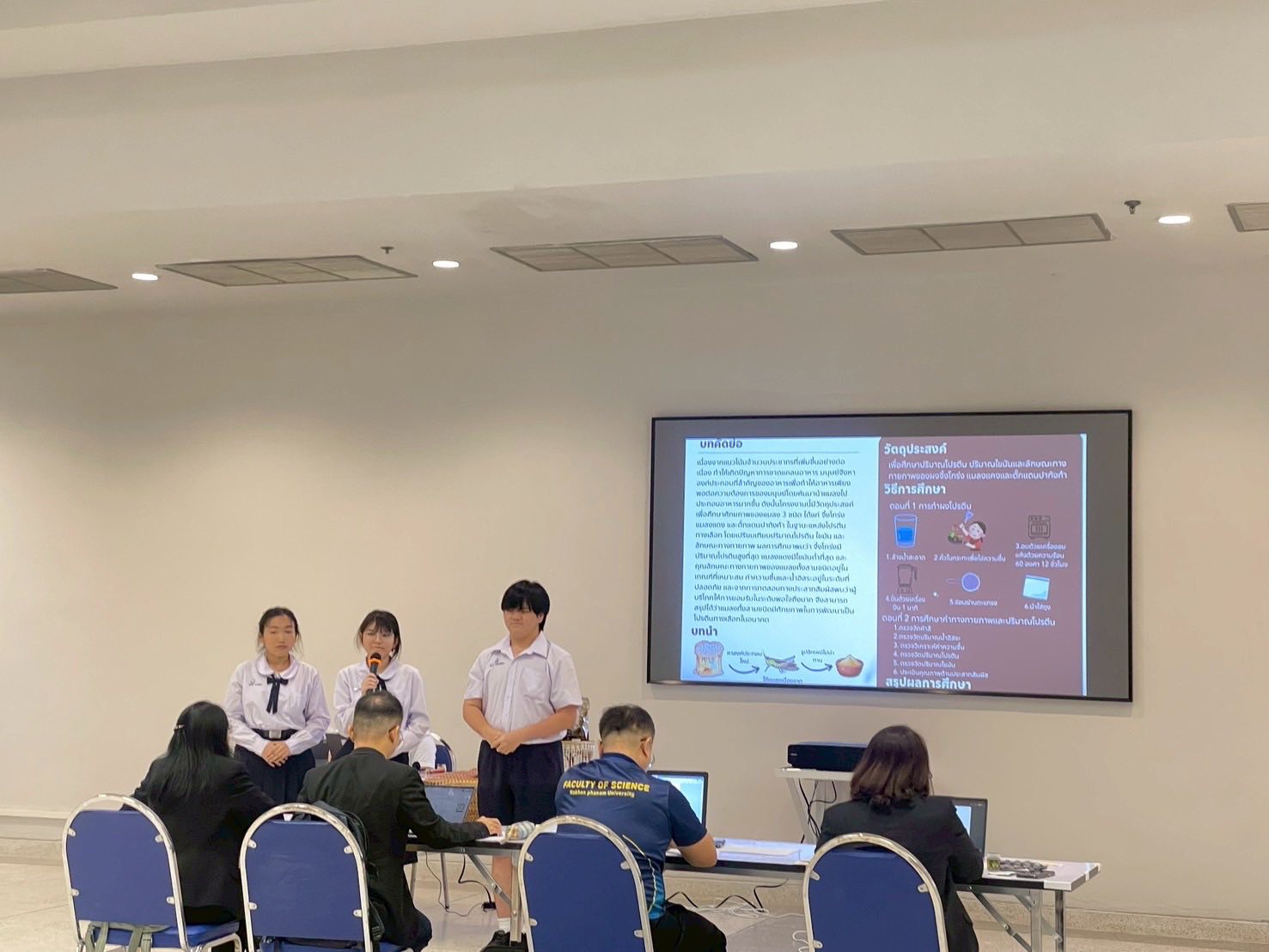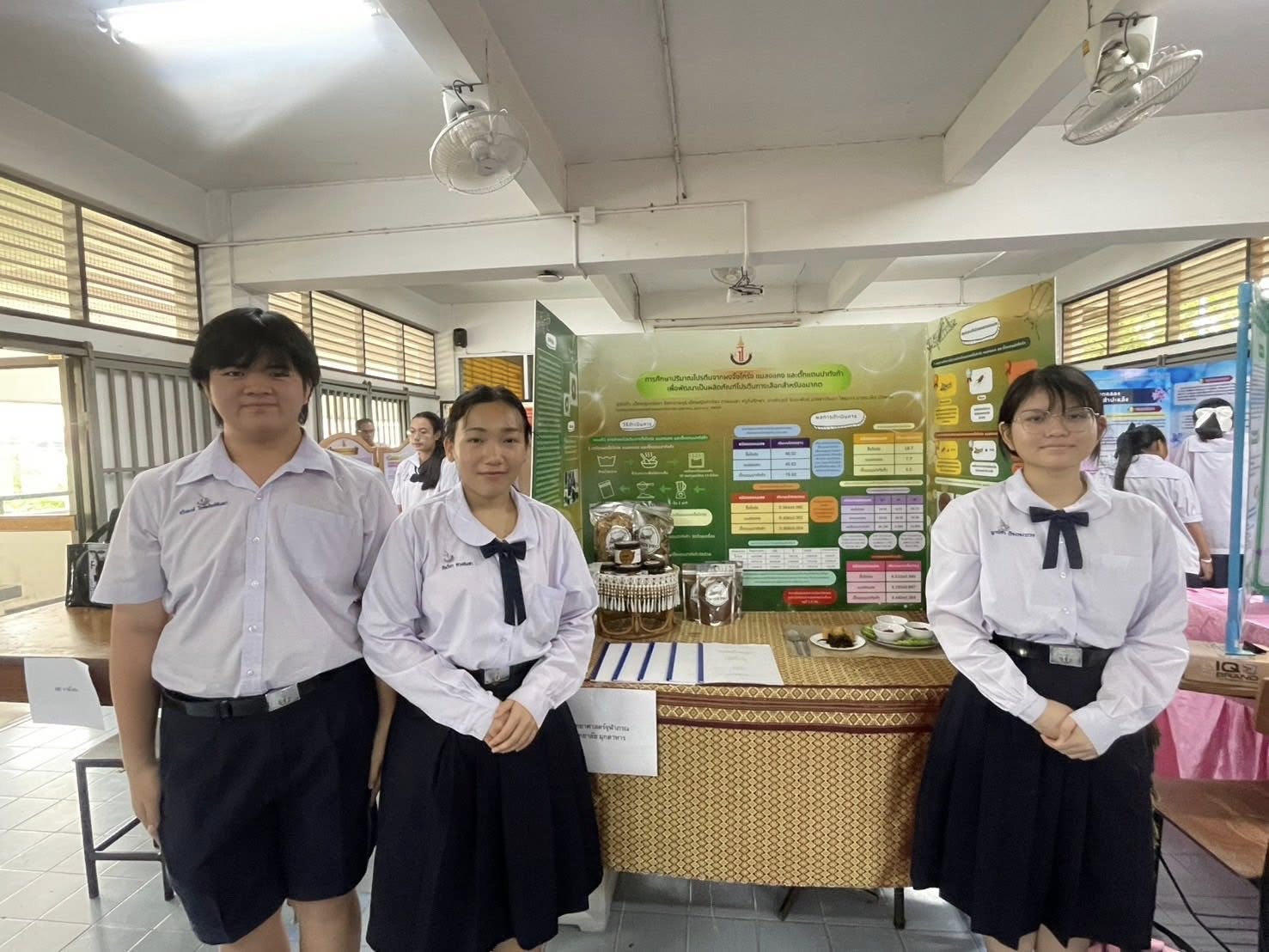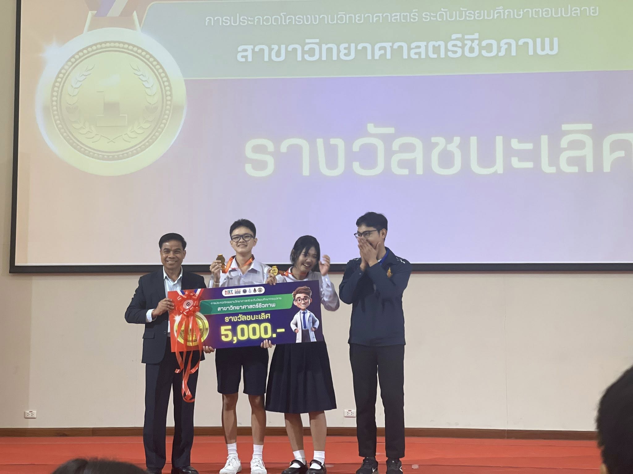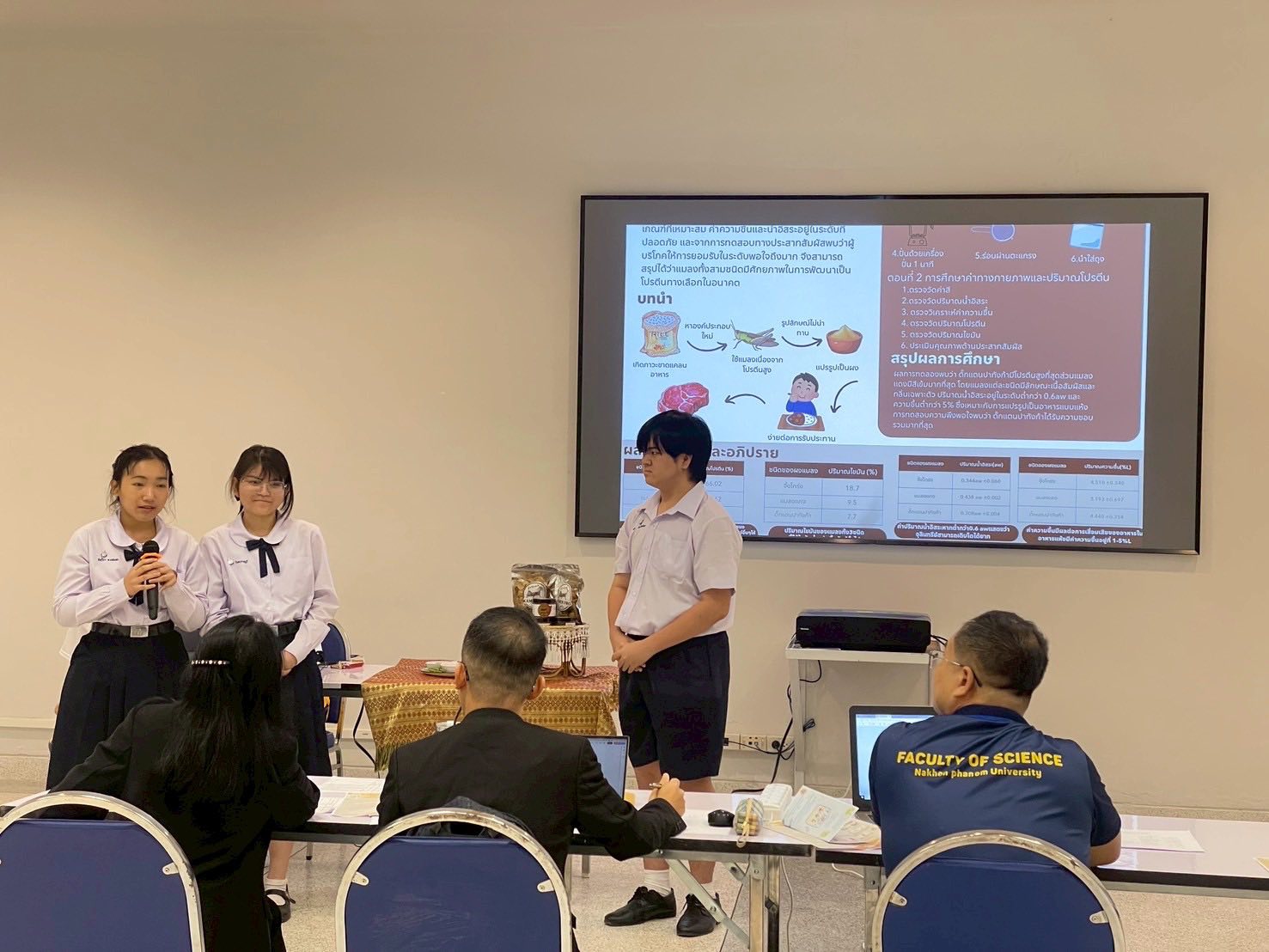 - รางวัลชนะเลิศ การประกวดโครงงานวิทยาศาสตร์ ระดับ ม.ต้น เนื่องในงาน สัปดาห์วันวิทยาศาสตร์ ประจำปี 2568 วันที่ 21 สิงหาคม 2568 ณ มหาวิทยาลัยราชภัฏมหาสารคาม โดยมีรายละเอียด ดังนี้ รางวัลชนะเลิศ ชื่อโครงงานวิทยาศาสตร์ การศึกษาปริมาณโปรตีนจากผงจิ้งโกร่ง แมลงแคง และตั๊กแตน เพื่อพัฒนาเป็นผลิตภัณฑ์โปรตีนทางเลือกสำหรับอนาคต ผู้พัฒนางาน 1. ด.ญ.ณัชชา รังคะราษฎร์ 2.ด.ญ.ภัทรียา ดวงสมสา 3. ด.ช.อริยพงษ์ โกศลกิตติอัมพร อาจารย์ที่ปรึกษา นายธีระวุฒิ จันทะพันธ์ นางสาวจินดา โพนะทา