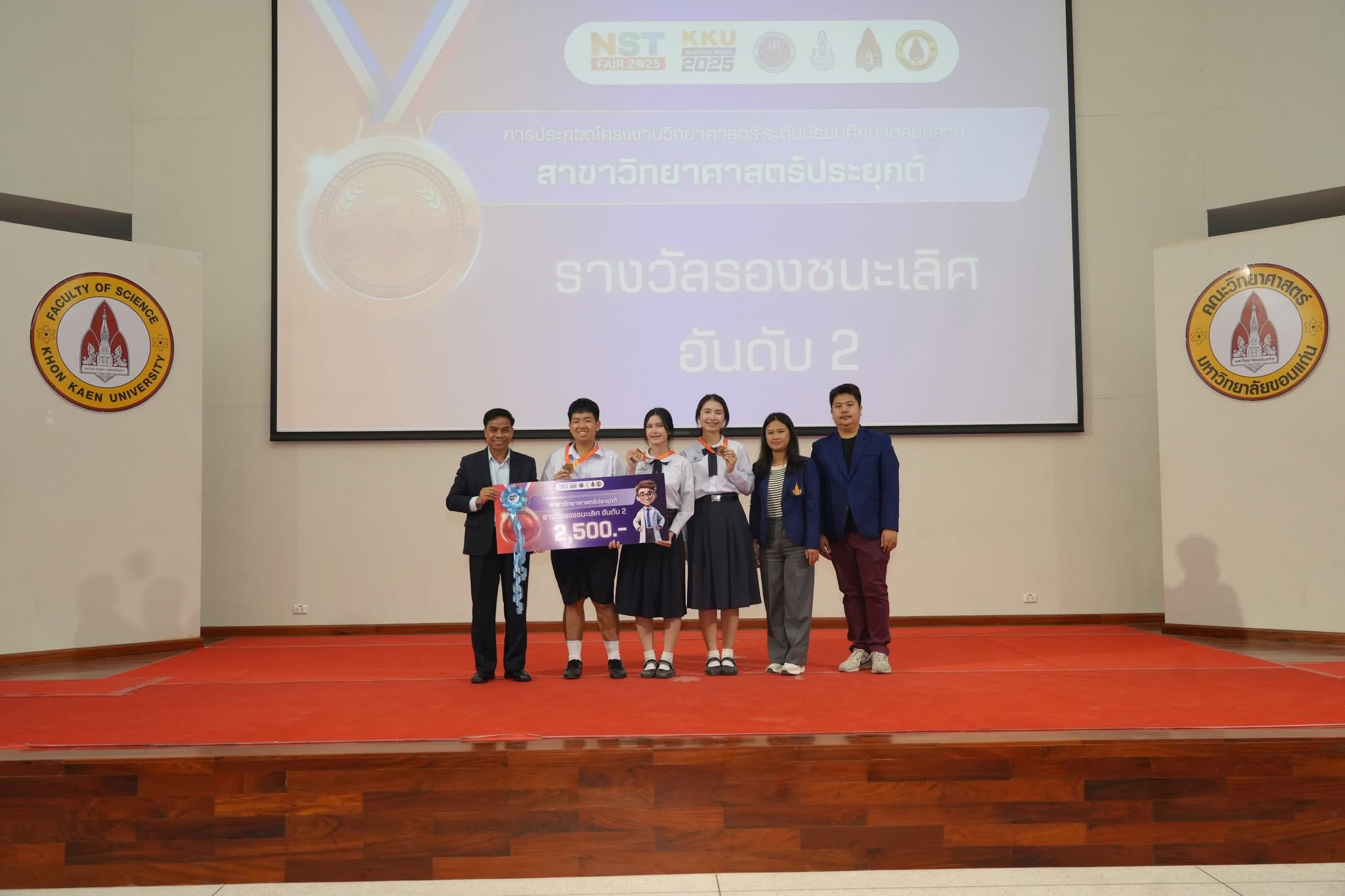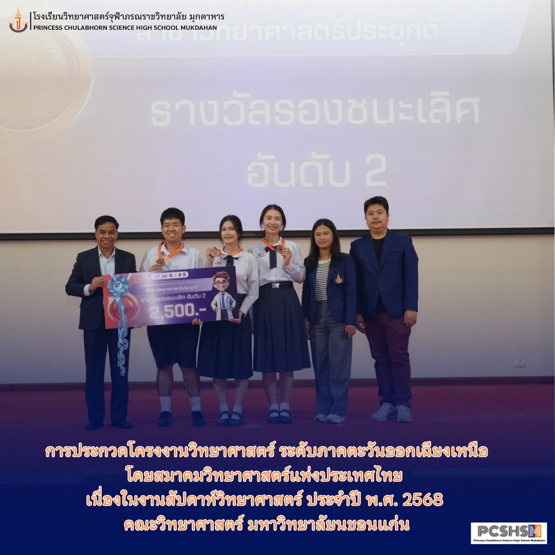- รางวัลเหรียญทอง รางวัลจากการประกวดโครงงานวิทยาศาสตร์ ระดับภาคตะวันออกเฉียงเหนือ โดยสมาคมวิทยาศาสตร์แห่งประเทศไทย เนื่องในงานสัปดาห์วิทยาศาสตร์ ประจำปี พ.ศ. 2568 คณะวิทยาศาสตร์ มหาวิทยาลัยนขอนแก่น ซึ่งในการเข้าร่วมแข่งขันครั้งนี้เพื่อให้นักเรียนมีการแสดงออกซึ่งความคิดริเริ่มสร้างสรรค์ การมีจิตวิญญาณของความเป็นนักวิจัย นักประดิษฐ์ คิดค้น และนักพัฒนาด้านคณิตศาสตร์ วิทยาศาสตร์และเทคโนโลยีในระดับเดียวกันกับนักเรียนวิทยาศาสตร์ชั้นนำของนานาชาติได้รับรางวัล ดังนี้ รางวัลเหรียญทอง สาขาชีวภาพ โครงงานเรื่อง การเพิ่มปริมาณเเป้งทนย่อยในข้าวเหนียวด้วยเอนไซม์สกัดหยาบจากมะม่วงน้ำดอกไม้ร่วมกับการนึ่ง ผู้พัฒนางาน นายปัณณทัต สมสุข นางสาววิยะดา บุญเรือง ครูที่ปรึกษา นายวิระพงษ์ คันธะมาลา นางสาวพัชราภรณ์ วิชาสาร อ.ดร.ศุภวิชญ์ อุทัยวัฒน์ รางวัลเหรียญทองแดง สาขาวิทยาศาสตร์ประยุกต์ โครงงานเรื่อง การพัฒนาเซ็นเซอร์กระดาษในการตรวจวัดไมโครอัลบูมินในน้ําปัสสาวะโดยใช้กระดาษไมโครฟลูอิดิกร่วมกับการวิเคราะห์ด้วย Image processing เพื่อประยุกต์เป็นแอพพลิเคชั่น สําหรับวินิจฉัยโรคไตเรื้อรังเบื้องต้น จัดทำโดย นางสาวเบญญาภา ปลายเนตร นางสาวปิ่นมุก พจนา นายกรวิชญ์ พรมวัง ครูที่ปรึกษา นายธีระวุฒิ จันทะพันธ์ นางสาวจินดา โพนะทา