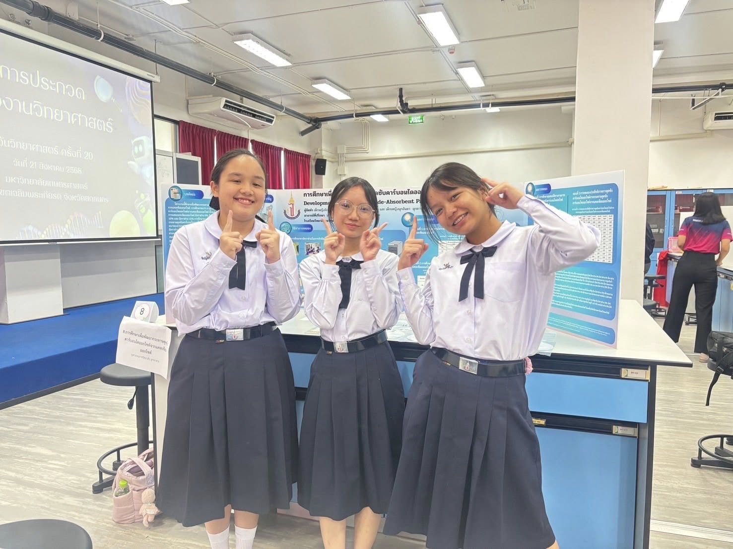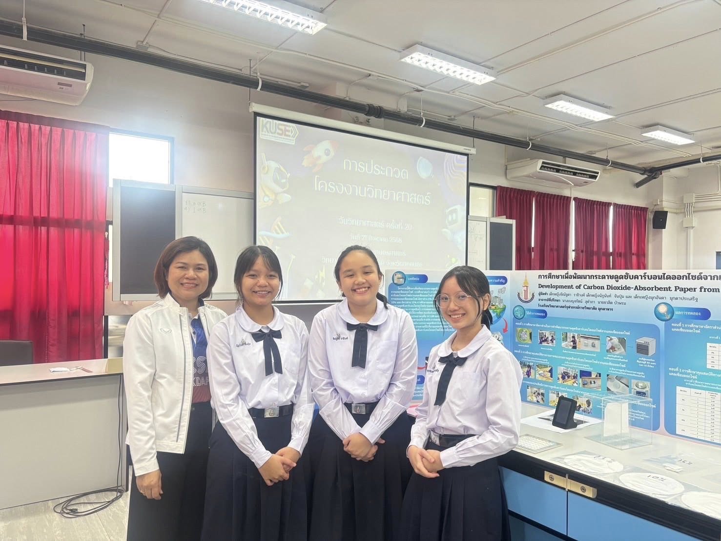 - รางวัลระดับเหรียญเงิน การประกวดโครงงานวิทยาศาสตร์ ประเภทประเภทสิ่งประดิษฐ์/ผลิตภัณฑ์ ระดับมัธยมศึกษาตอนต้น วันที่ 21 สิงหาคม 2568 ณ มหาวิทยาลัยเกษตรศาสตร์ วิทยาเขตเฉลิมพระเกียรติ จังหวัดสกลนคร โดยมีรายละเอียด ดังนี้ ระดับเหรียญเงิน ชื่อโครงงานวิทยาศาสตร์ การศึกษาเพื่อพัฒนากระดาษดูดซับคาร์บอนไดออกไซด์จากแคลเซียมออกไซด์ ผู้พัฒนางาน 1.เด็กหญิงจิณัฐตา ราชิวงศ์ 2.เด็กหญิงนัฏนันท์ จันปุ่ม 3.เด็กเหญิงมุกอันดา มุกดาประเสริฐ อาจารย์ที่ปรึกษา นางเบญจรัตน์ สุคำภา นายชวลิต บัวพรม นางสาวจิรวรรณ สุทธิประภา