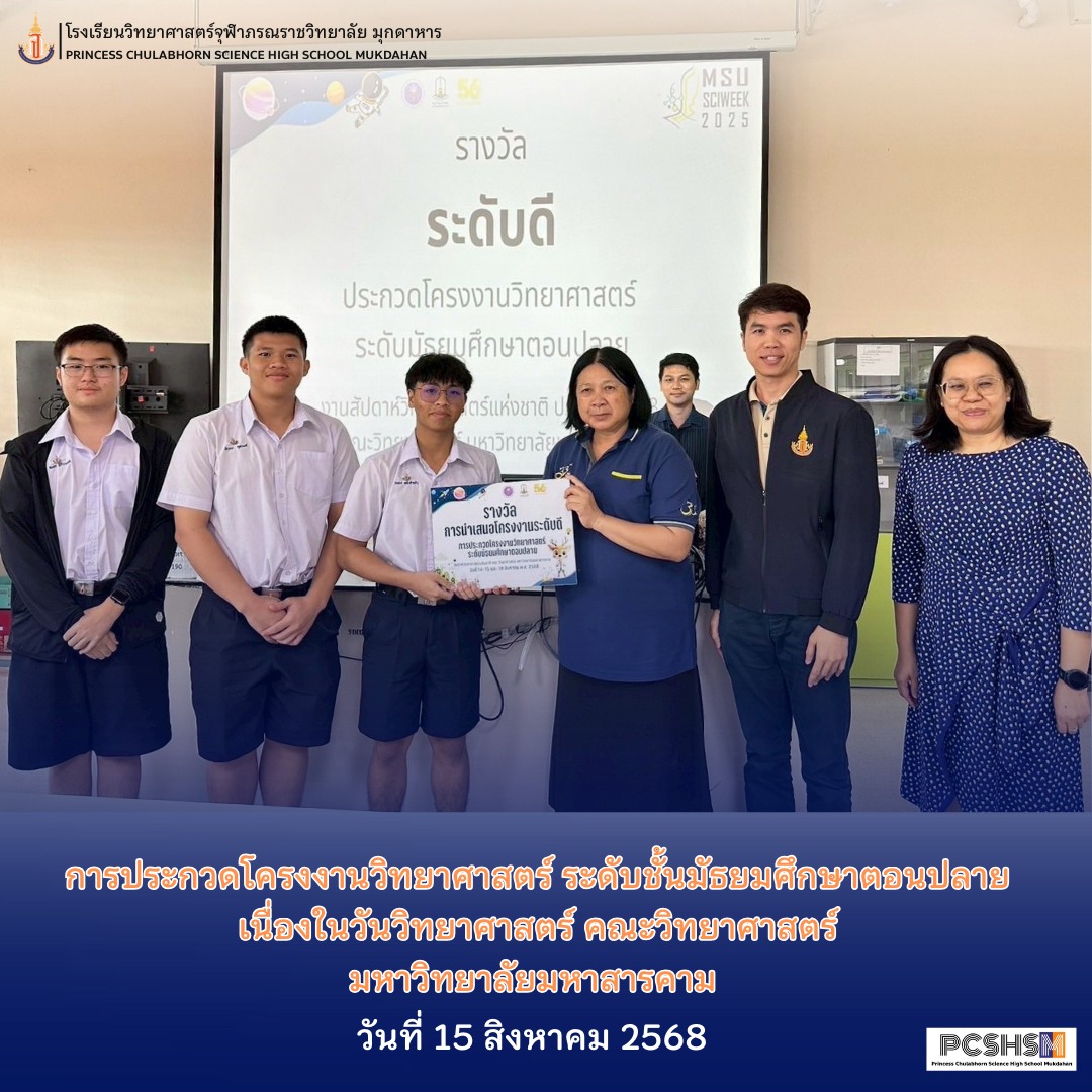 - รางวัลการเสนอโครงงานระดับดี ในการประกวดโครงงานวิทยาศาสตร์ ระดับชั้นมัธยมศึกษาตอนปลาย เนื่องในวันวิทยาศาสตร์ คณะวิทยาศาสตร์ มหาวิทยาลัยมหาสารคาม เมื่อวันที่ 15 สิงหาคม 2568 ซึ่งในการเข้าร่วมแข่งขันครั้งนี้เพื่อให้นักเรียนมีการแสดงออกซึ่งความคิดริเริ่มสร้างสรรค์ การมีจิตวิญญาณของความเป็นนักวิจัย นักประดิษฐ์ คิดค้น และนักพัฒนาด้านคณิตศาสตร์ วิทยาศาสตร์และเทคโนโลยีในระดับเดียวกันกับนักเรียนวิทยาศาสตร์ชั้นนำของนานาชาติ โดยมีรายละเอียด ดังนี้ รางวัลการเสนอโครงงานระดับดี โครงงาน เรื่อง การพัฒนาระบบตรวจจับและนับไข่ไหมด้วยเทคนิคการเรียนรู้เชิงลึกและการประยุกต์ใช้งานผ่านแพลตฟอร์ม Line Chatbot ผู้พัฒนางาน นายศิวกร กุลวงค์