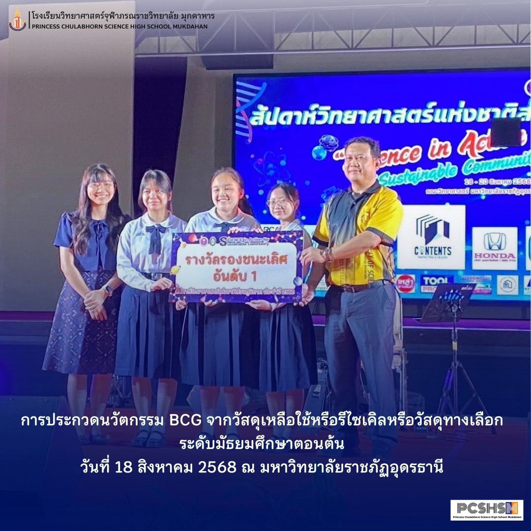 - รางวัลรองชนะเลิศอันดับ1 การประกวดนวัตกรรม BCG จากวัสดุเหลือใช้หรือรีไซเคิลหรือวัสดุทางเลือก ระดับมัธยมศึกษาตอนต้น วันที่ 18 สิงหาคม 2568 ณ มหาวิทยาลัยราชภัฏอุดรธานี การเข้าร่วมแข่งขันครั้งนี้เพื่อให้นักเรียนมีการแสดงออกซึ่งความคิดริเริ่มสร้างสรรค์ การมีจิตวิญญาณของความเป็นนักวิจัย นักประดิษฐ์ คิดค้น และนักพัฒนาด้านคณิตศาสตร์ วิทยาศาสตร์และเทคโนโลยีในระดับเดียวกันกับนักเรียนวิทยาศาสตร์ชั้นนำของนานาชาติ โดยมีรายละเอียด ดังนี้ รองชนะเลิศอันดับ 1 ชื่อโครงงานวิทยาศาสตร์ การศึกษาเพื่อพัฒนากระดาษดูดซับคาร์บอนไดออกไซด์จากแคลเซียมออกไซด์ ผู้พัฒนางาน 1.เด็กหญิงจิณัฐตา ราชิวงศ์ 2.เด็กหญิงนัฏนันท์ จันปุ่ม 3.เด็กเหญิงมุกอันดา มุกดาประเสริฐ อาจารย์ที่ปรึกษา นางเบญจรัตน์ สุคำภา นายชวลิต บัวพรม นางสาวจิรวรรณ สุทธิประภา