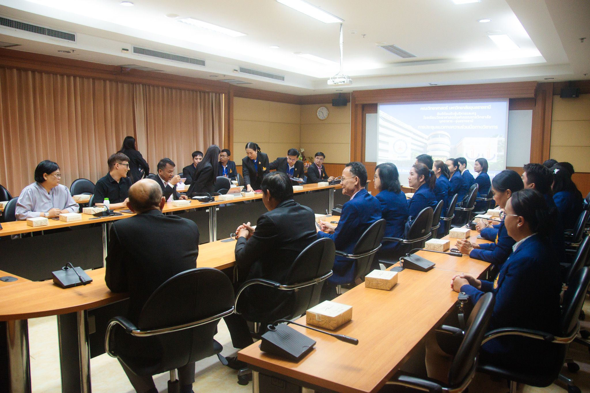 การประชุมเพื่อพัฒนาความร่วมมือทางวิชาการในการพัฒนาศักยภาพของนักเรียนและการยกระดับคุณภาพการจัดการเรียนการสอนระหว่างโรงเรียนวิทยาศาสตร์จุฬาภรณราชวิทยาลัย มุกดาหารและมหาวิทยาลัยอุบลราชธานี ในวันที่ 25 สิงหาคม พ.ศ.2568 เวลา 09.30 น. โรงเรียนวิทยาศาสตร์จุฬาภรณราชวิทยาลัย มุกดาหาร นำโดยท่านผู้อำนวยการศักดิ์ รุ่งแสง คณะท่านรองผู้อำนวยการ หัวหน้ากลุ่มสาระการเรียนรู้ หัวหน้าสาขา และหัวหน้ากลุ่มงานได้เข้าร่วมประชุมเพื่อพัฒนาความร่วมมือทางวิชาการในการพัฒนาศักยภาพของนักเรียนและการยกระดับคุณภาพการจัดการเรียนการสอนของโรงเรียนวิทยาศาสตร์จุฬาภรณราชวิทยาลัย มุกดาหาร กับคณะผู้บริหาและคณาจารย์ คณะวิทยาศาสตร์และคณะวิศวกรรมศาสตร์ มหาวิทยาลัยอุบลราชธานี ณ ห้องประชุมดุสิตา คณะวิทยาศาสตร์ มหาวิทยาลัยอุบลราชธานี และห้องประชุม 6213 คณะวิศวกรรมศาสตร์ มหาวิทยาลัยอุบลราชธานี