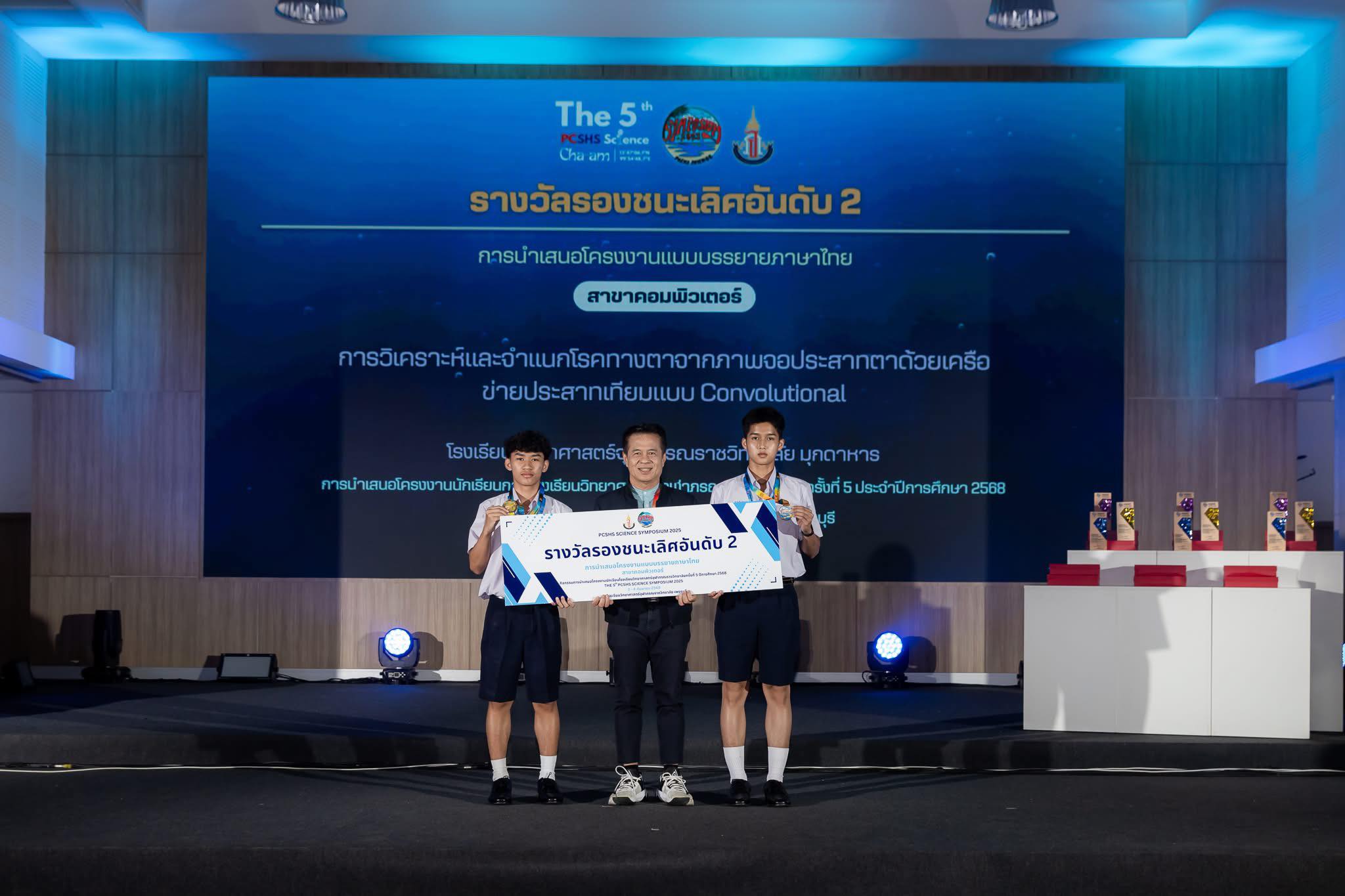 นางสาวพิชญา จันปุ่ม นางสาววรรษชล นวลอินทร์ ครูที่ปรึกษา นายธีระวุฒิ จันทะพันธ์ นางสาวจินดา โพนะทา - รองชนะเลิศอันดับสอง เหรียญทอง Thai Oral Presentation สาขาคอมพิวเตอร์ โครงงานเรื่อง การวิเคราะห์และจําแนกโรคทางตาจากภาพจอประสาทตาด้วยเครือข่ายประสาทเทียมแบบ Convolutional ผู้พัฒนางาน นายผดุงศักดิ์ คำบาง นายพิพัฒน์ นามแสง ครูที่ปรึกษา นางสาวทิพย์อนันต์ โพธะกัน นายอรรจน์ คงทอง